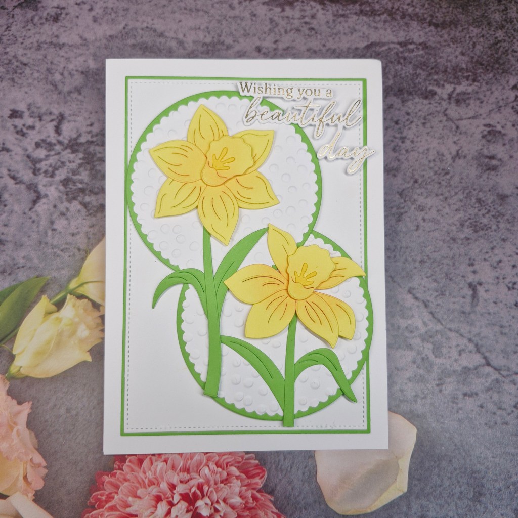 I decided to go with a springtime fell with these daffodils. Having had what seems like months of rain here in the UK, the snowdrops are appearing, and I felt a spring card was needed to encourage brighter weather.