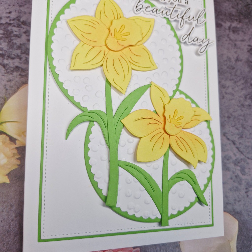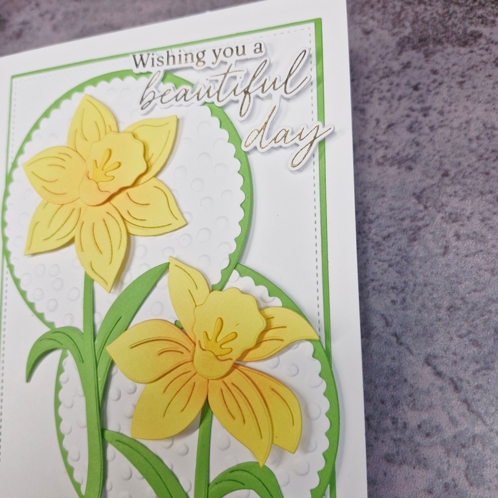 The daffodils are from Hero Arts, die cut and then a little ink blending to the petals before adding the corona, which was attached with 3D foam pieces.