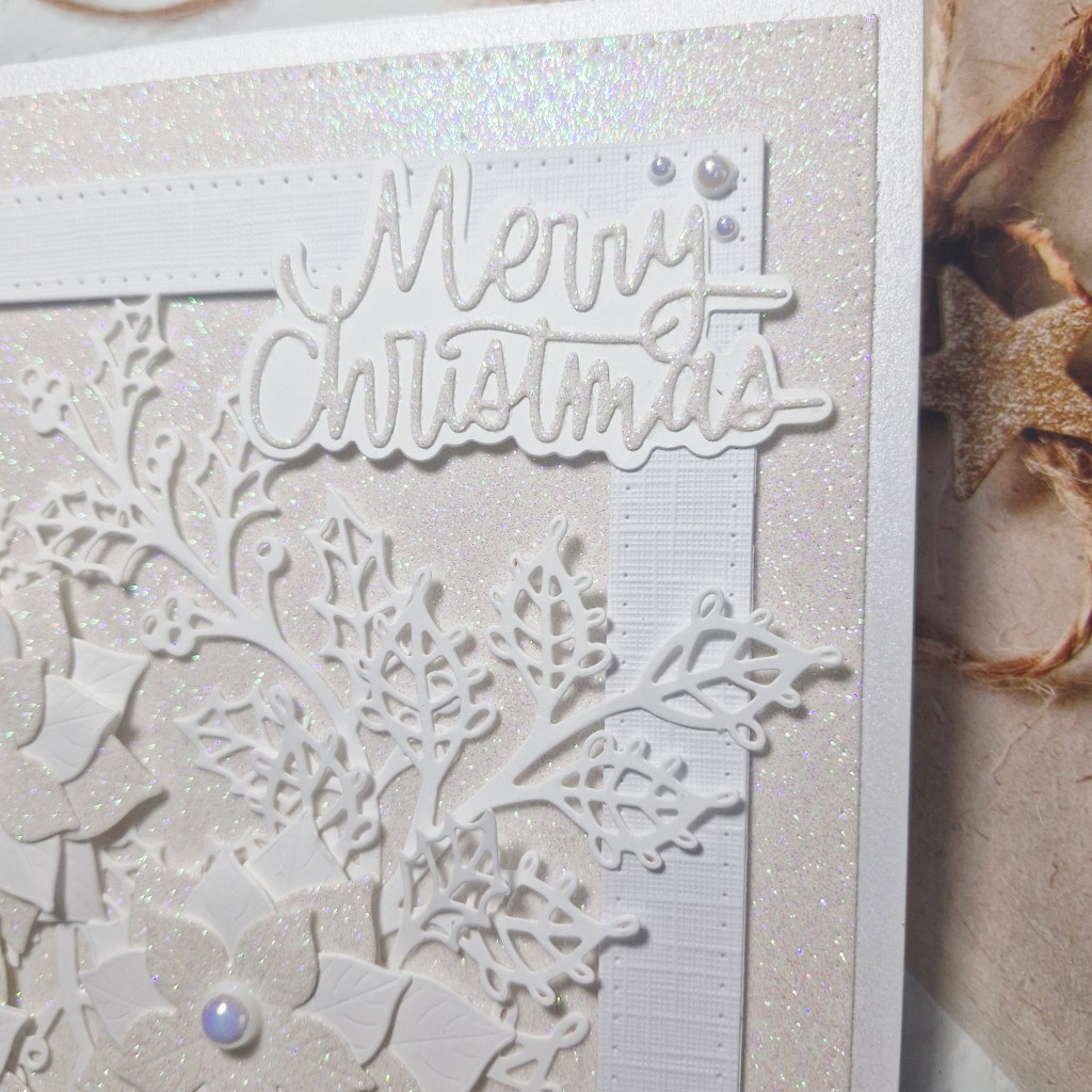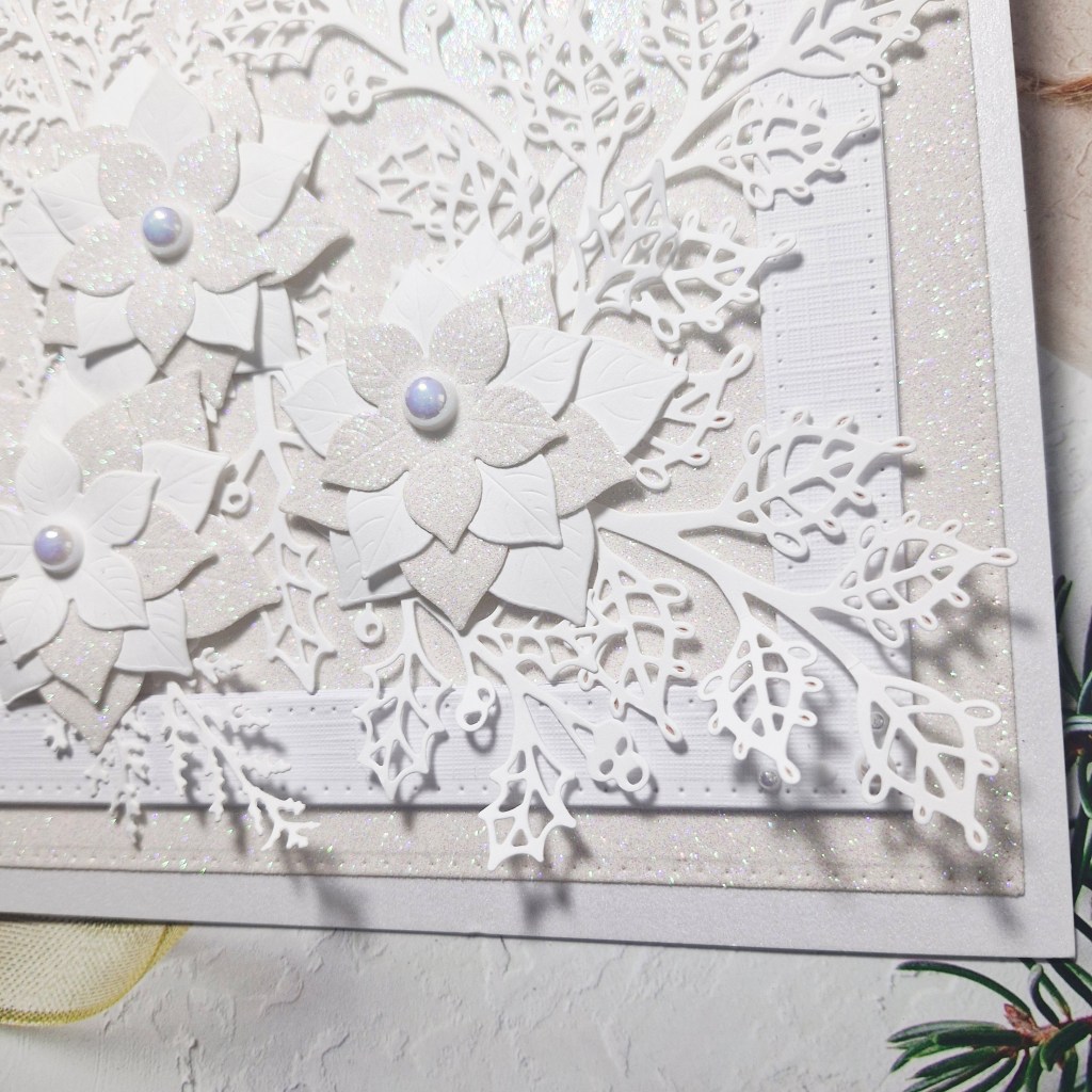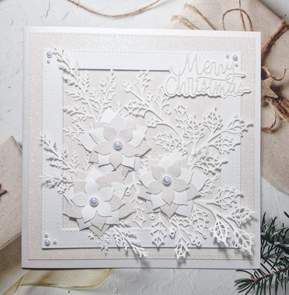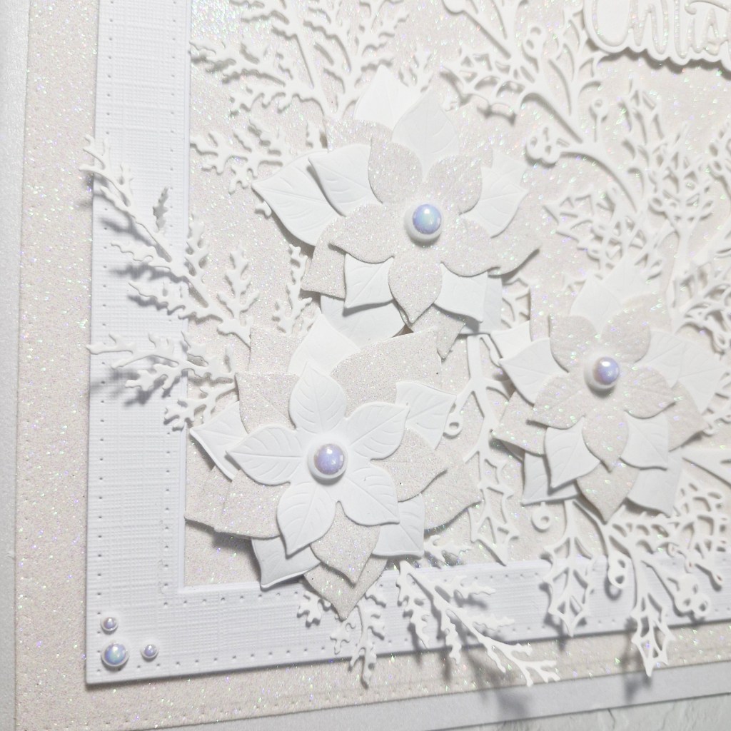 I followed the current theme at 52 CCT – the theme is ‘All white‘. I wanted poinsettia dies – of which I seem to have quite a few – and used Honey Bee Stamps ‘Winter Bouquets‘ for the flowers.