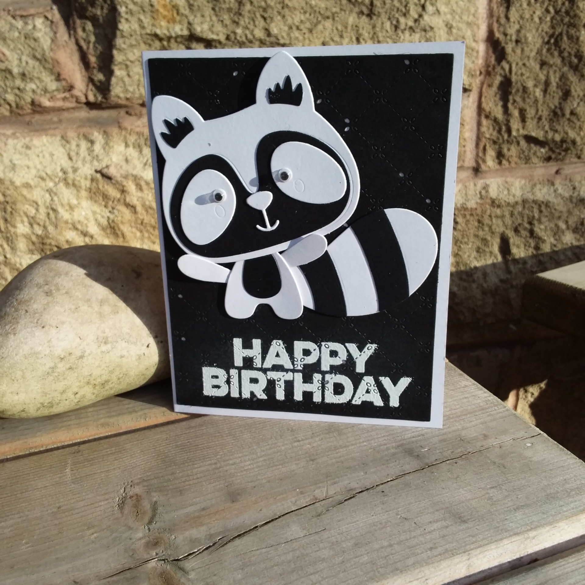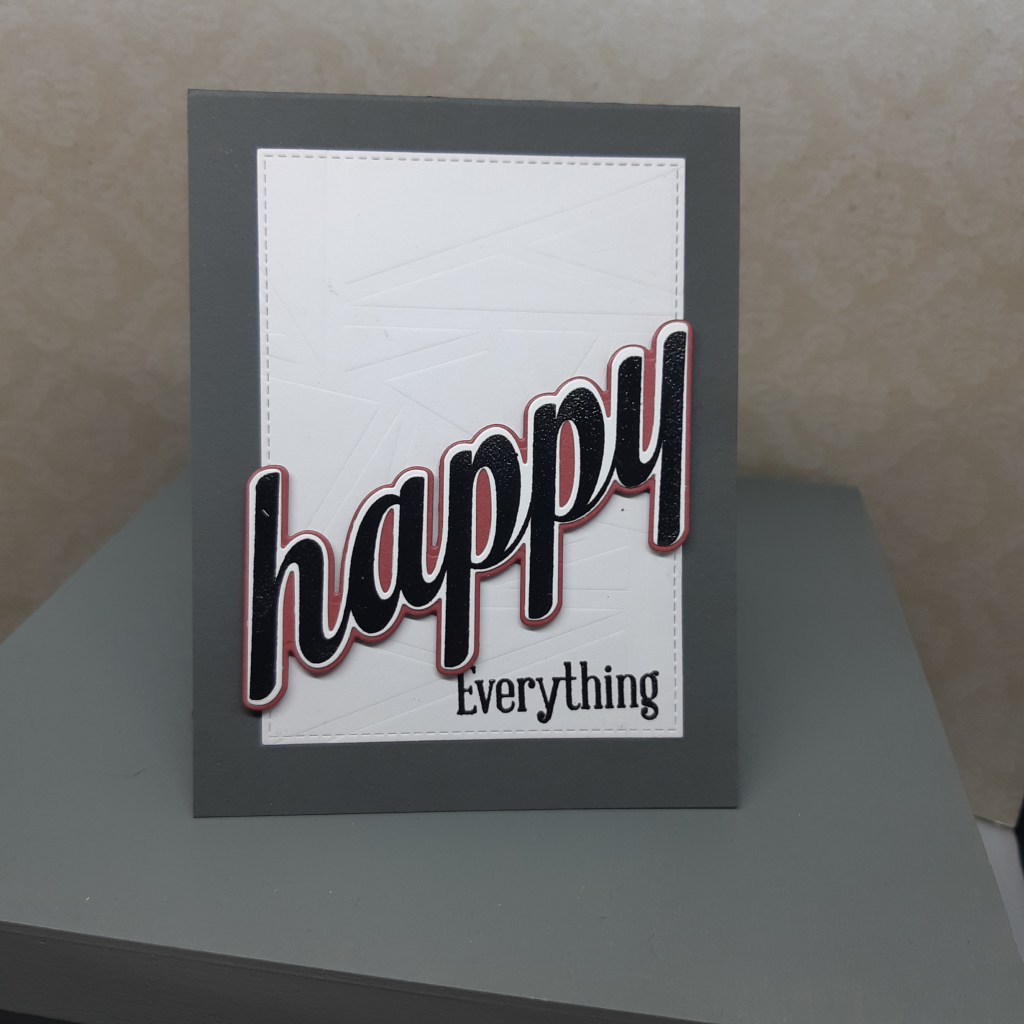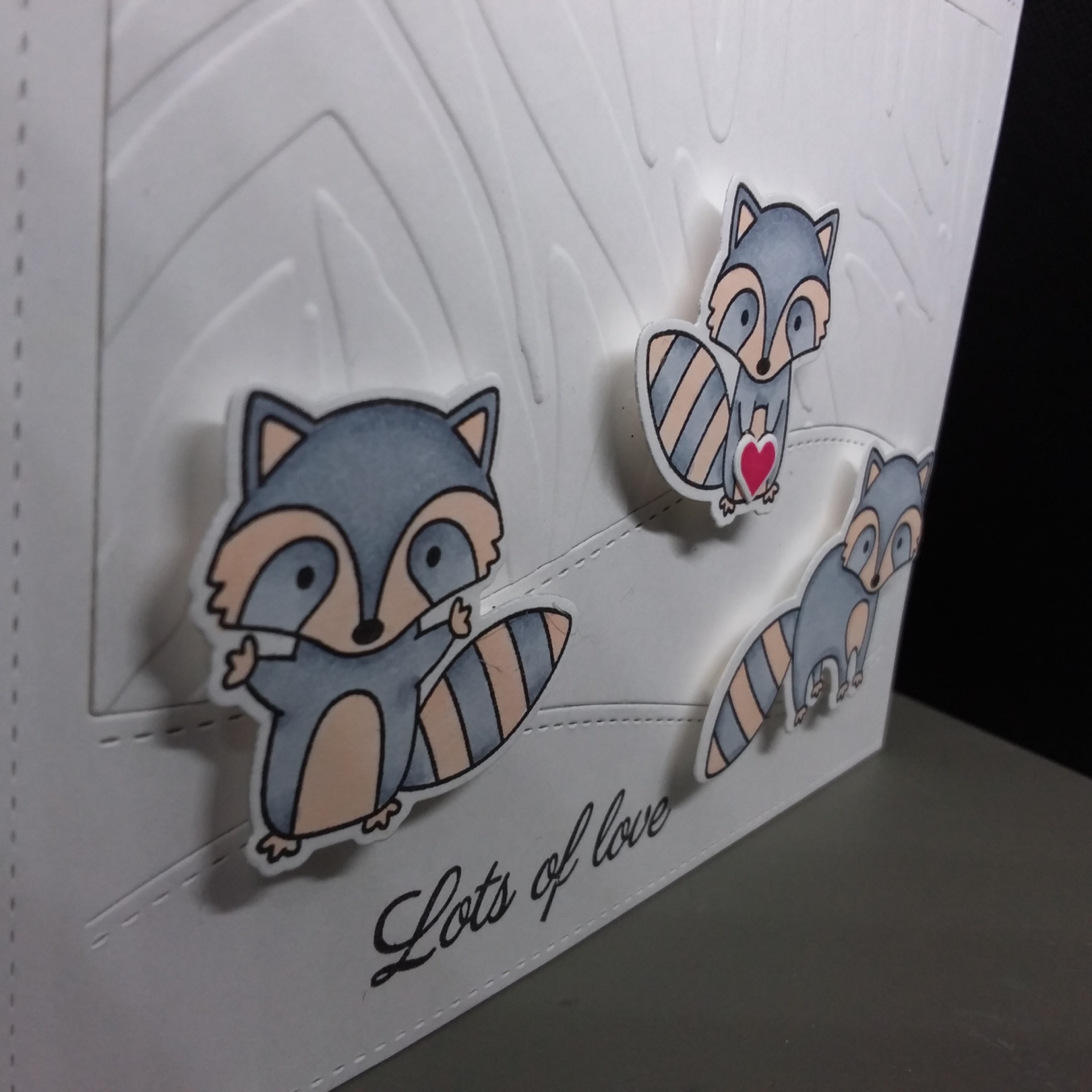 The sentiment is cobbled together from a couple of stamp sets, and heat embossed in white, on the grey die cut tree layer. I didn’t stamp the trees – I just drew a black line within the images with a black gel pen.