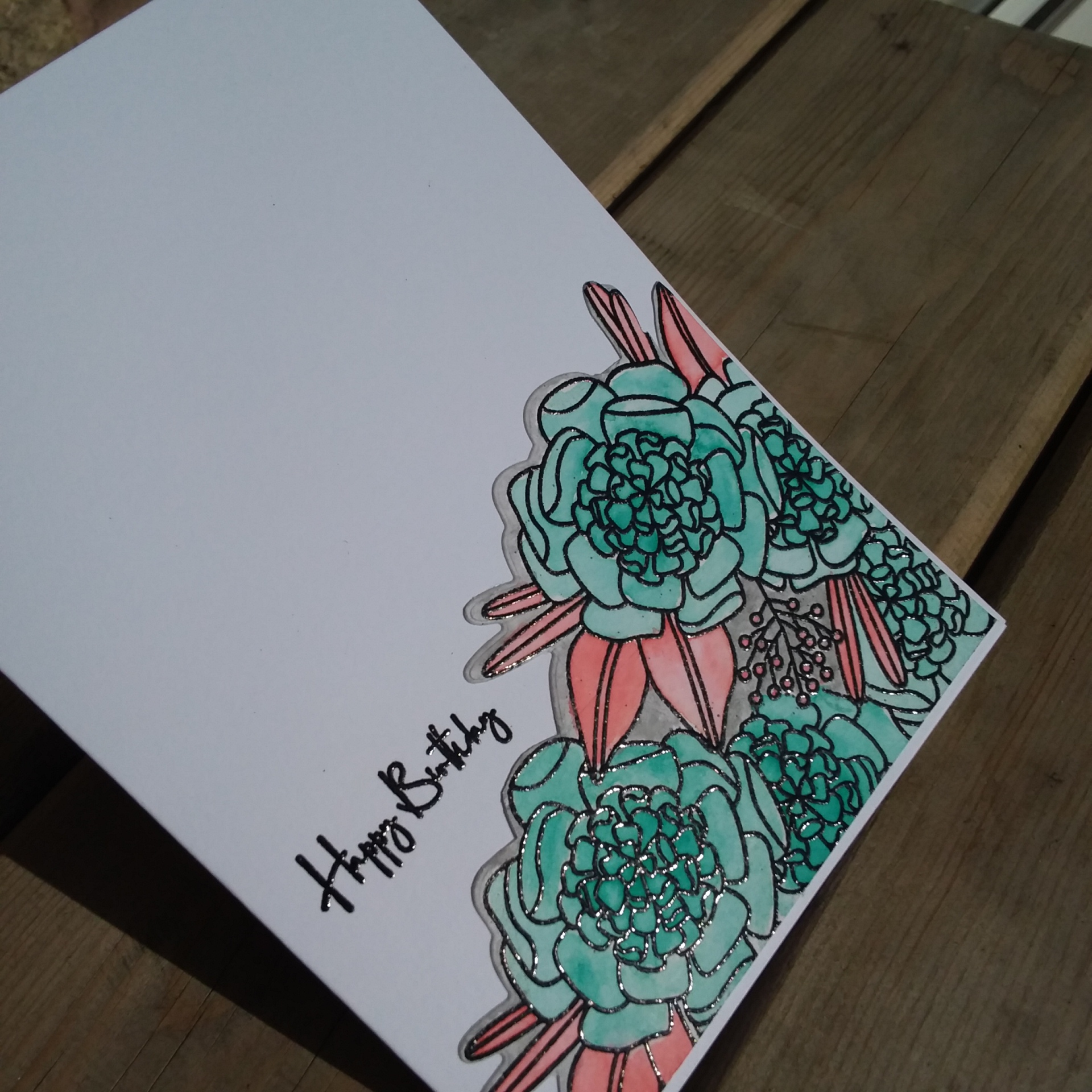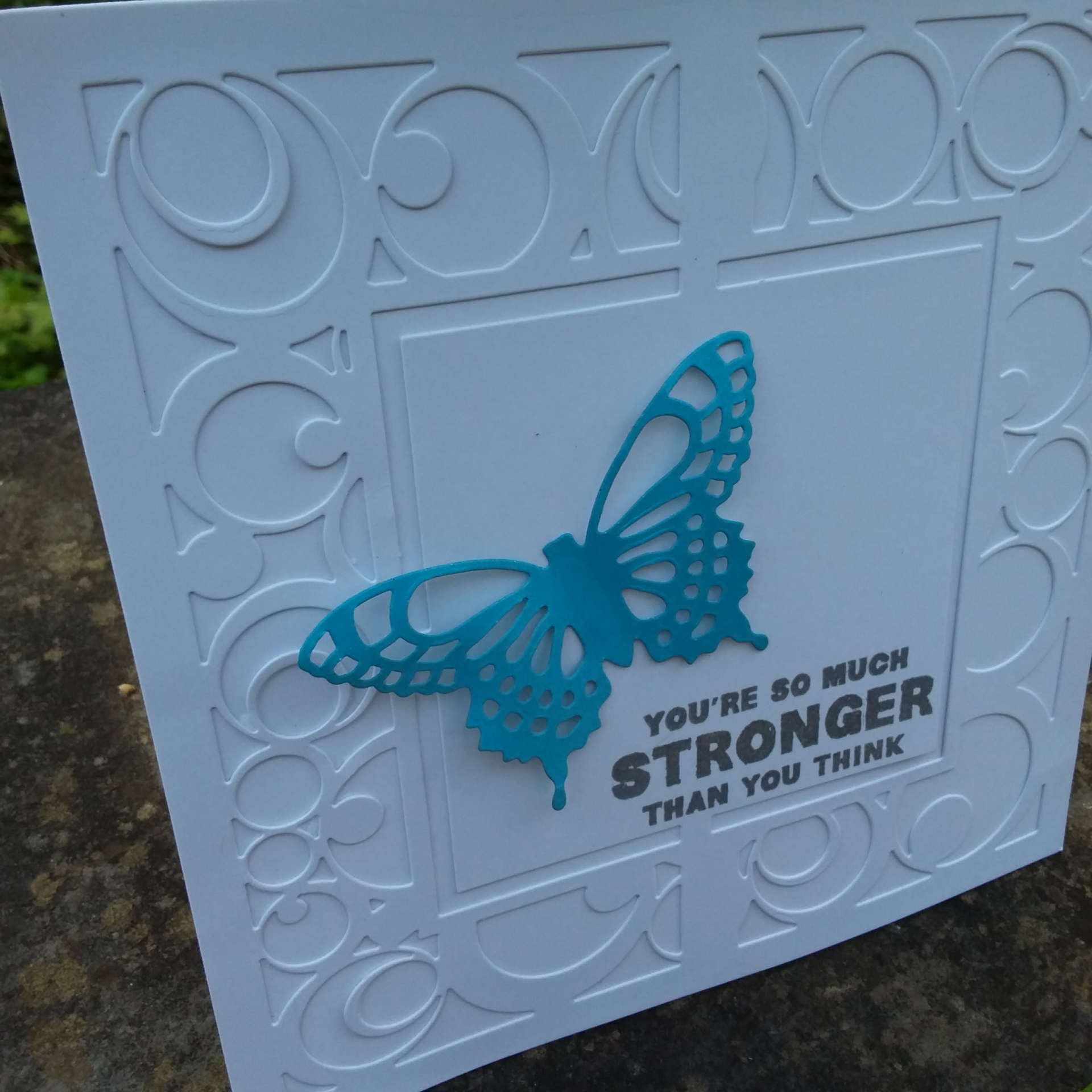 Back to the card………I found the butterfly die-set, and then looked everywhere for a turquoise ink, pen, marker, card – you name it – I hunted. Again, it took a while, but in the end I used a Copic Marker to colour a piece of ‘Make It colour blending card’ I ordered from Marker Geek – this is soooo smooth, and colours and blends beautifully.