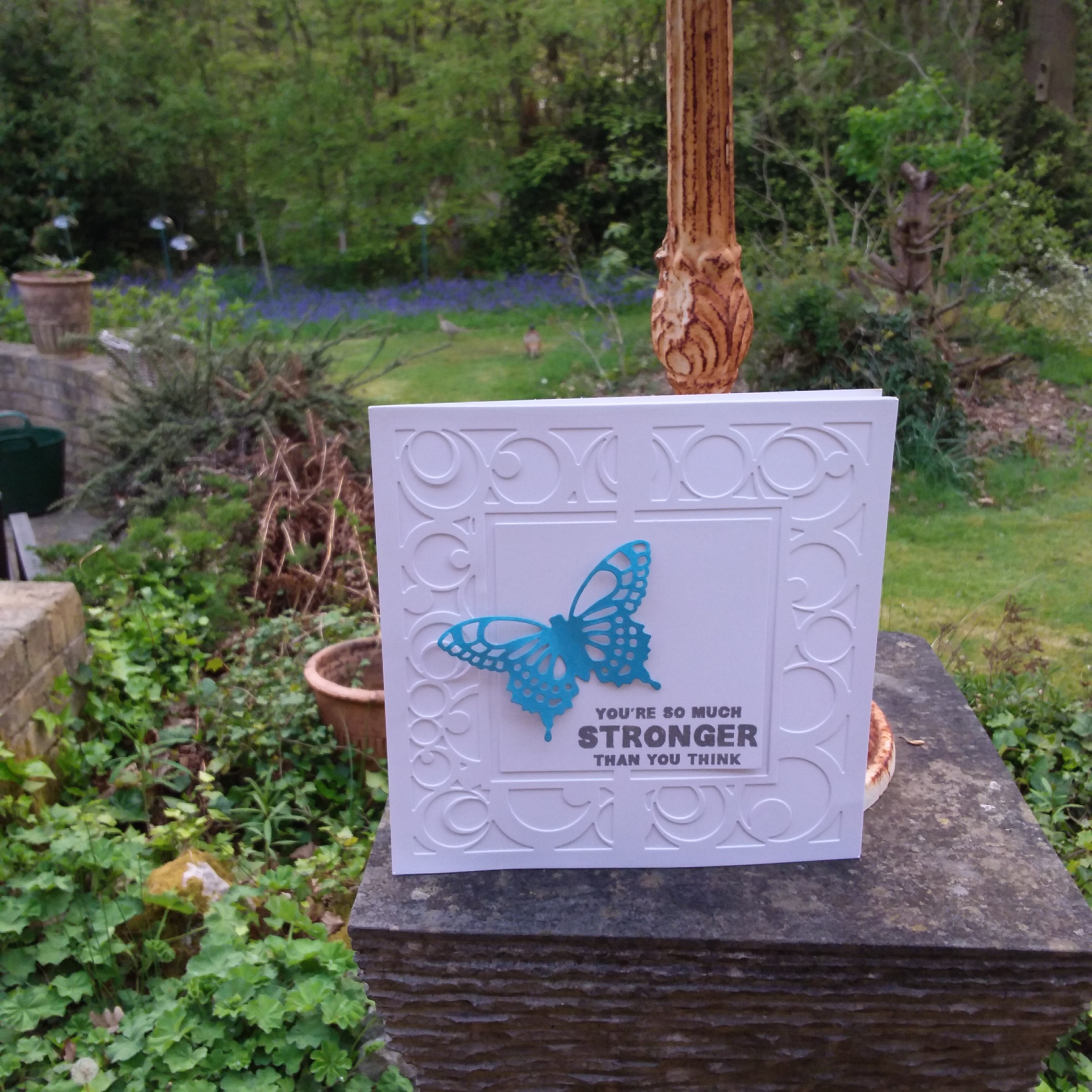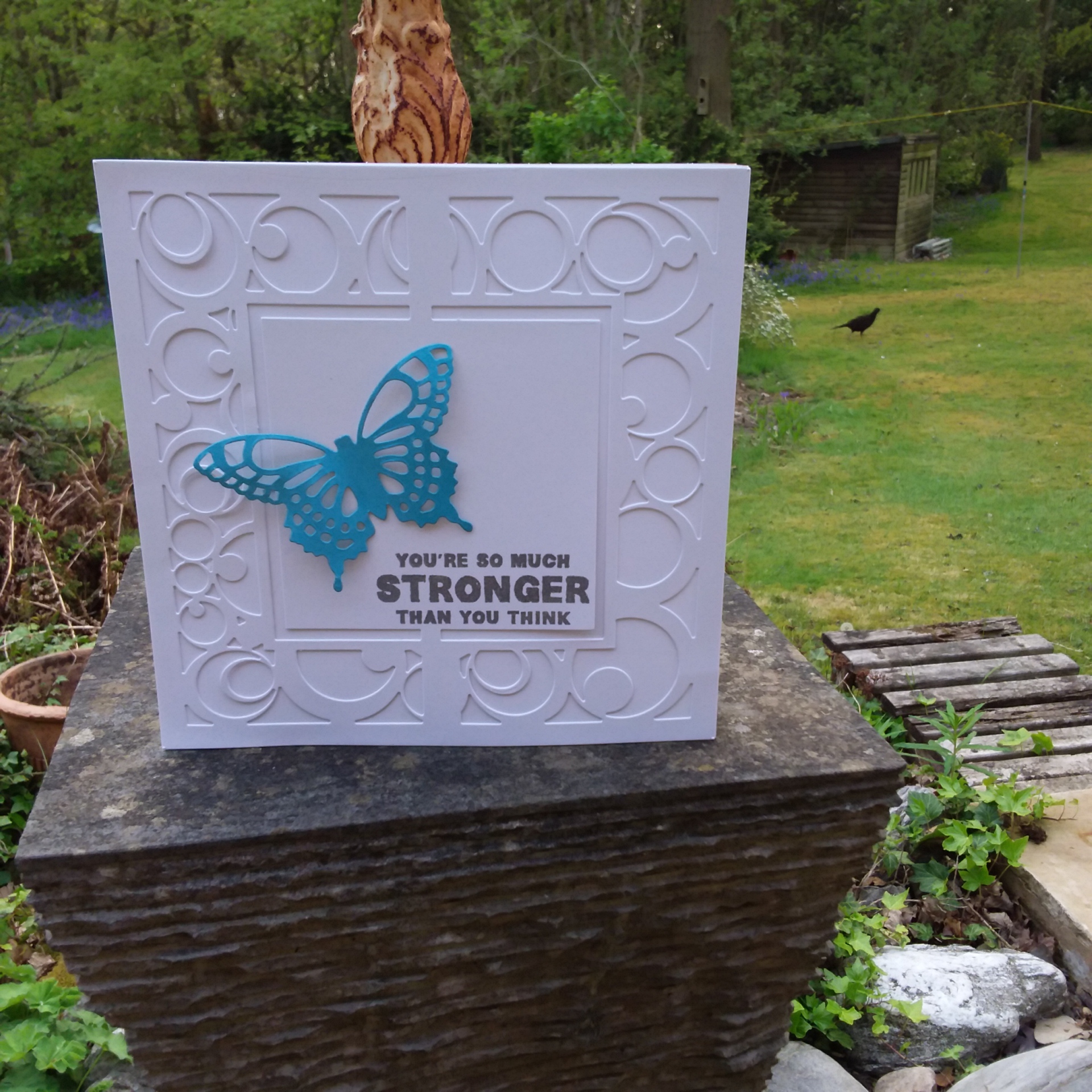 Hello again. I have a card to share today, but it took me ages to find a suitable butterfly. I can’t believe I have so few butterflies in my stash – and I couldn’t actually find more than a couple of stamps, but I found this old Spellbinders butterfly die-set – which absolutely suited what I wanted to do.