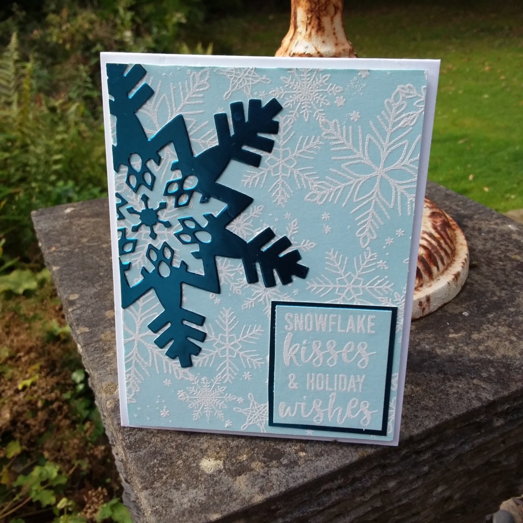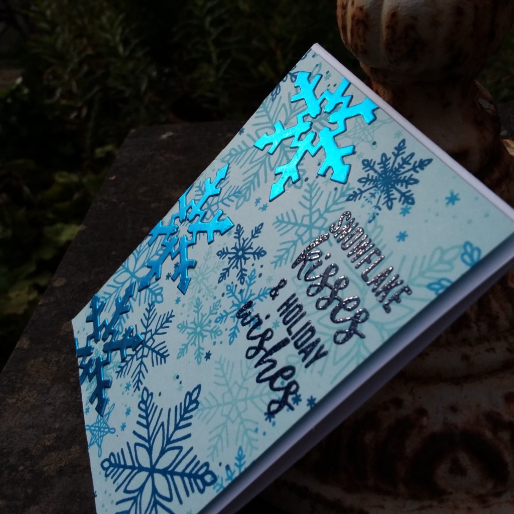 This first card is using the Concord and 9th ‘Snowflakes Turnabout‘ stamp set and Altenew inks – the four blue shades. The 3 additional snowflakes are also from Concord and 9th, and die cut out of Crafters Companion Ice Blue Luxury card. A little more shine and dimension: