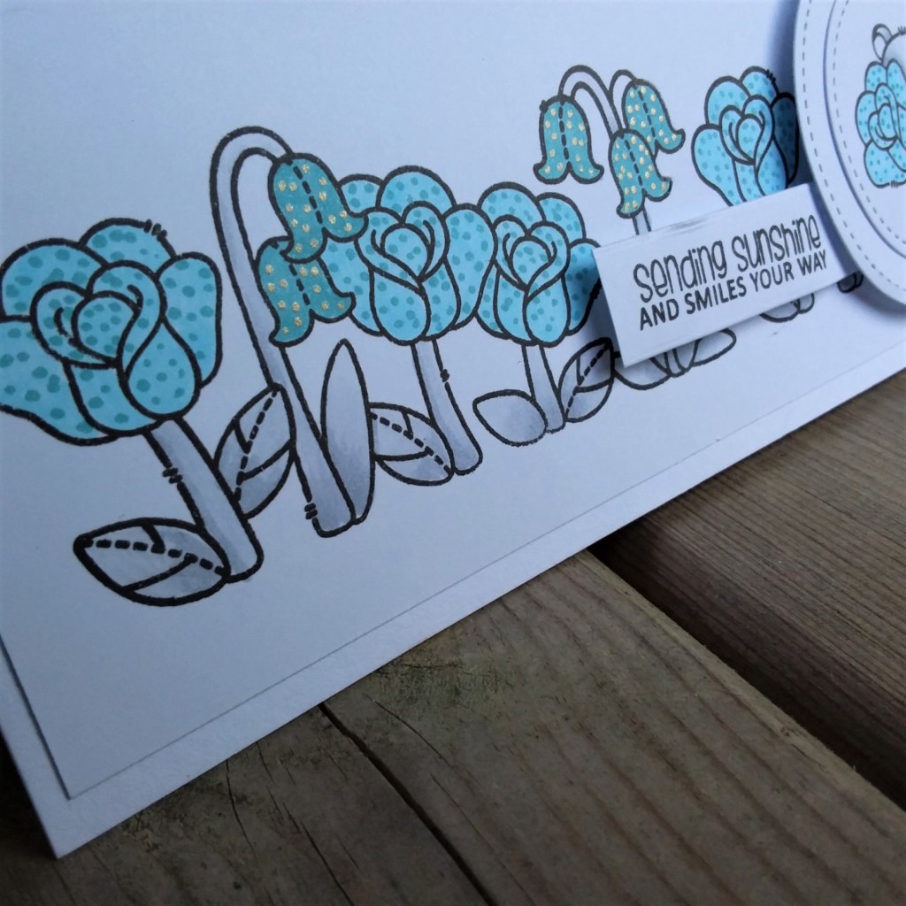 I coloured the images using Copics – very simple, very little shading, then added some gold gel dots to some of the flowers – I tried to catch that in the bottom photo – and some darker dots on the other flowers.