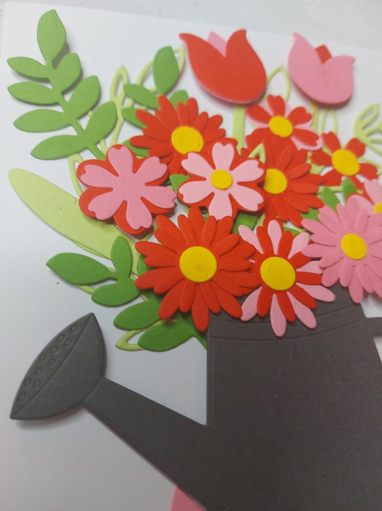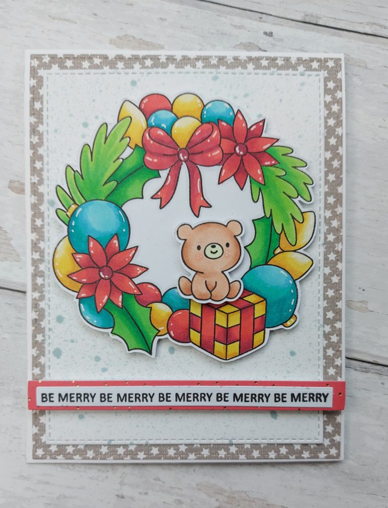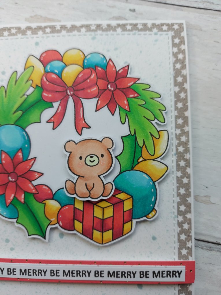 The pandas are from Clearly Besotted – as is the sentiment. The word ‘colour’ – using the UK spelling to get the six letters – I stamped in a very light brown ink, then coloured each letter with the same Copic colours I had used on the wheel.
