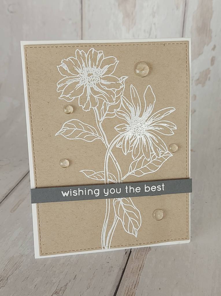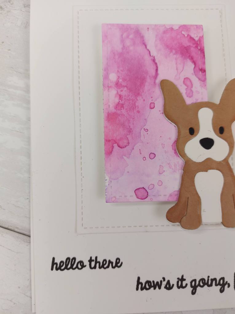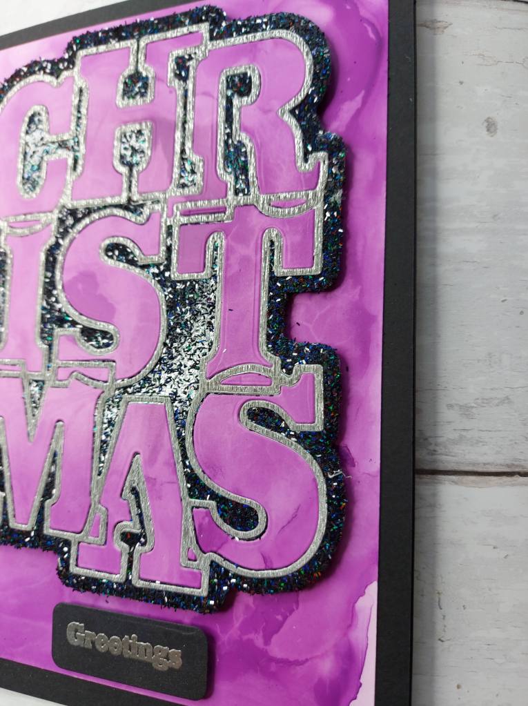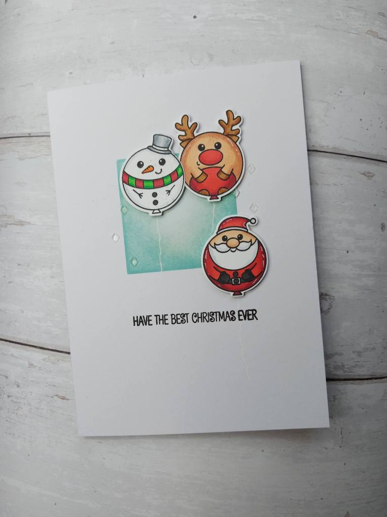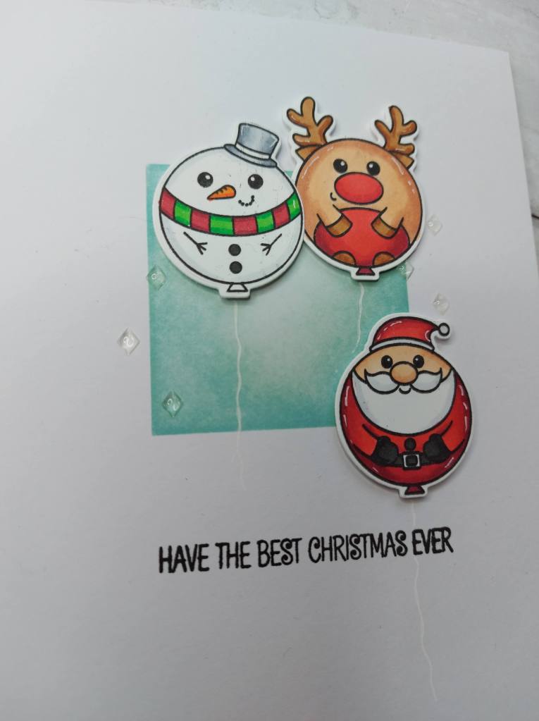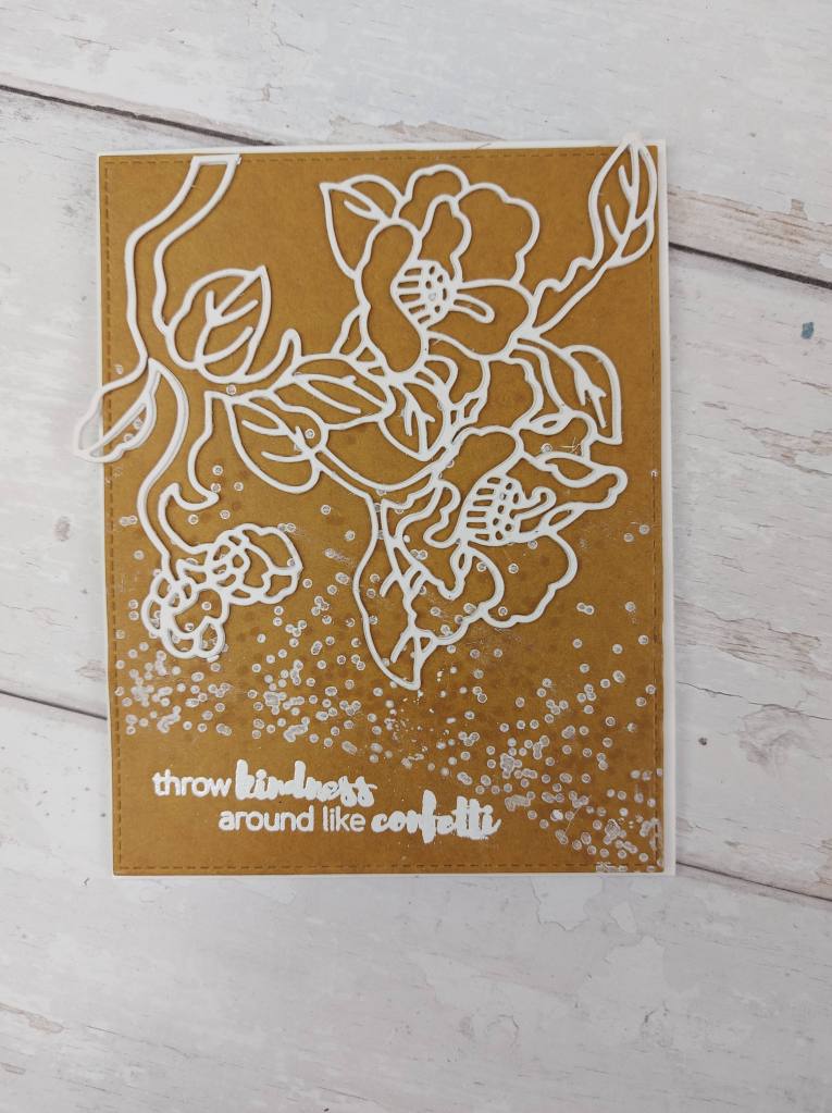 After stamping and white heat embossing the sentiment, I used the confetti stamp – from the same set – to stamp with a white ink pad, with the dots radiating outwards and upwards.