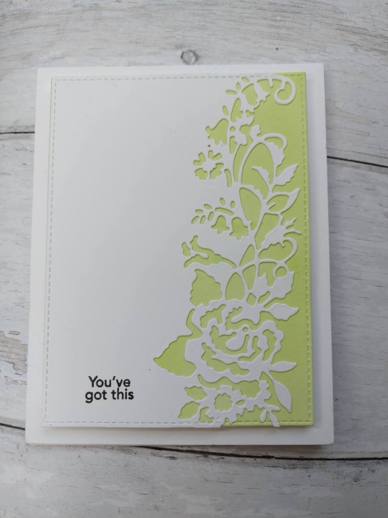 Thinking of keeping the card quite open, and quite simple, I used the Antique Engravings cover die – layered several times – removed the frames from the die cuts, and placed down as you see.