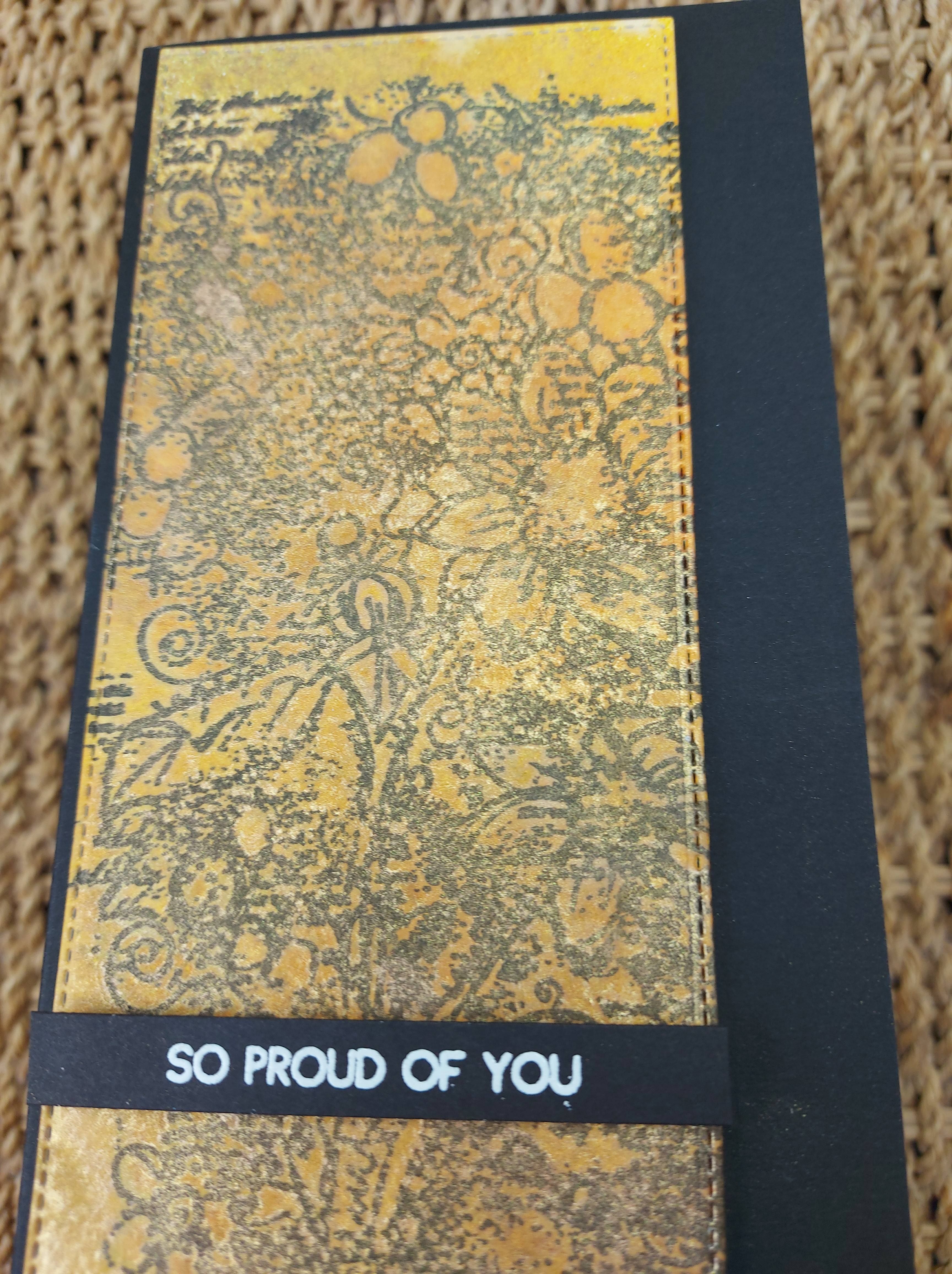 As this stamp is so long, I went for the slimline style, but I did cut it down on one edge, and left a border of black instead of centering it in the middle – I like how that seems to make it more dramatic.