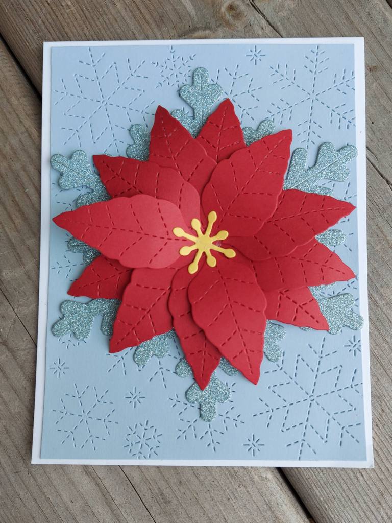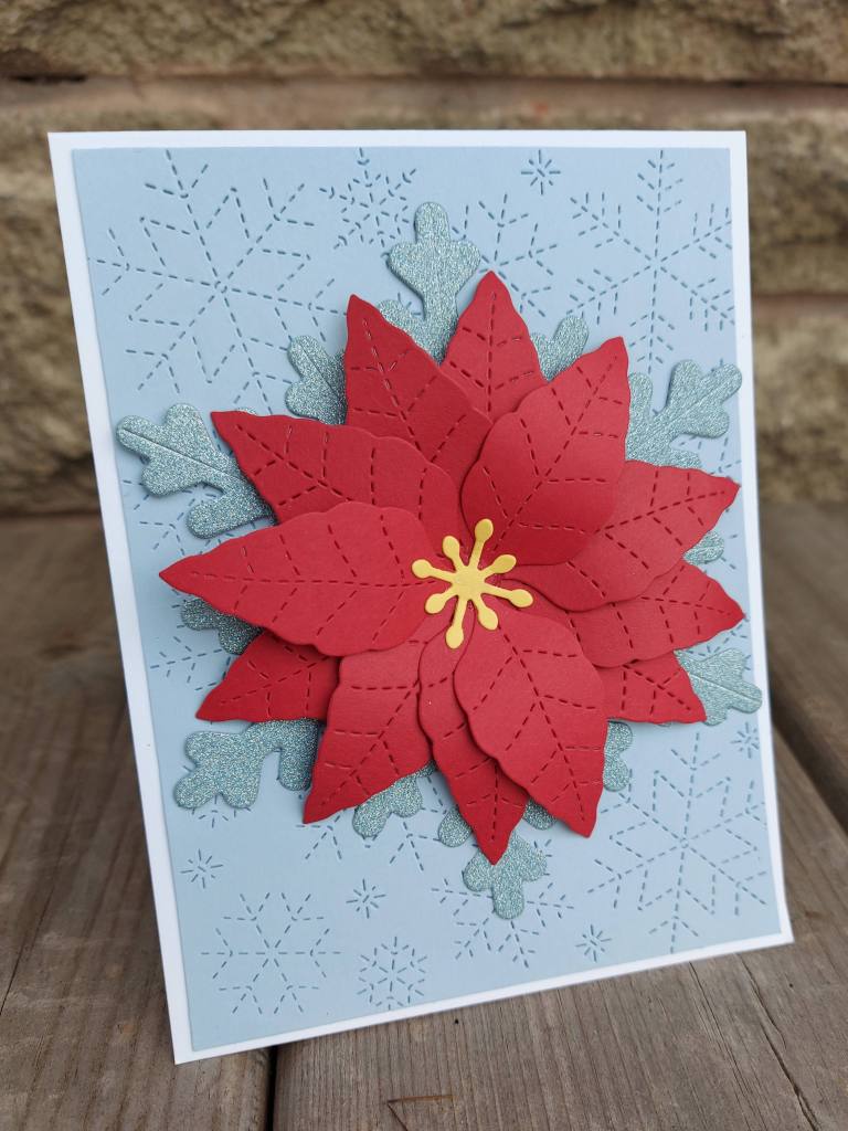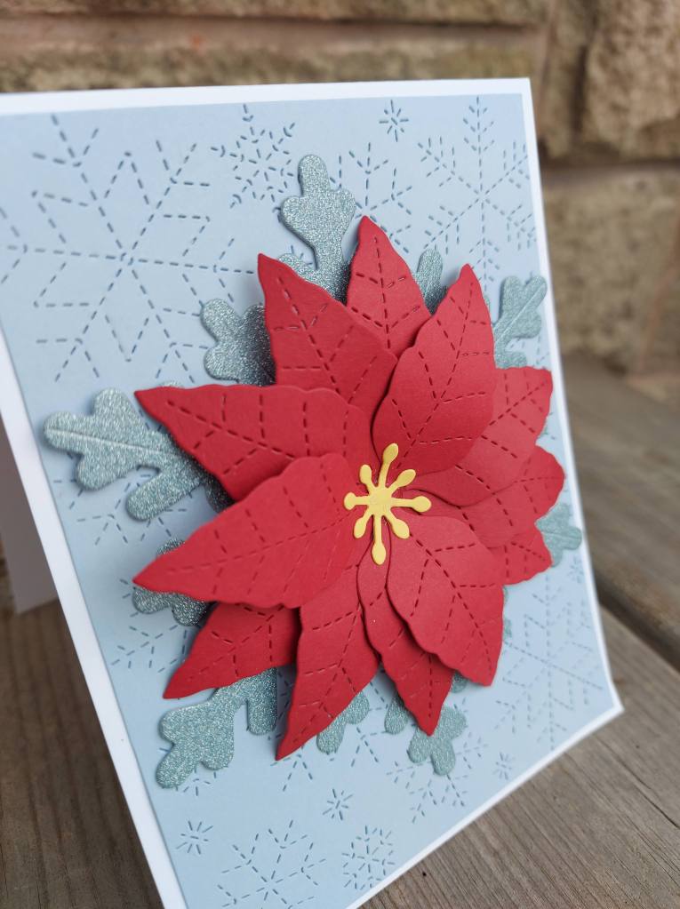 I used a Concord & 9th Poinsettia die from their recent ‘Jolly Holly‘ workshop – which I’ve yet to do – and die cut several layers for the poinsettia. The glittery snowflake – another die from the same workshop as a base for the flower – and Lawn Fawn ‘Stitched Snowflake Backdrop‘ – which I can’t seem to stop using – for the base layer.
