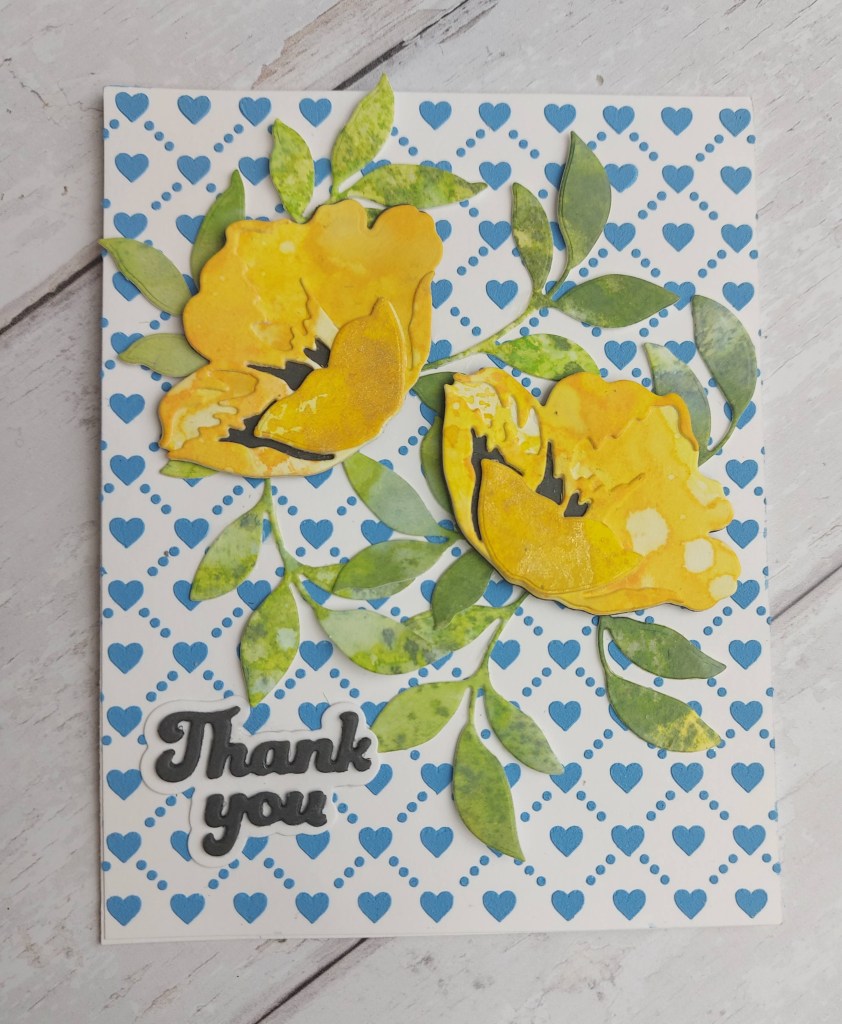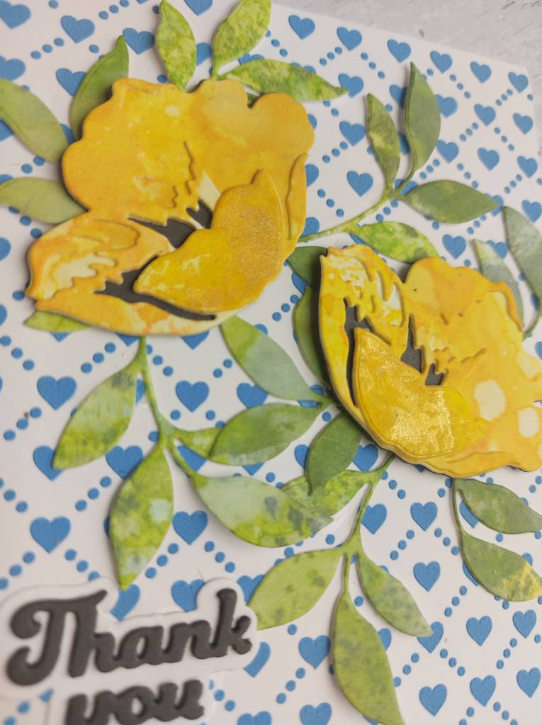 I’ve been playing with some layering stencils recently, and this stencil from Pinkfresh Studio caught my eye as I loved the tumbling leaves, and that the flowers you create are all cut individually using the matching die, so you can out them wherever you want to.