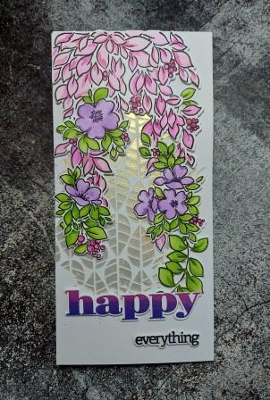 The stencil is slimline size – as is the die and stamp set. Once I had stamped the outline, I used the colours from the current challenge at Color Throwdown to create some pink tumbling leaves at the top, but used green for the leaves around each of the flowers. The Altenew ink sets are perfect for layering colours.