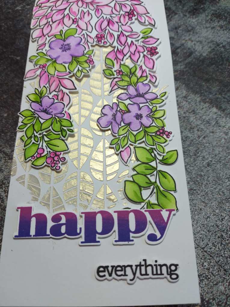 The sentiment is from Time For Tea Designs, which comes with matching dies. The word ‘Happy’ was stamped using a pink and purple Distress Oxide, and multiple stamping to create a two-tone word.