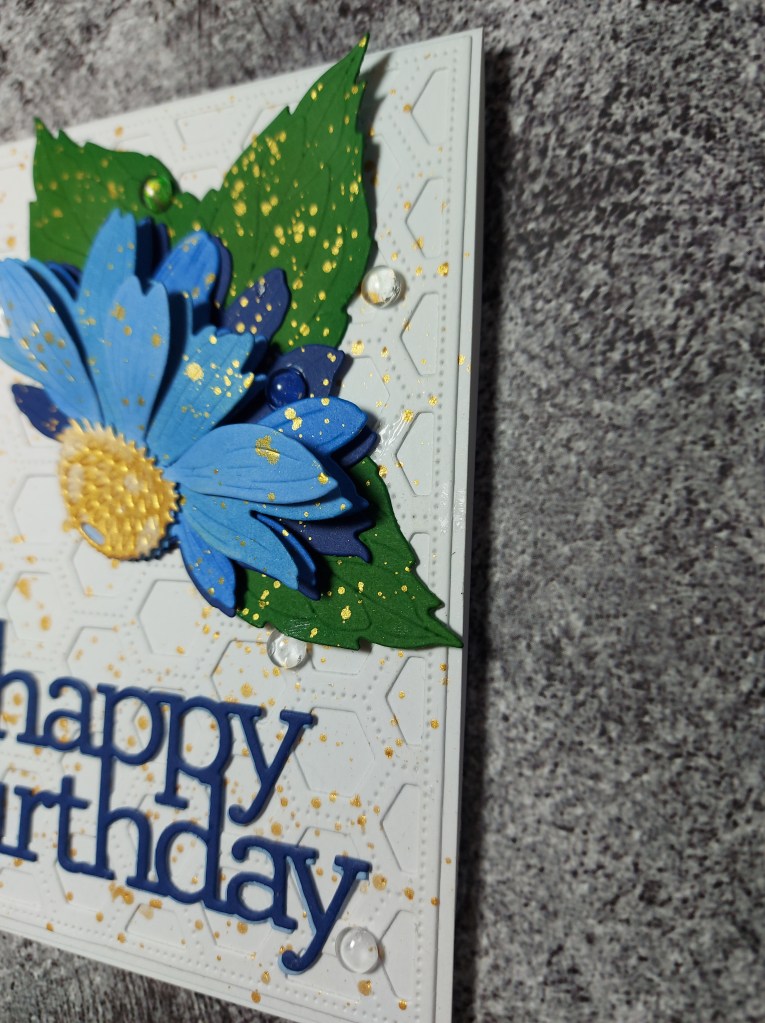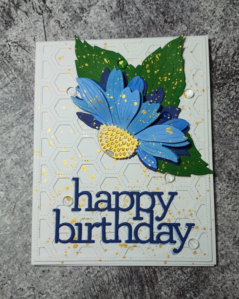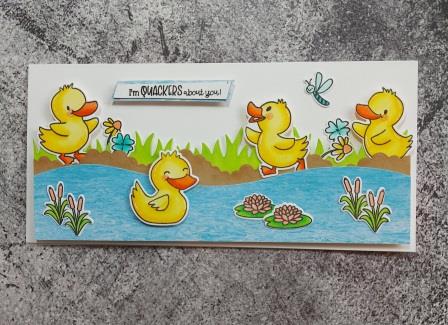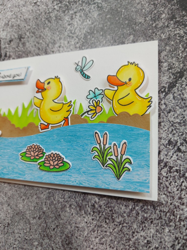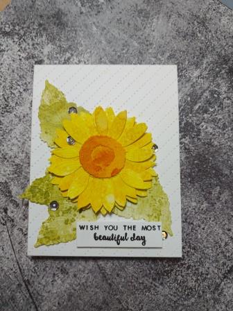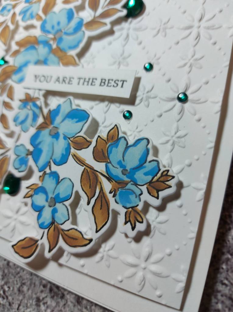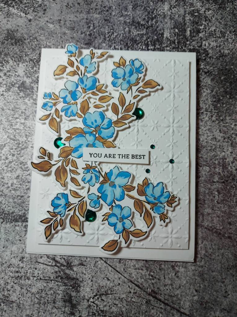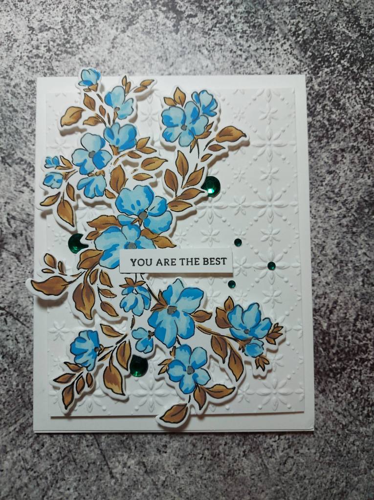 A post today to share a card I created over the past few days…..yep – past few days! This took some drying time for some elements, decisions about colours – and whether to use Copics, or coloured card stock. Here is my card: