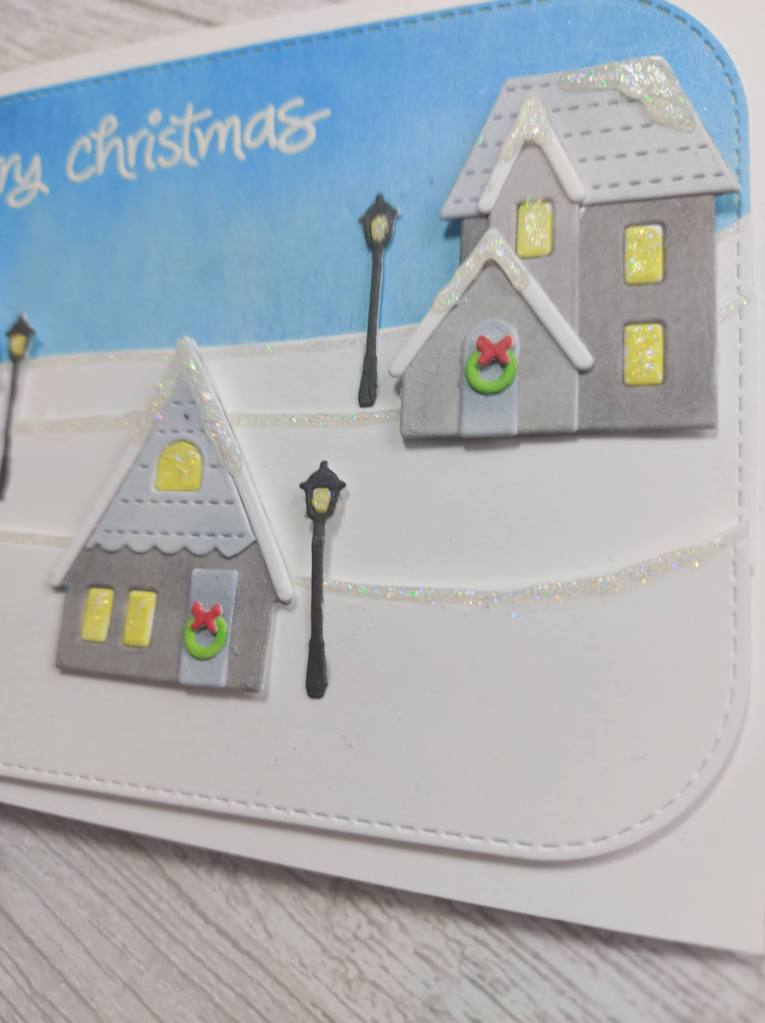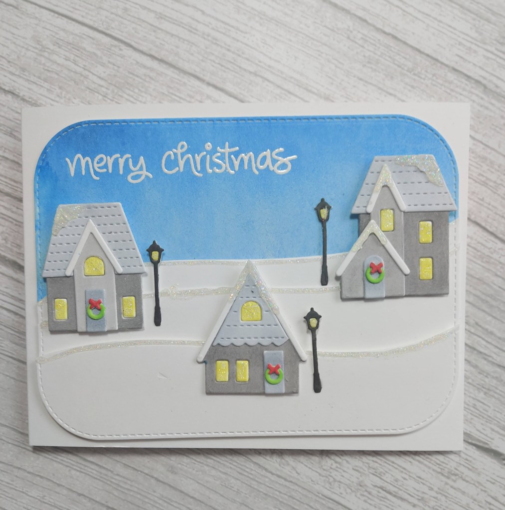 I then took a Concord & 9th die set and die cut all the pieces from white Neenah, then eventually decided to colour all the houses with warn grey or cool grey Copic markers – varying shades – to come up with how they look here.