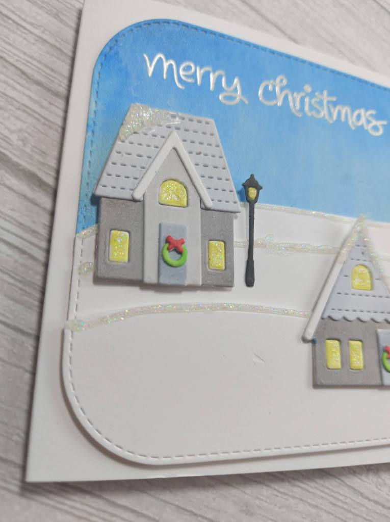 I played with snowbank layers and levels to create the three hills. These were all stuck down onto the base card – the uppermost layer with 3D foam, and some Hero Arts ‘sparkle clear lacquer pen‘ used for the snowy tops – again something else to set aside and dry…..
