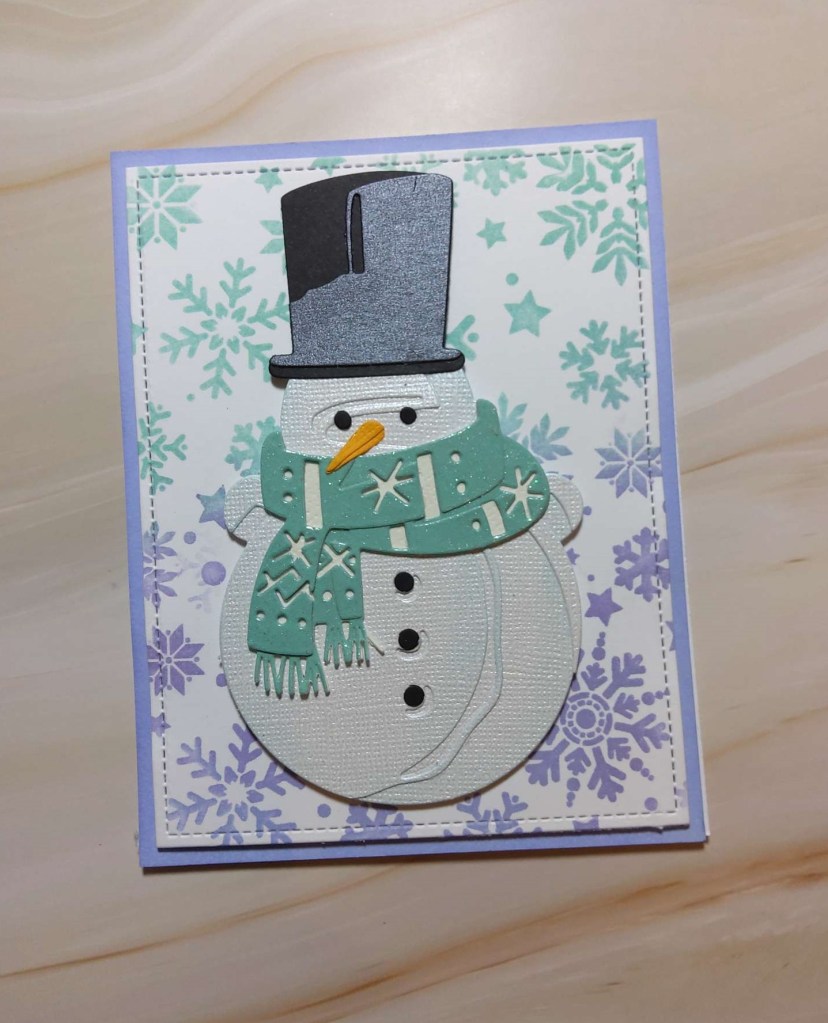 The snowman is a Tim Holtz die, and die cut using one white textured shiny card, and with part of the layers ink blended with some teal ink – to tone the white down a little and to add more dimension. All three layers of the scarf I die cut with one colour, and the hat was two black card pieces.