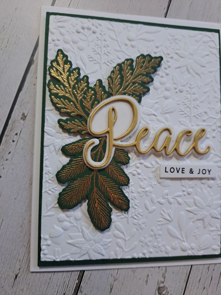 The leaves were heat embossed in gold, then die cut using their matching dies. The sentiment was created using a die for the word ‘peace’ – layered three times – and added to the shadow layer. The ‘love and joy’ was stamped then trimmed.