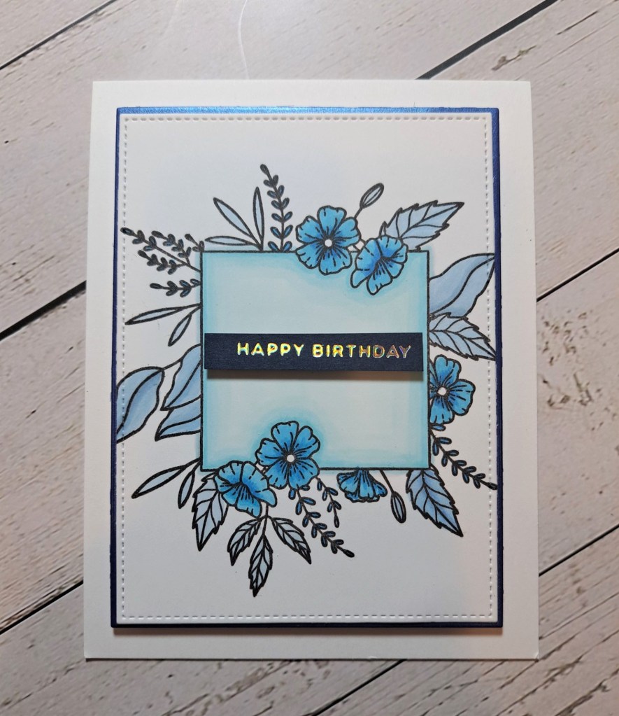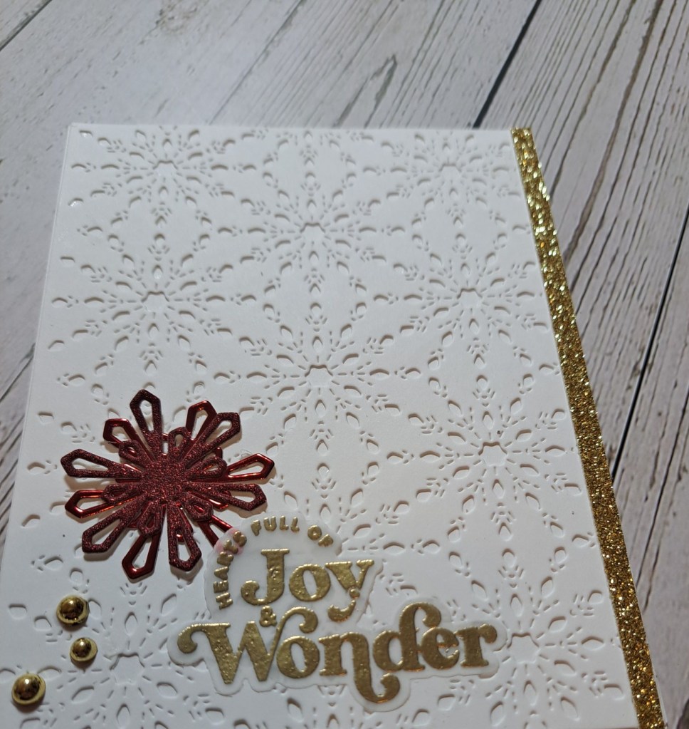 I used a previously created background panel – a black piece of card, a Spellbinders stencil, and some gold paste.