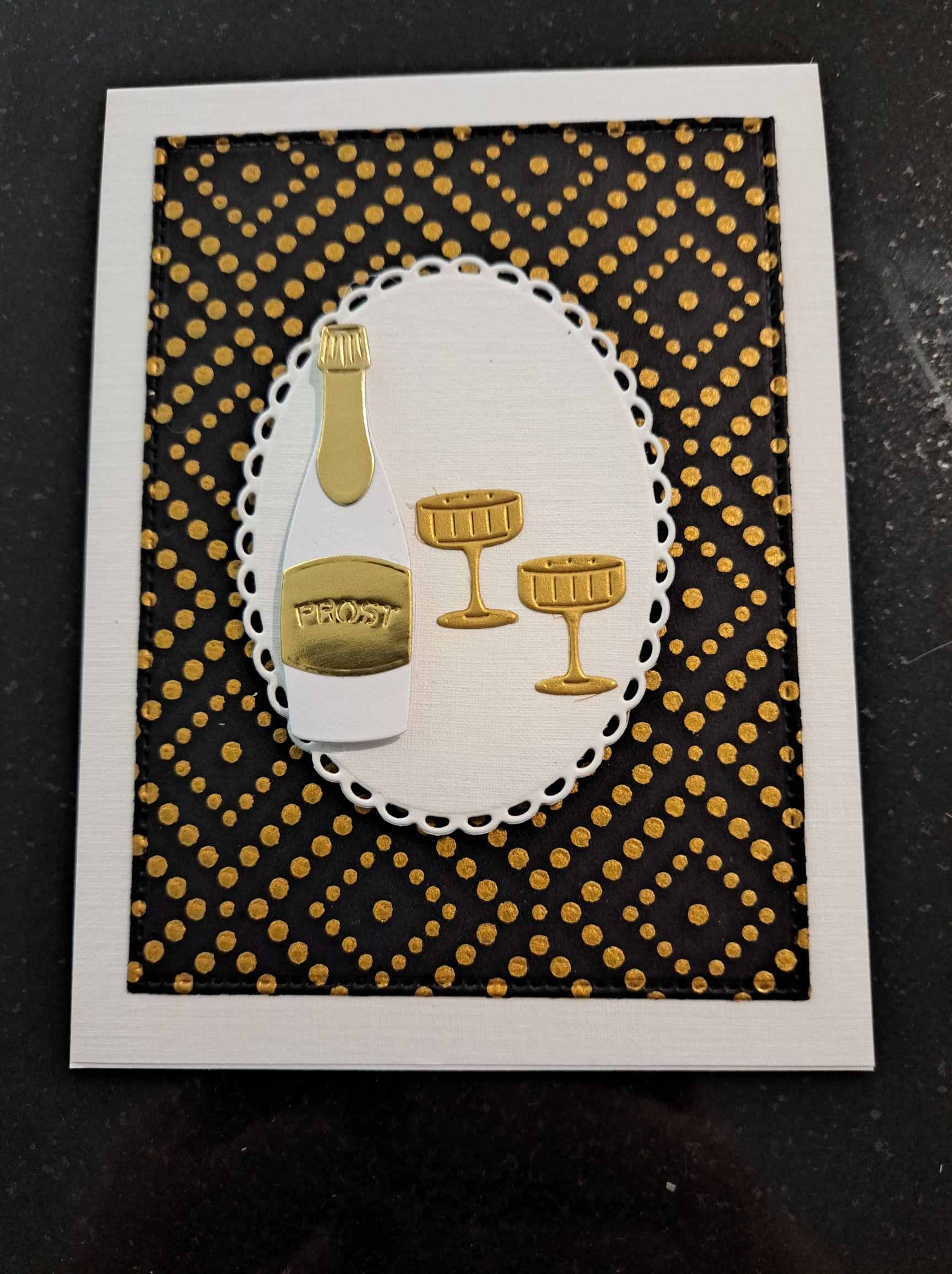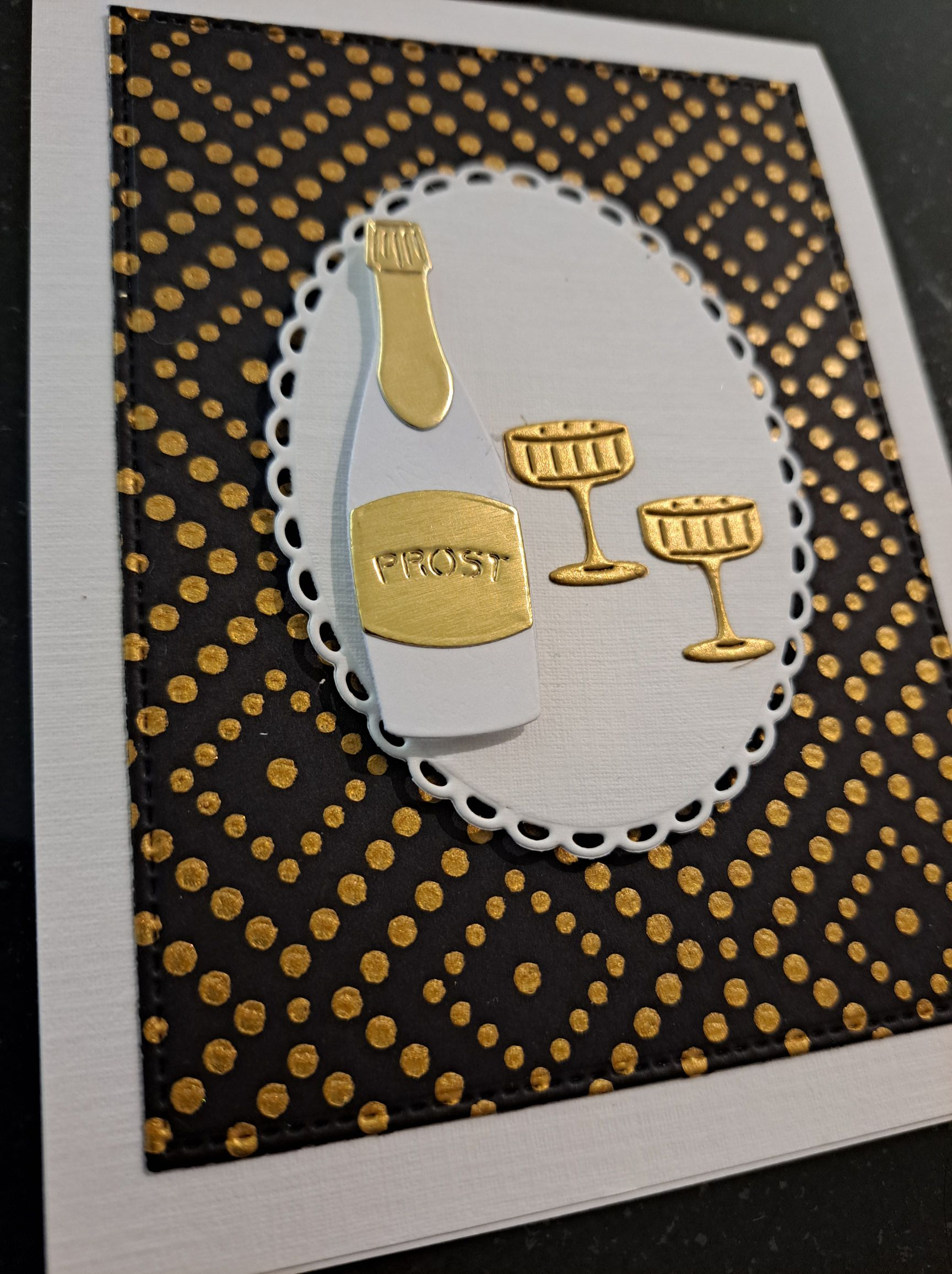 The bottle and glasses are from Charlie and Paulchen, and I die cut the bottle out of white, then the bottle top and label out of shiny gold card stock, and the glasses out of a matt gold card stock.