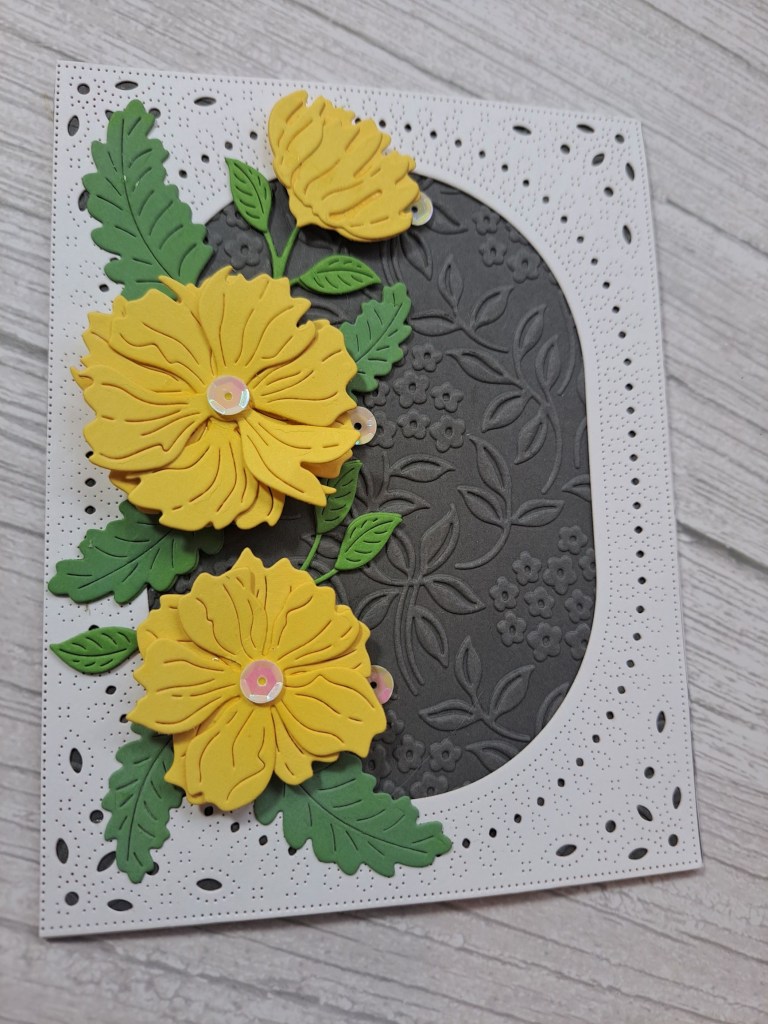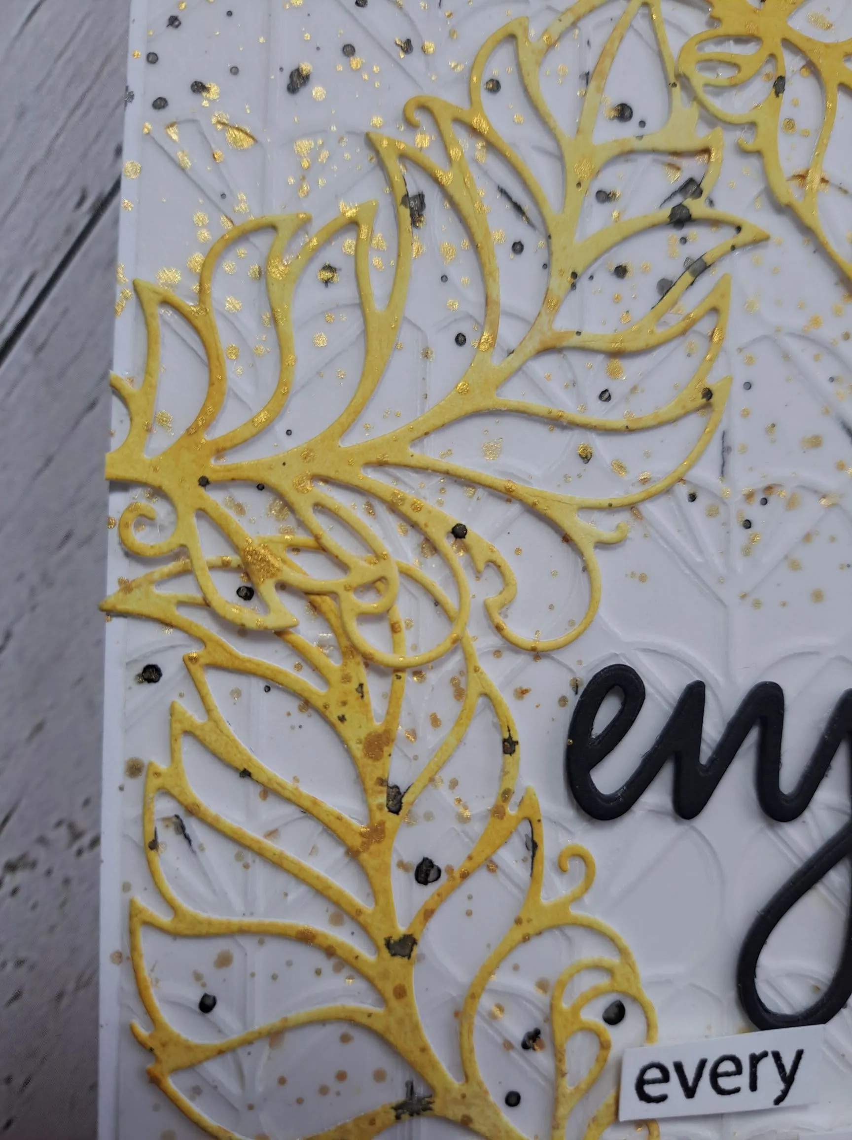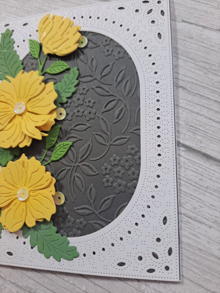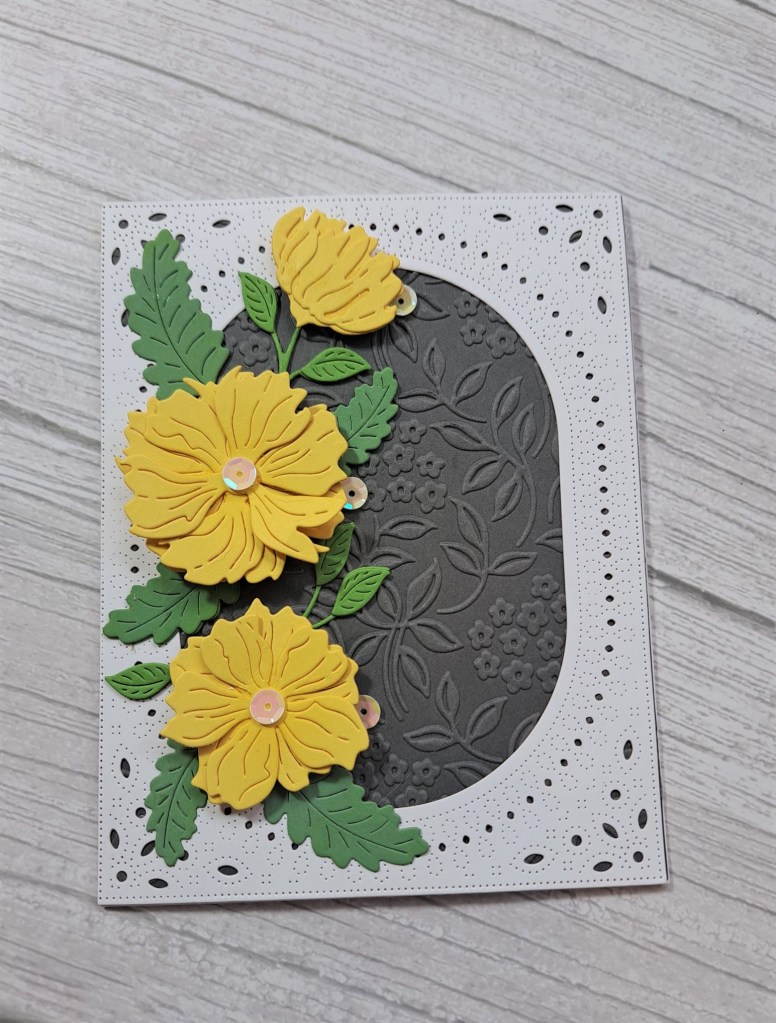 The floral die set comes with a flourish stem, but I cut that up to create some smaller leafy areas. The flowers were added with a small piece of 3D foam, the leaves were adhered using glue.