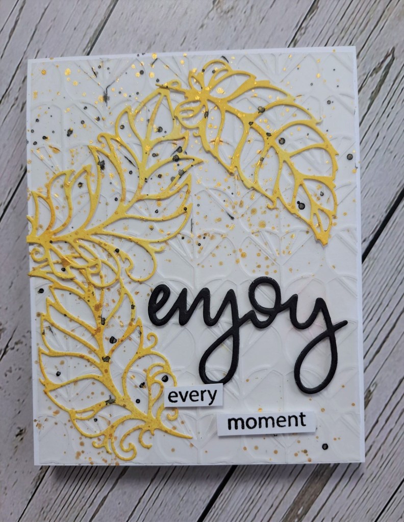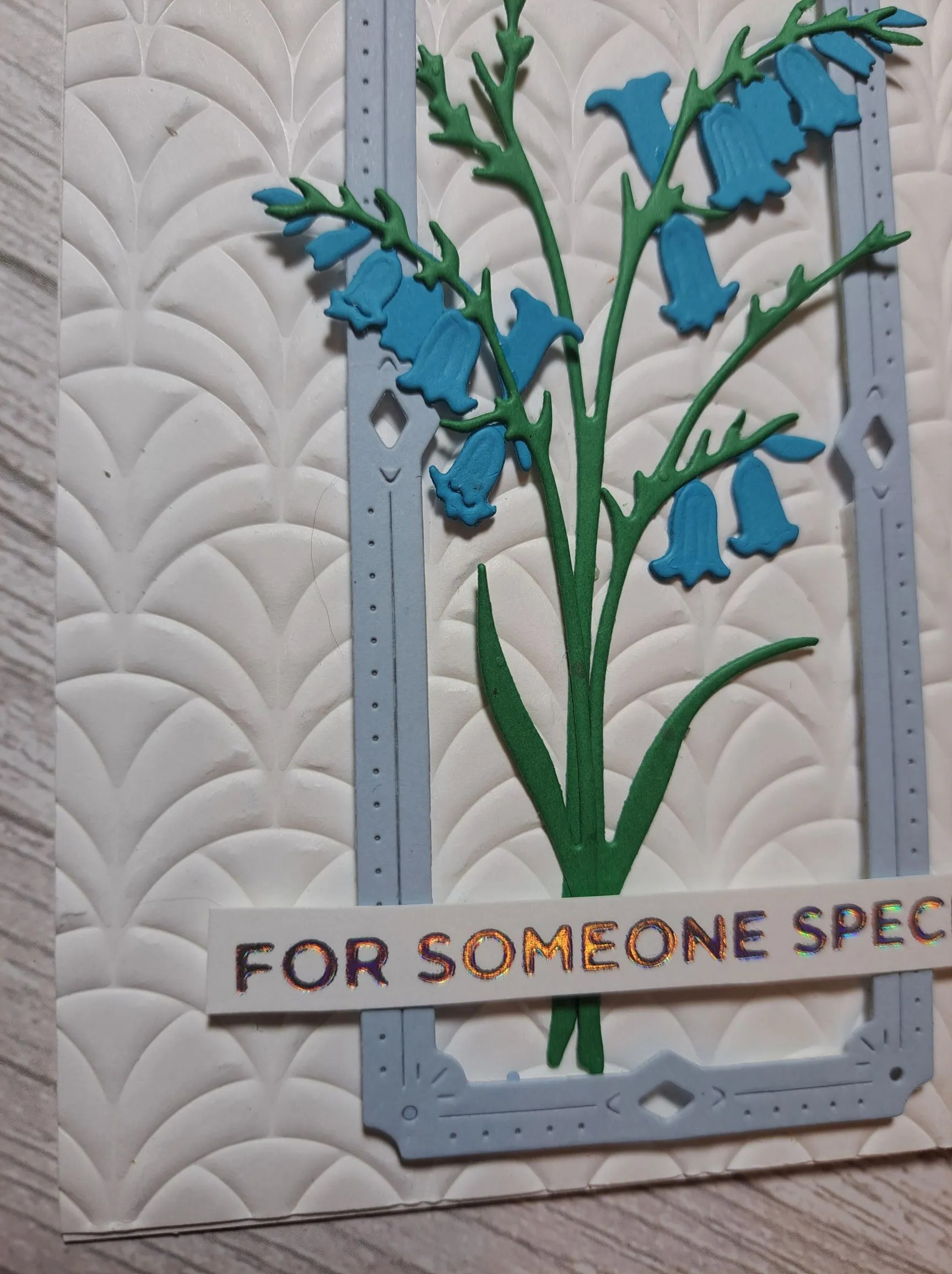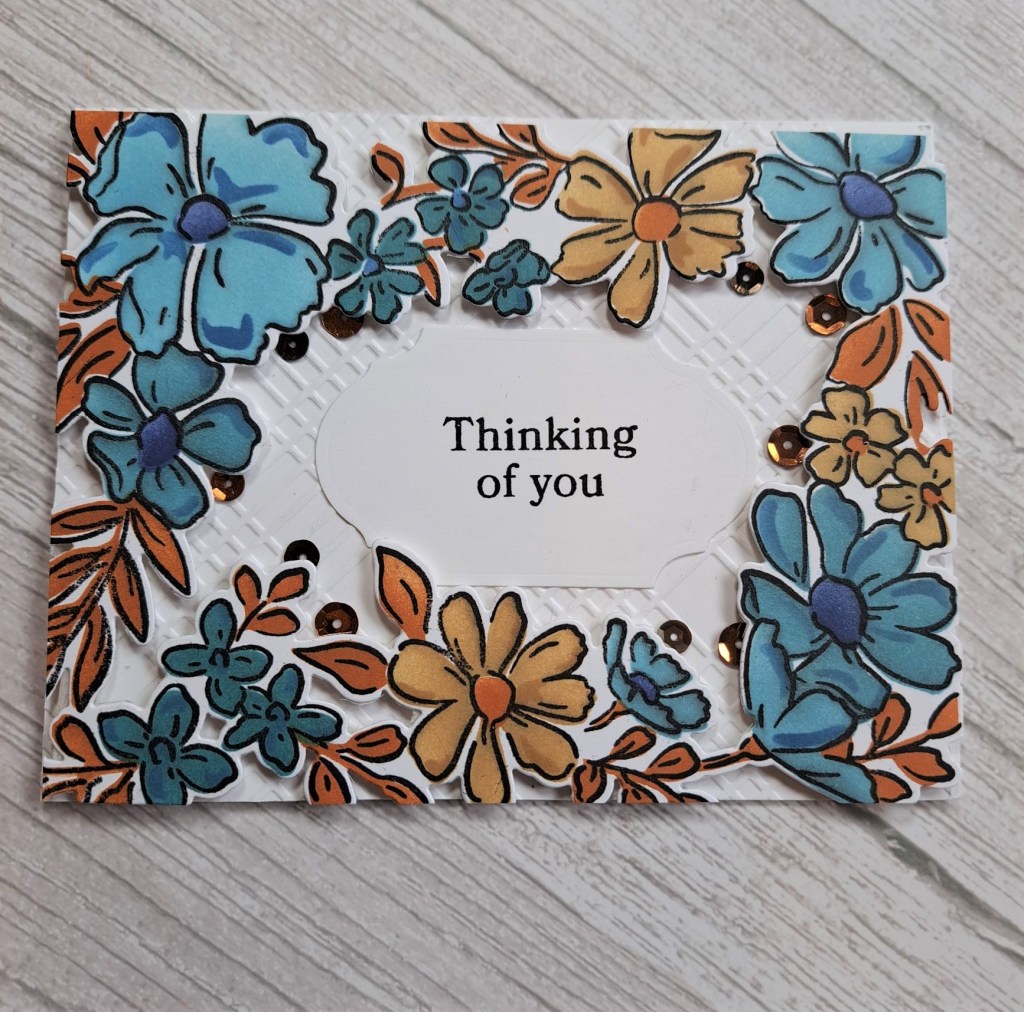 The floral die set comes with a flourish stem, but I cut that up to create some smaller leafy areas. The flowers were added with a small piece of 3D foam, the leaves were adhered using glue.