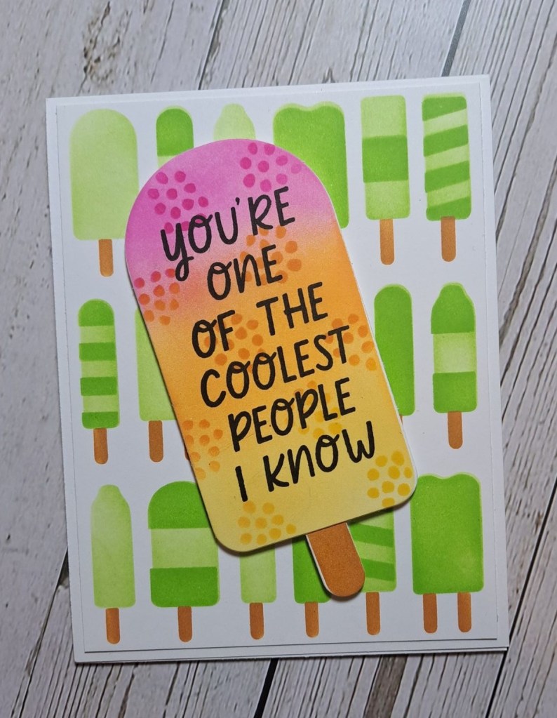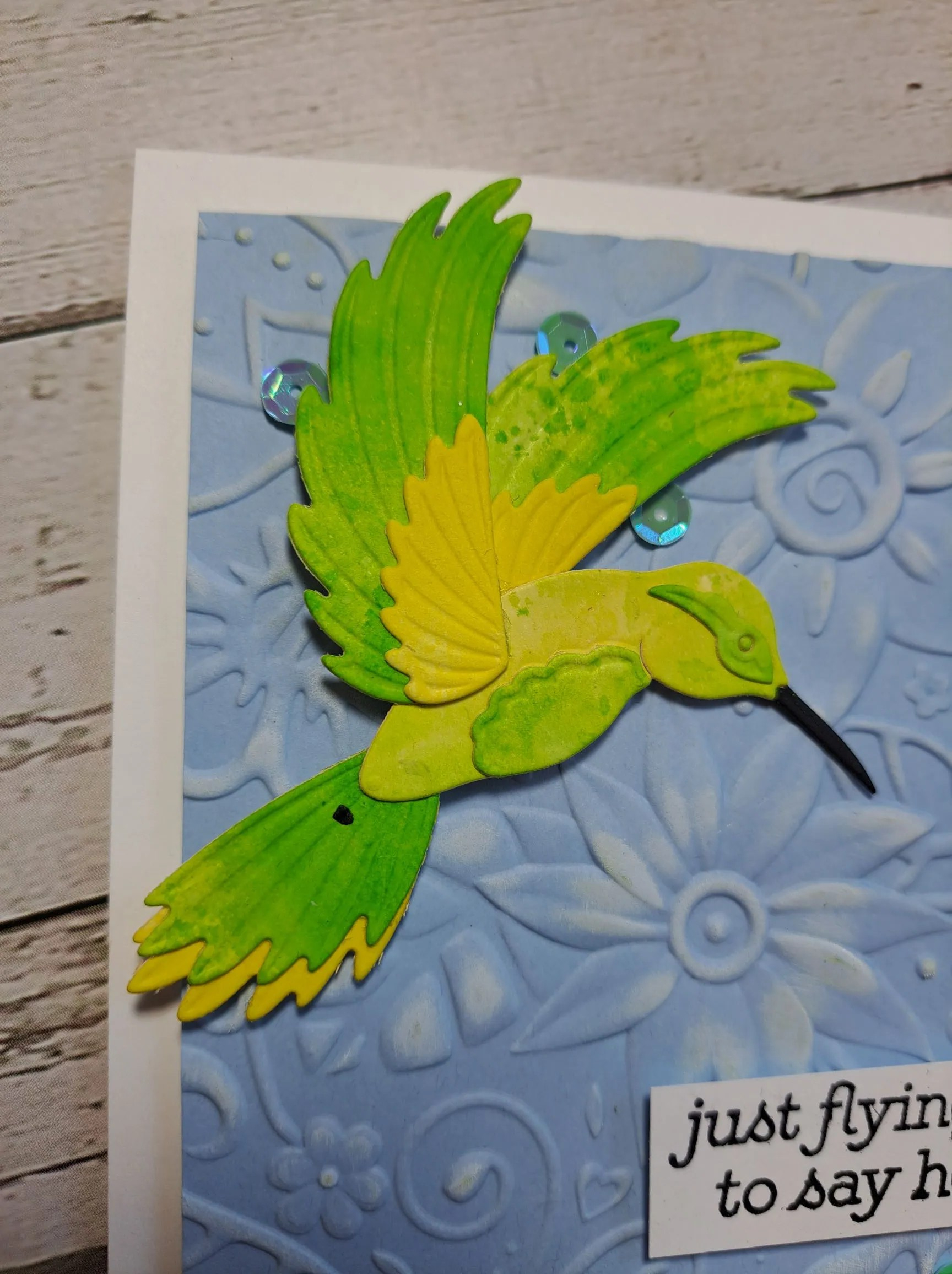 The layered flowers were die cut out of yellow, the leaves out of green, and I also ink blended a little Distress Ink in Bundled Sage onto the leaves – though it’s difficult to tell from the photos.