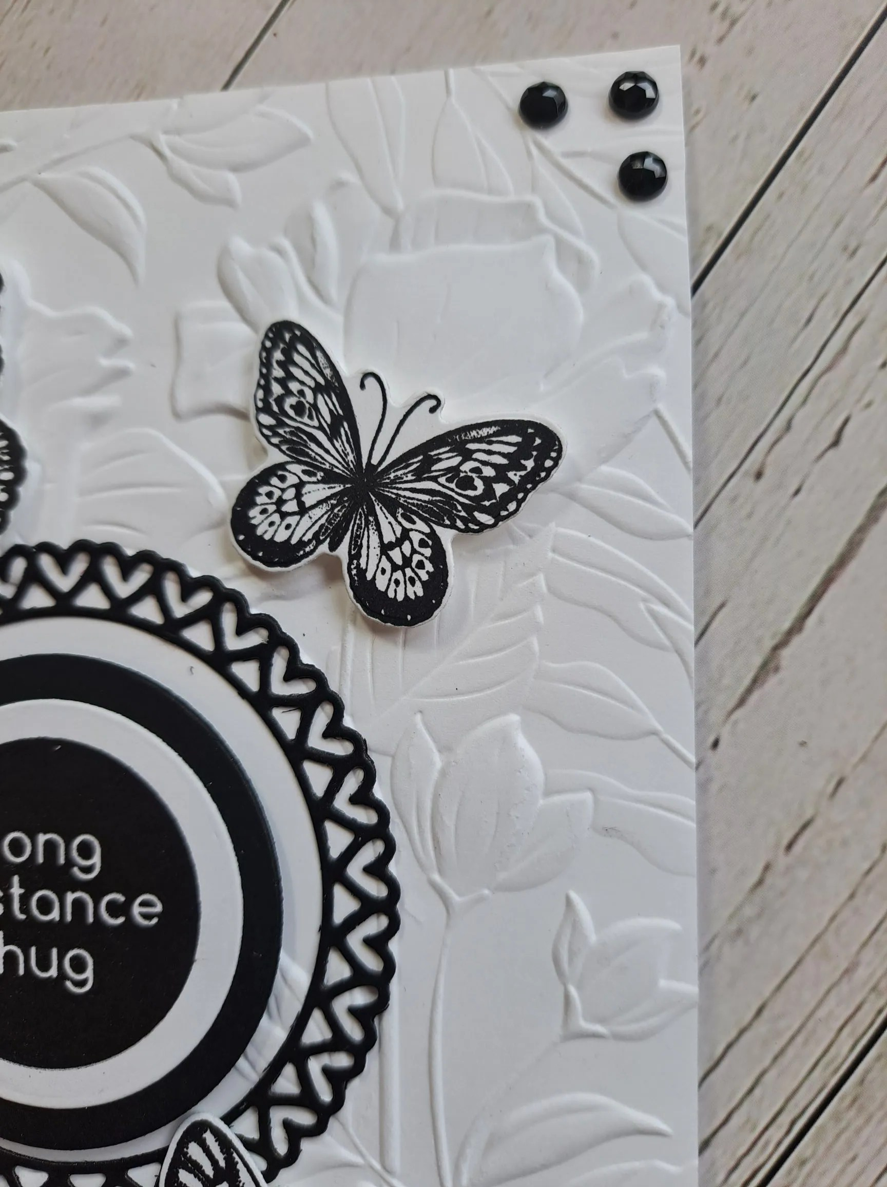 A Briar Rose panel was dry embossed using a Spellbinders embossing folder, attached to the white card base, and the three die cut and sewn elements were added with 3D foam.