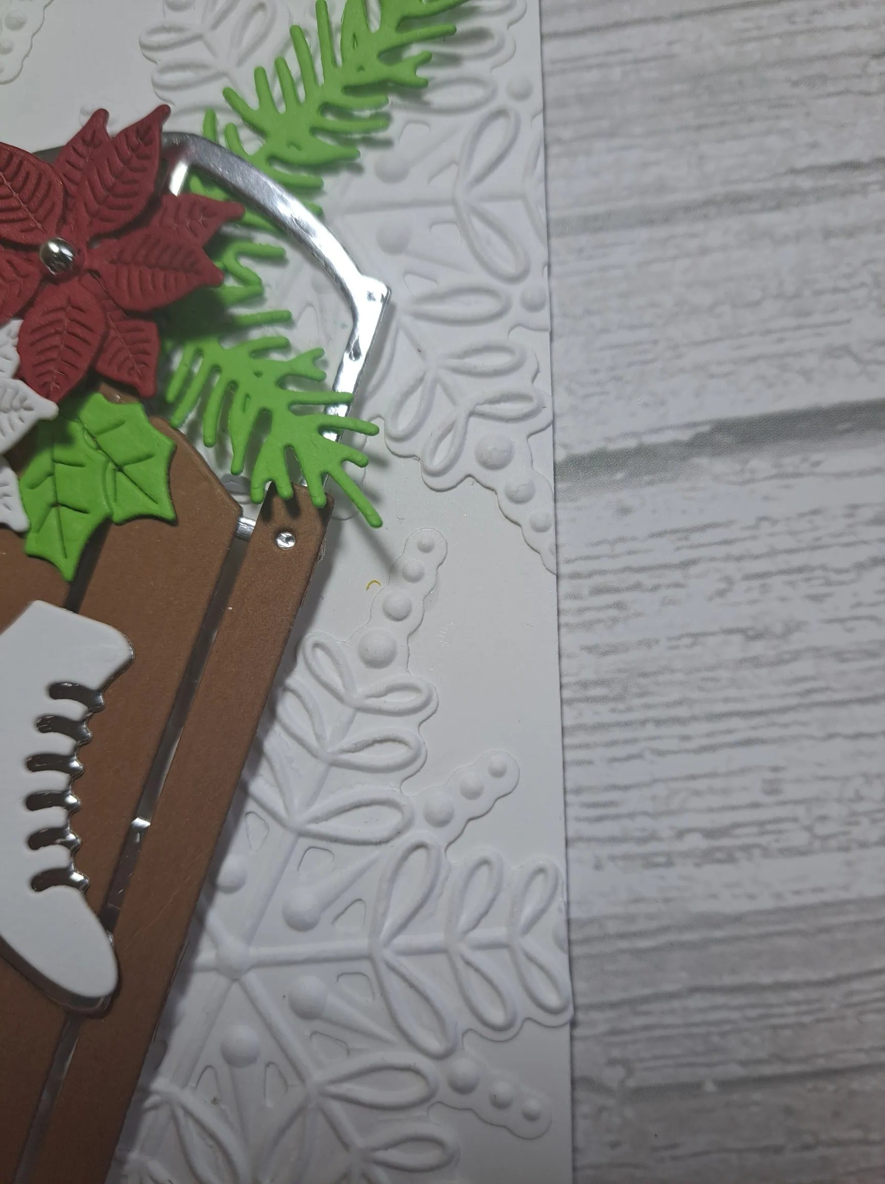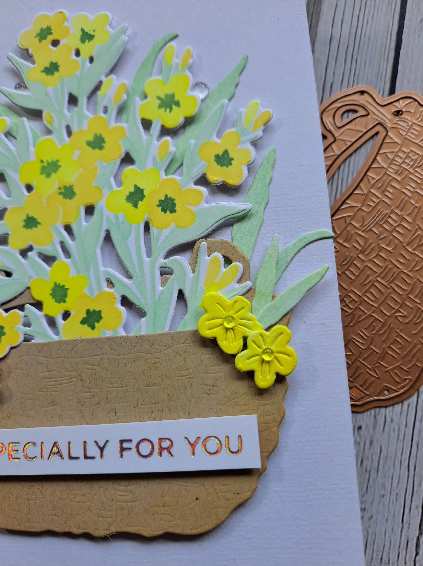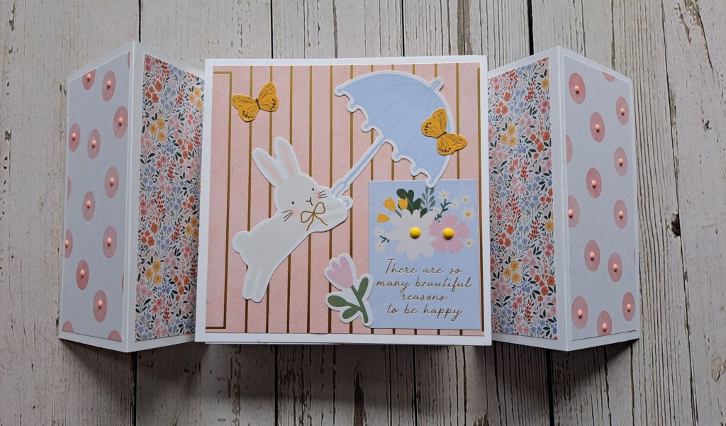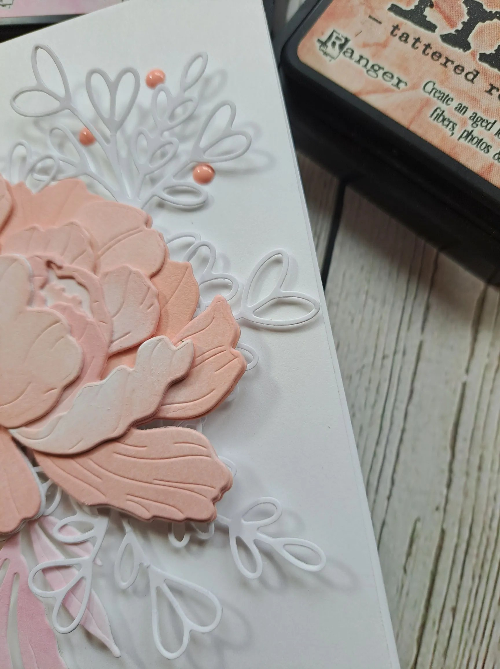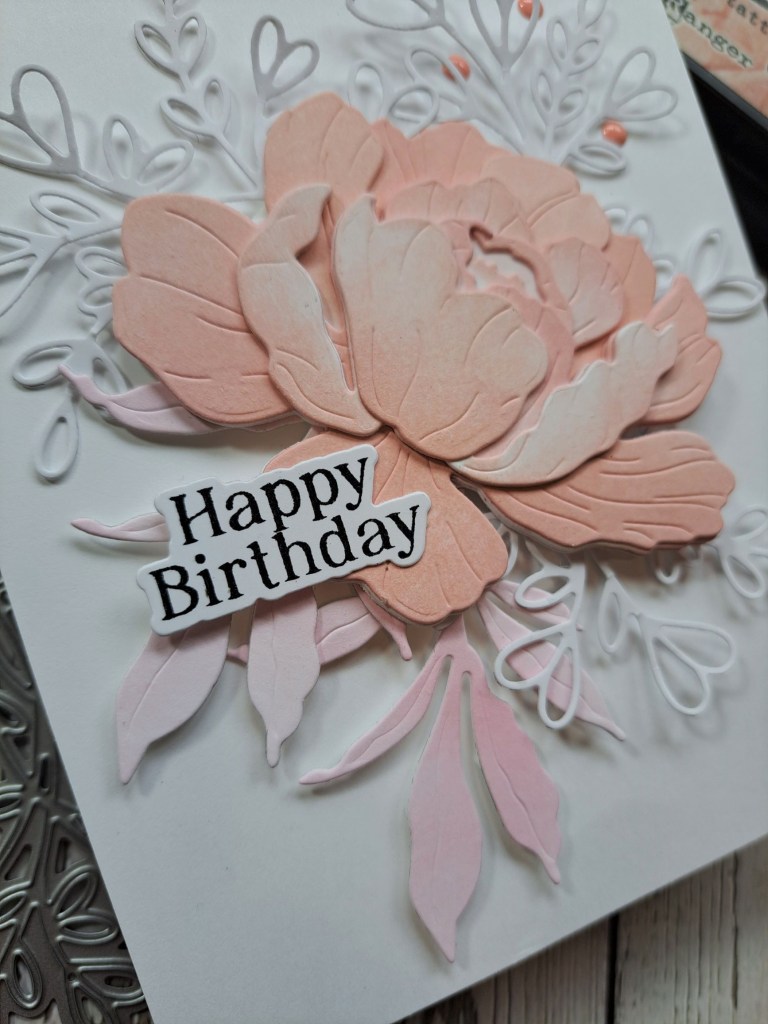 I then die cut some florals and leaves, layered them together and added to the centre panel. I decided to go with a landscape orientation, as I felt it suited the floral dies better.