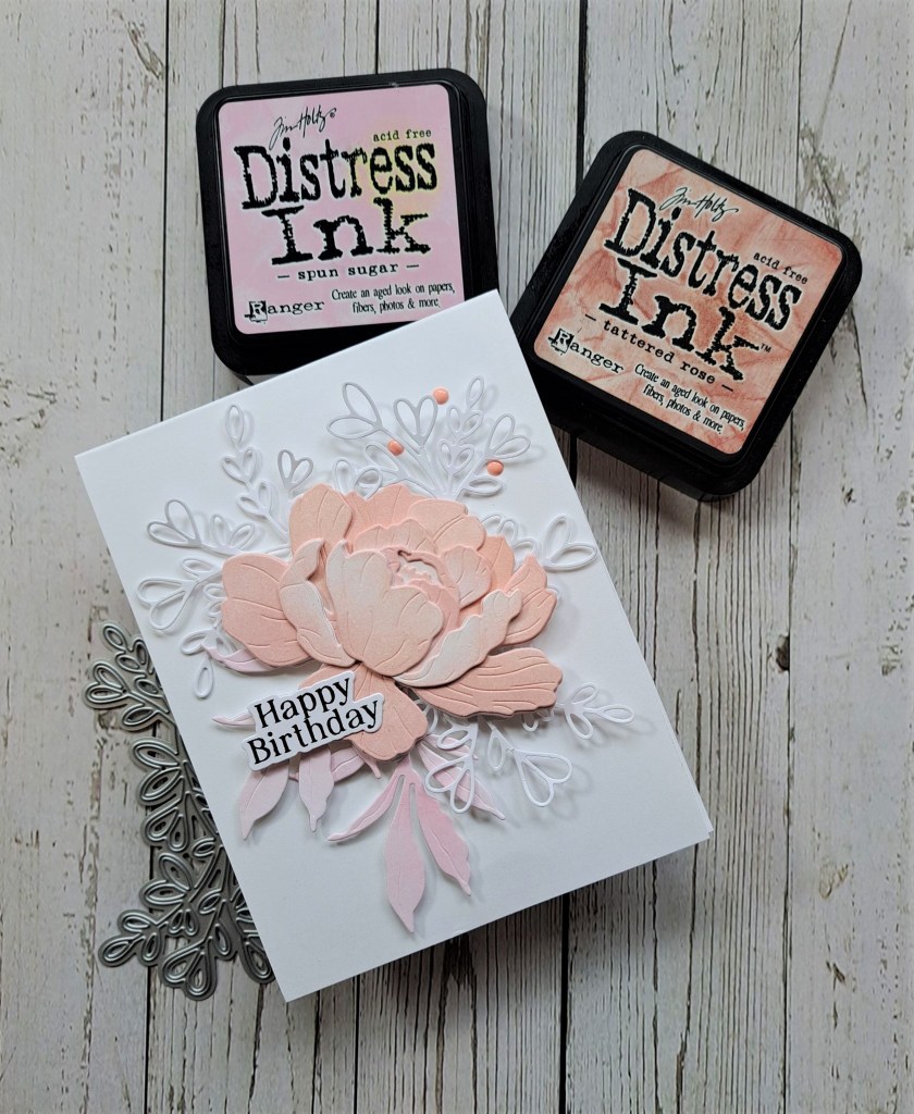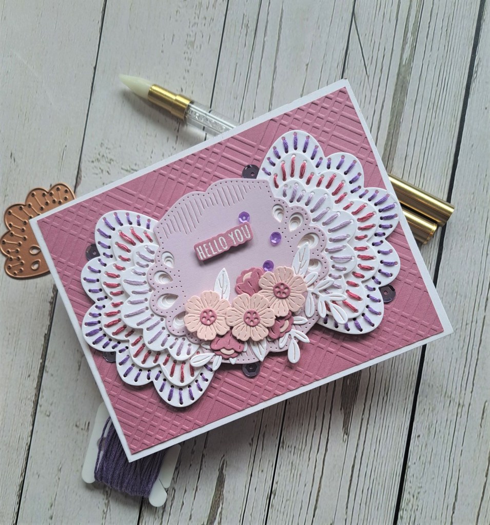 The same friend that gave me the idea of using peonies for the last post, gave me some threads to stitch some of my stitching dies. I used to cross-stitch and sew tapestry many years ago, but when I started to need glasses and a spotlight to sew, I gave all my stuff away.