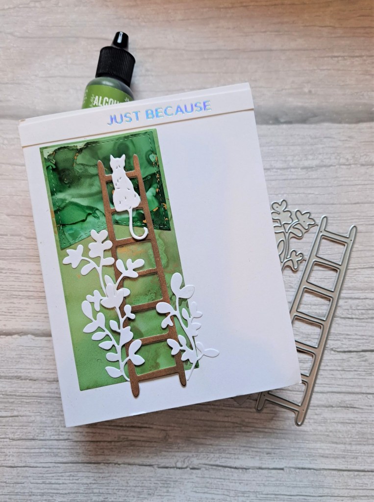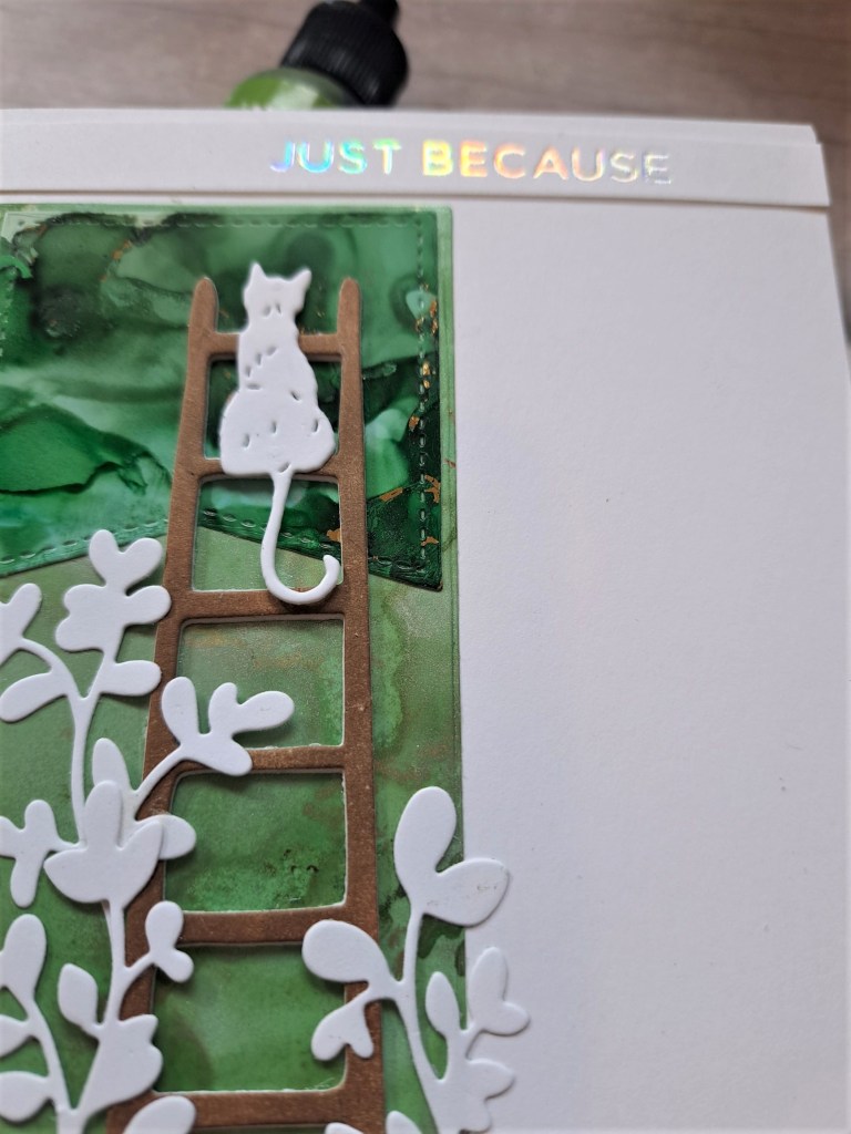 The cat and sprigs were die cut out of white so they stood out from the green background, and the ladder die cut from some brown card, layered a couple of times for dimension.
