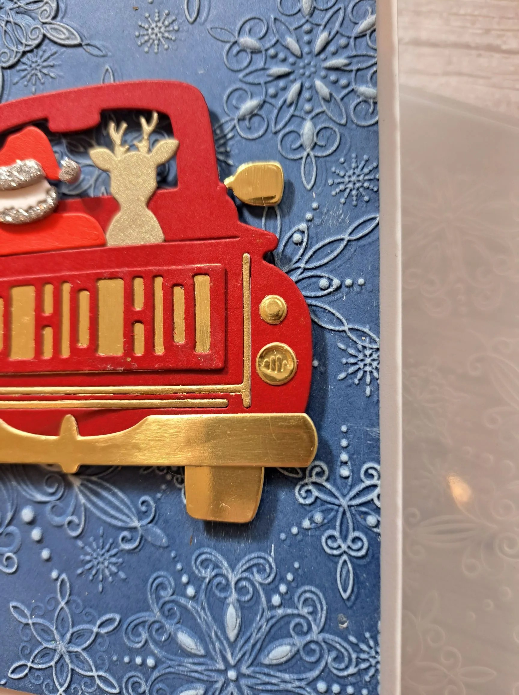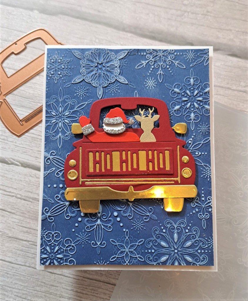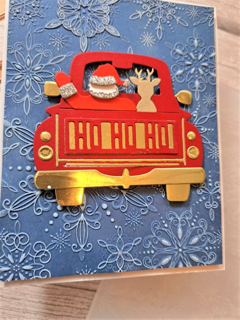 I used a previously created green ink smooshed [iece of card, and added an alcohol ink banner at the top. Some different shades of green, with a little gold on the alcohol ink portion.
