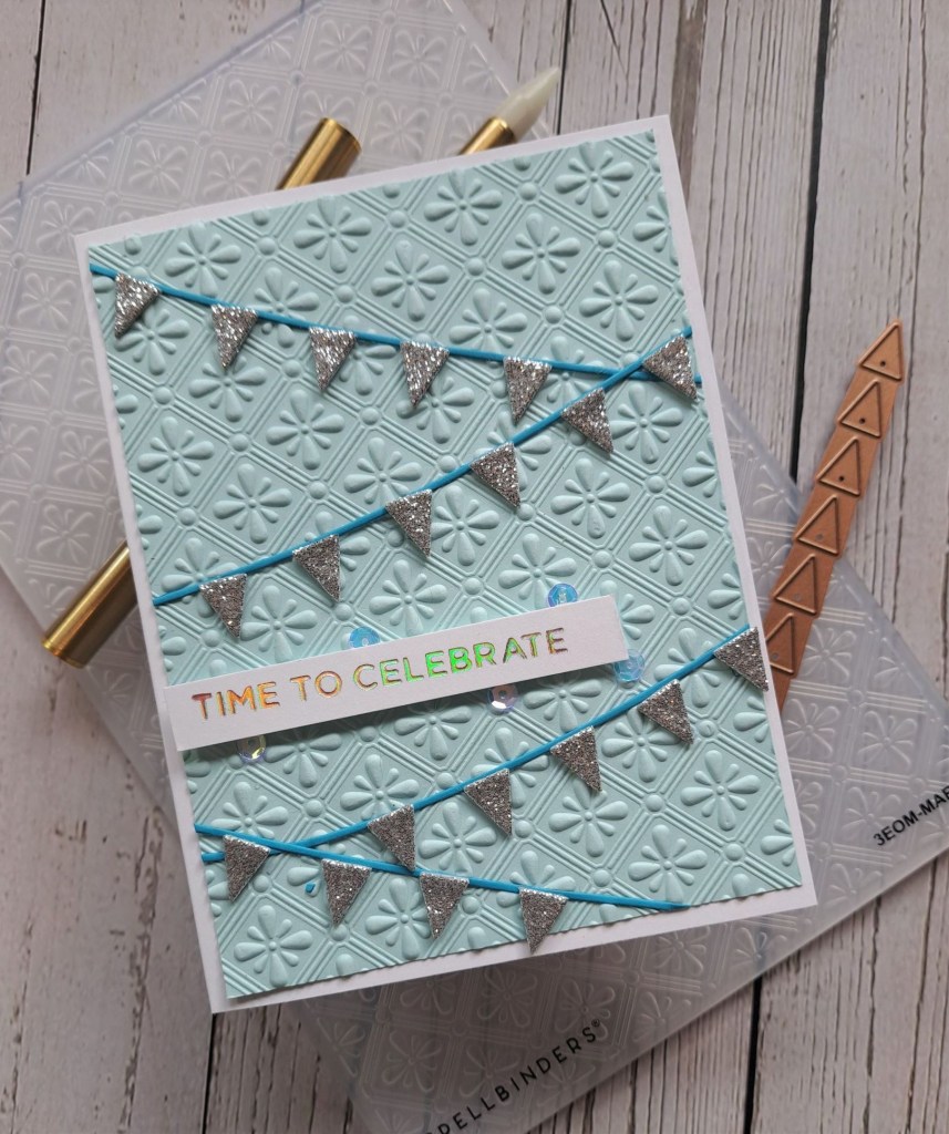 The banner was die cut with blue card, and the triangle from the Spellbinders silver glitter foam – this is o very easy to die cut.