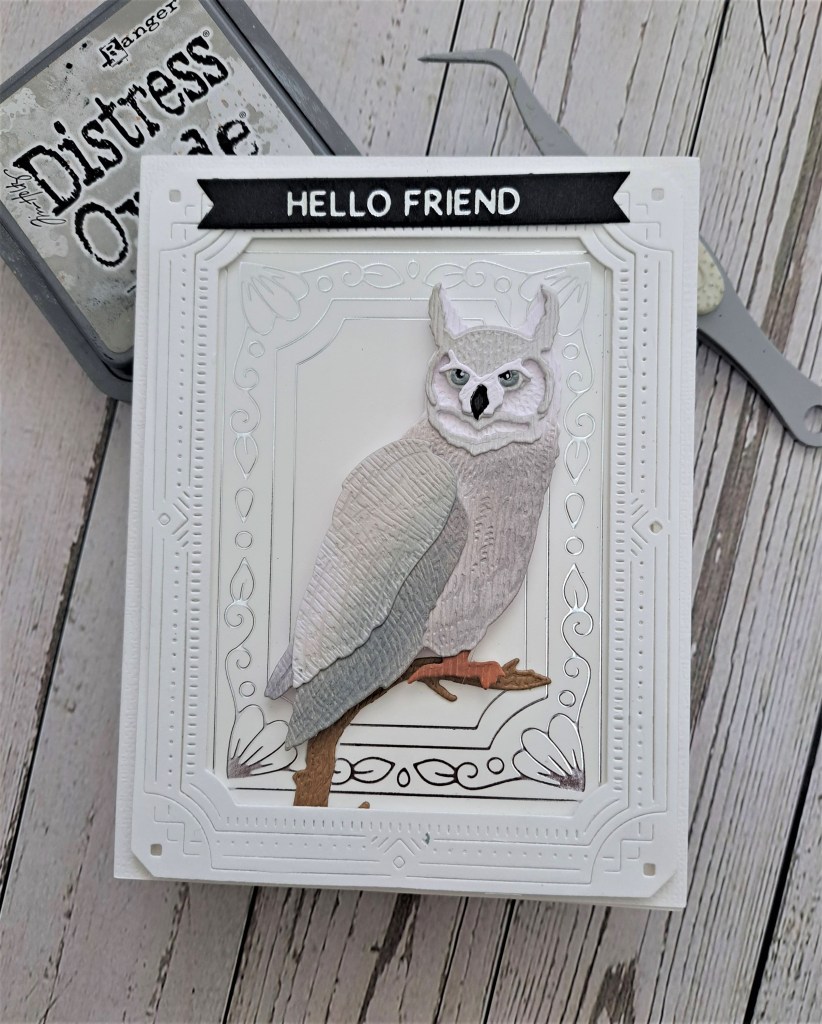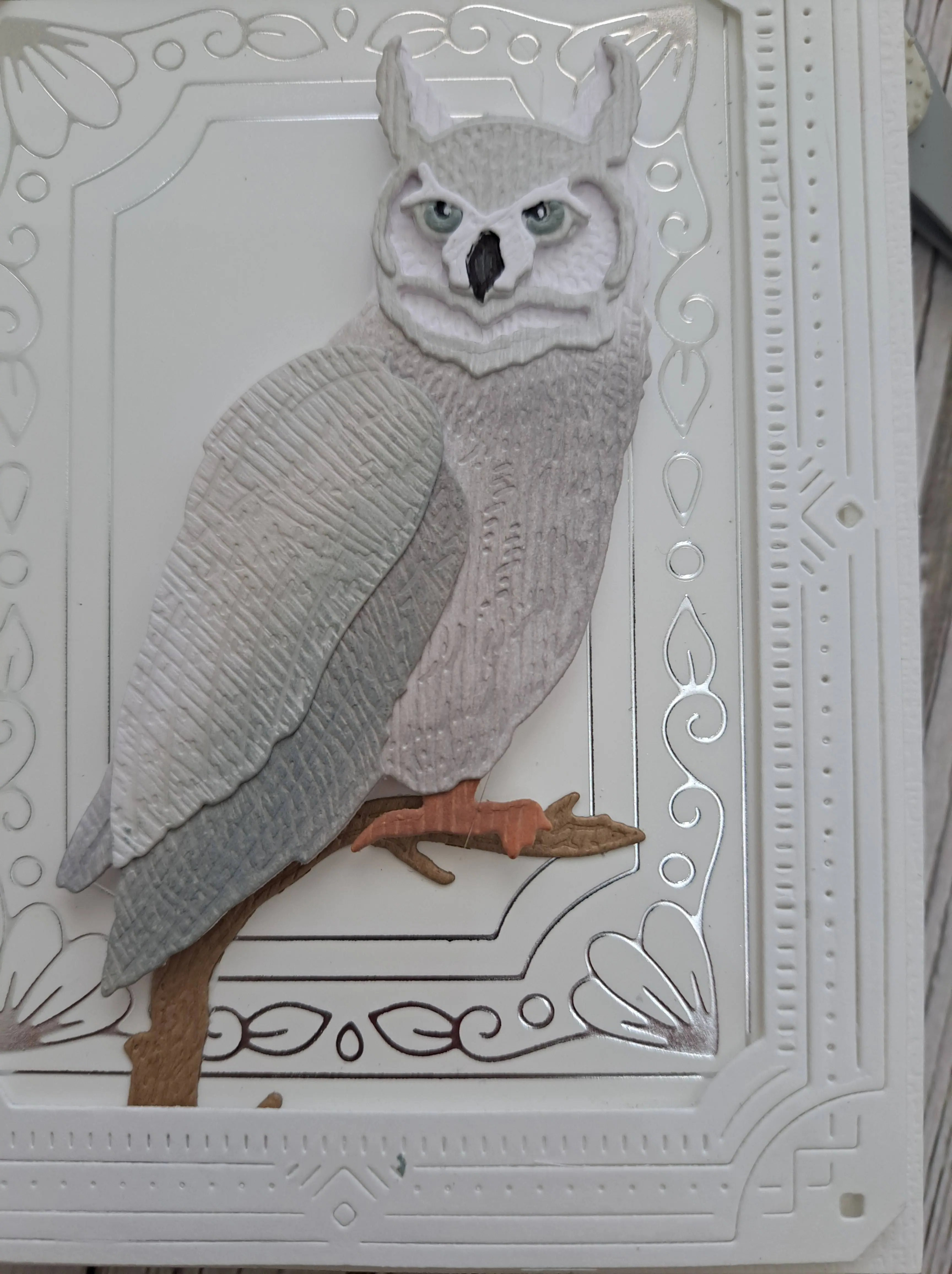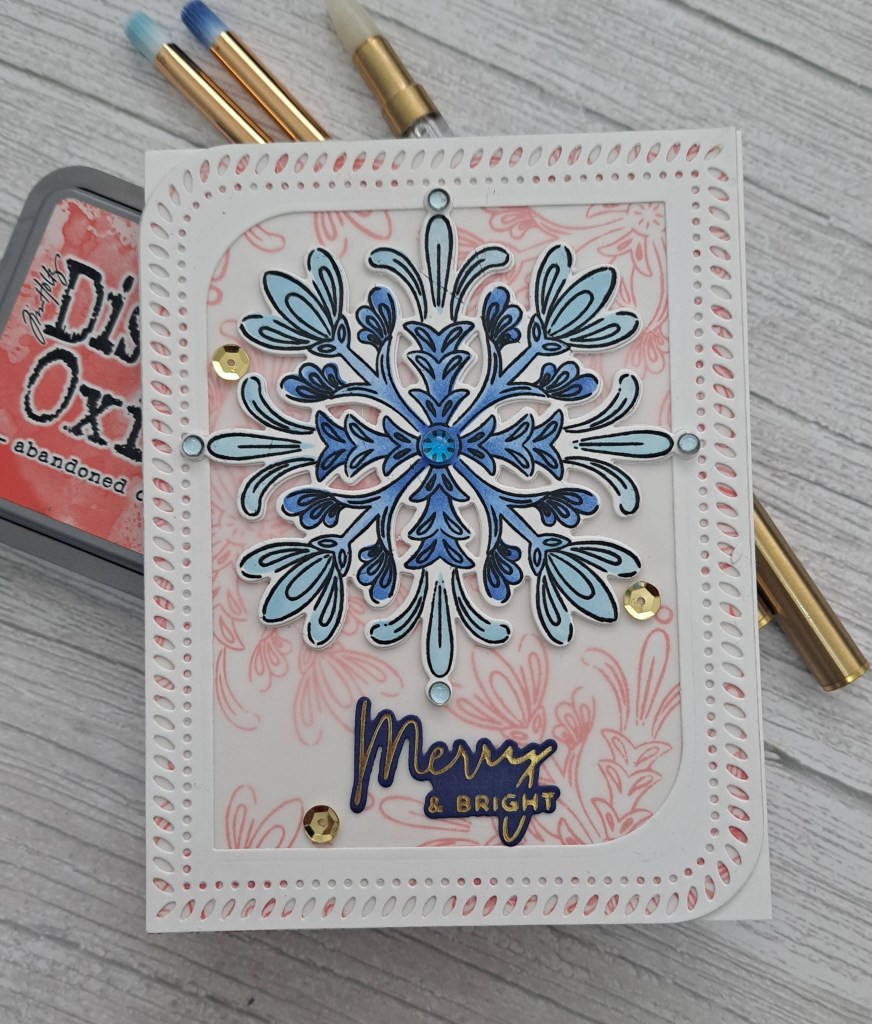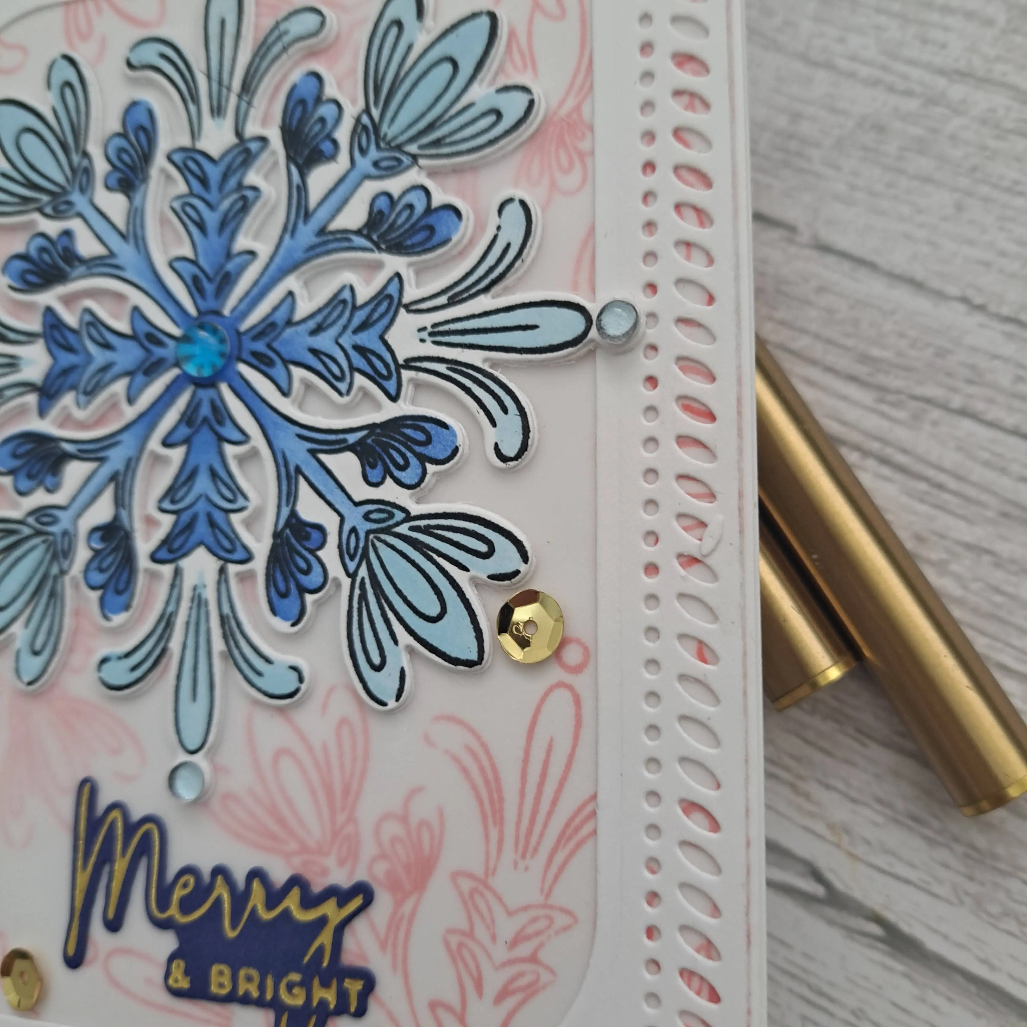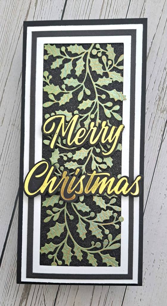 The background holly is a hot foil plate from Spellbinders, and hot foiled using gold. I then used the layering stencils to colour the images. As you can see, it is a whimsical kind of colouring – some bare areas not covered by the stencils – and I really like that look.