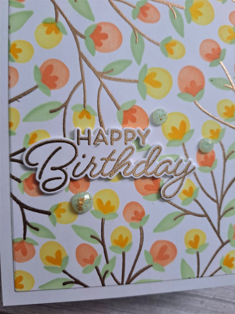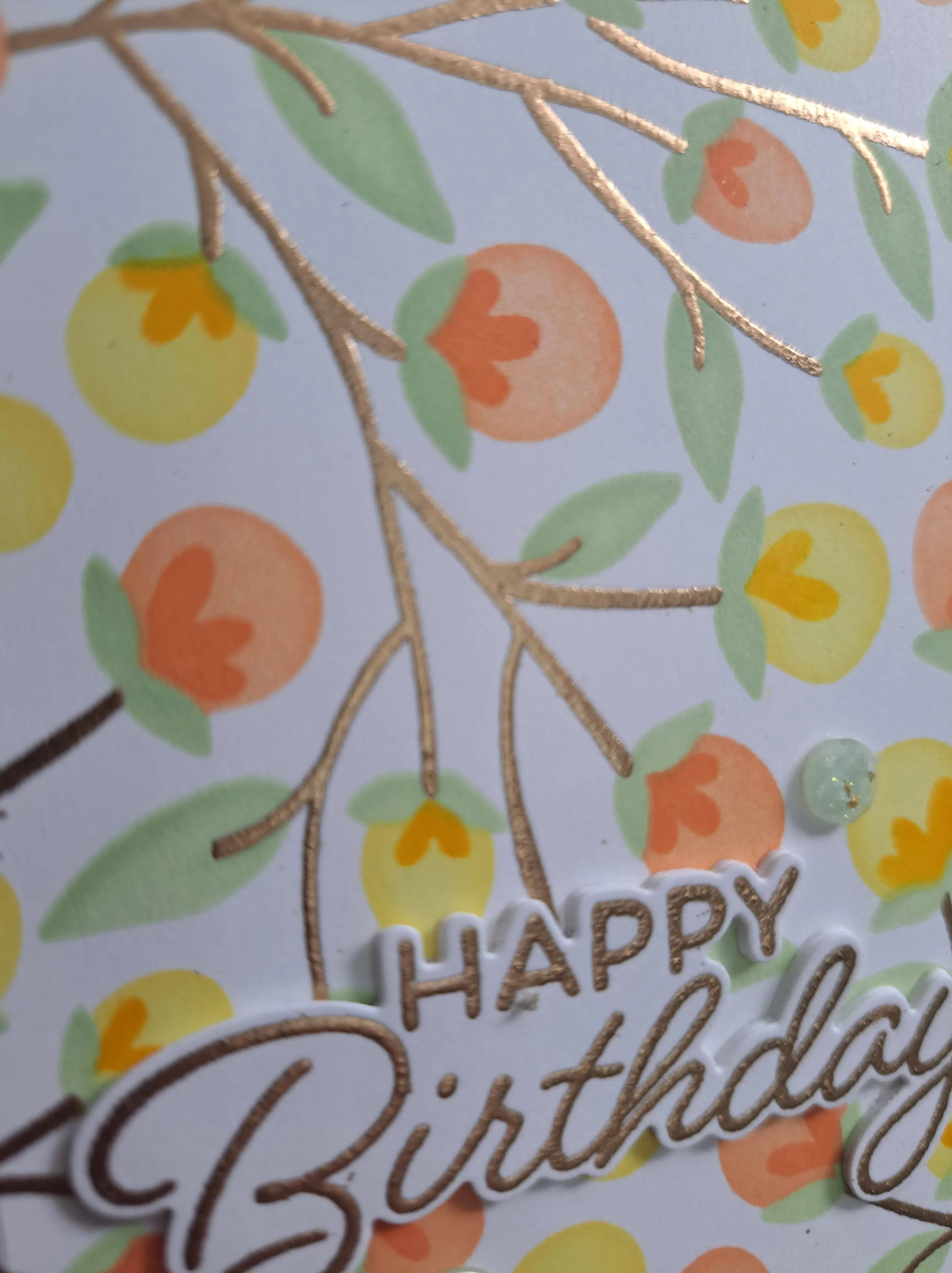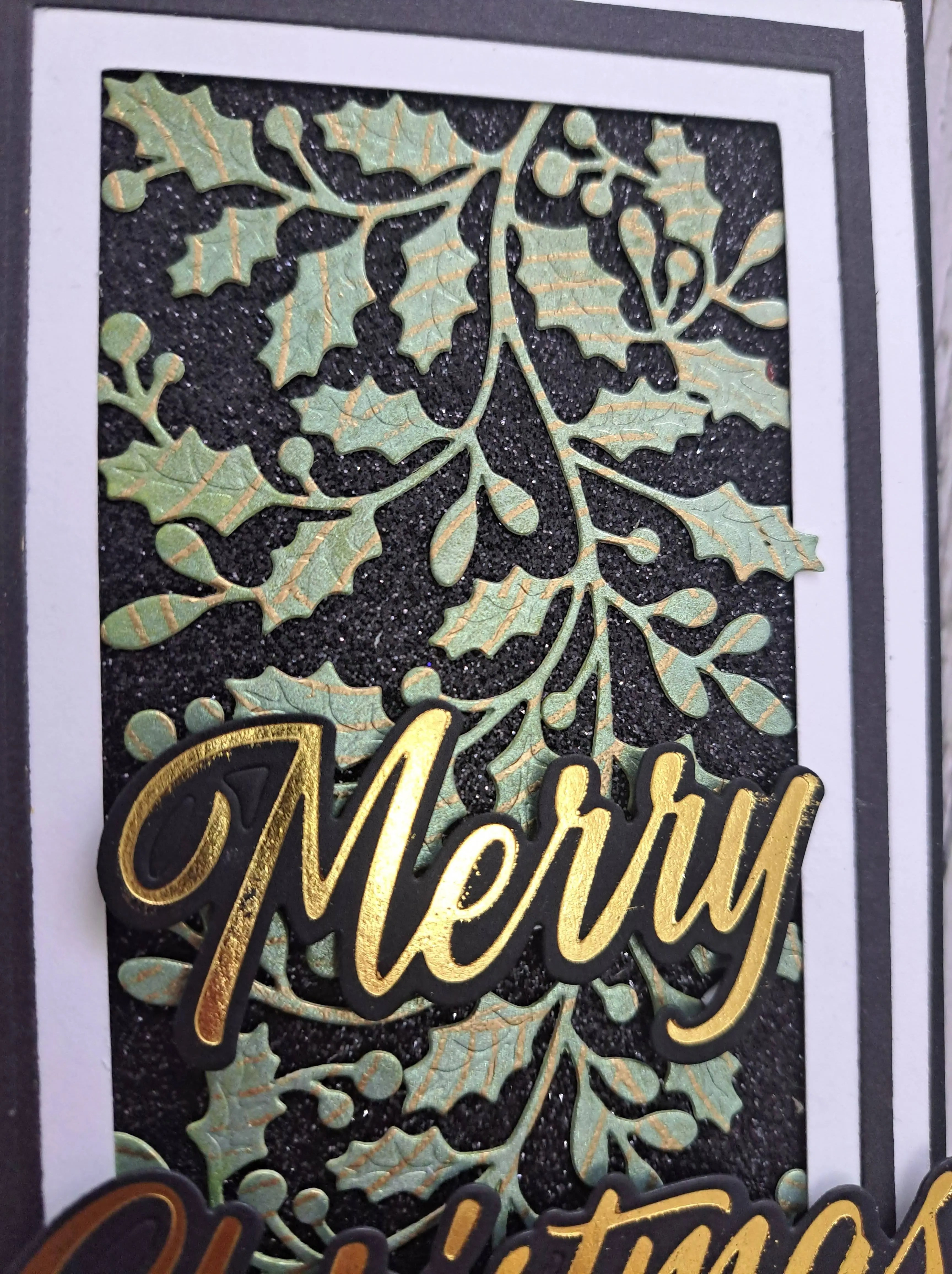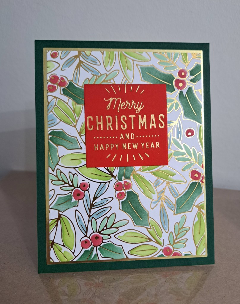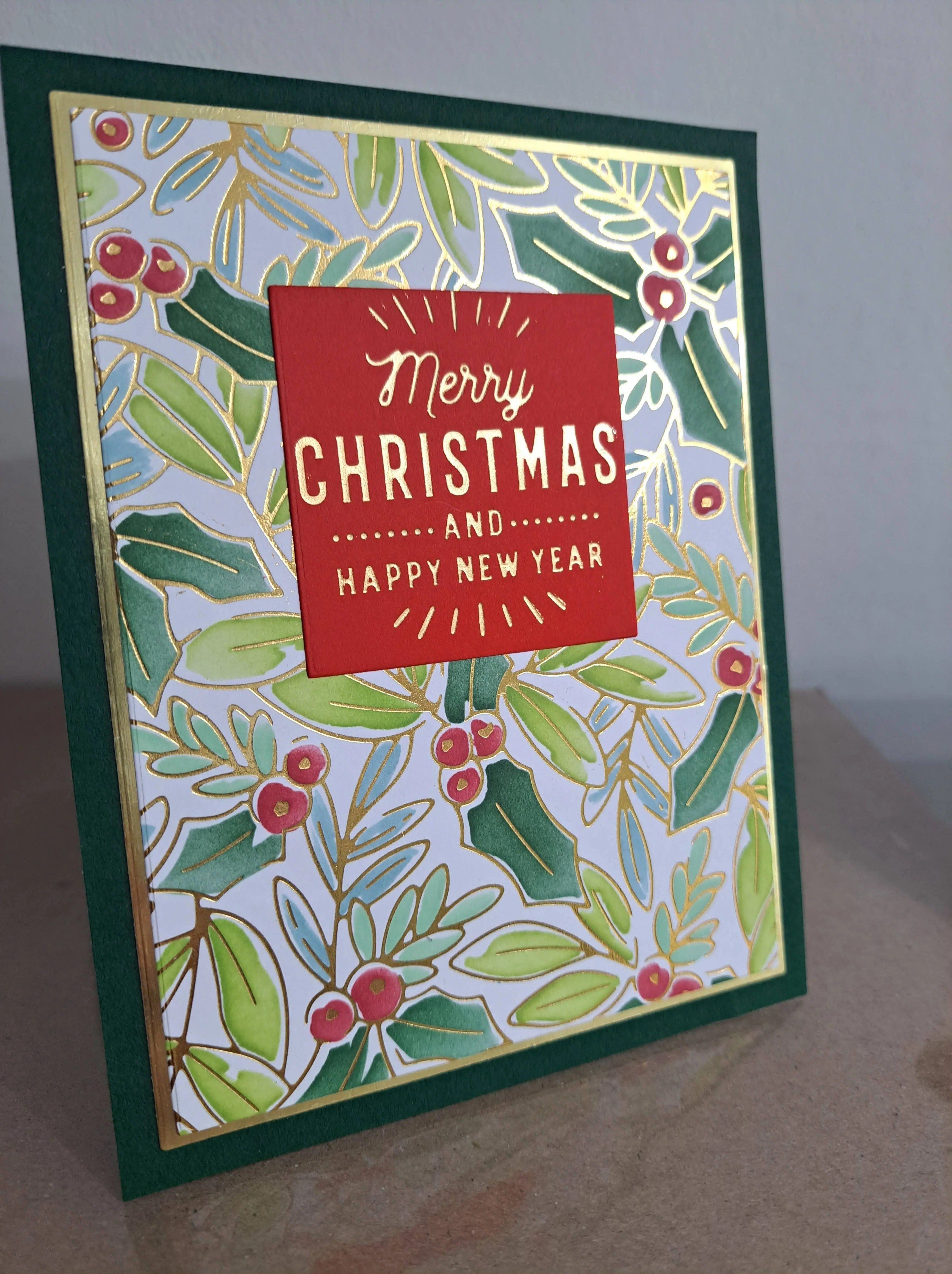 The sentiment was also hot foiled then die cut, and all layered onto a green card base with a thin gold matting layer.