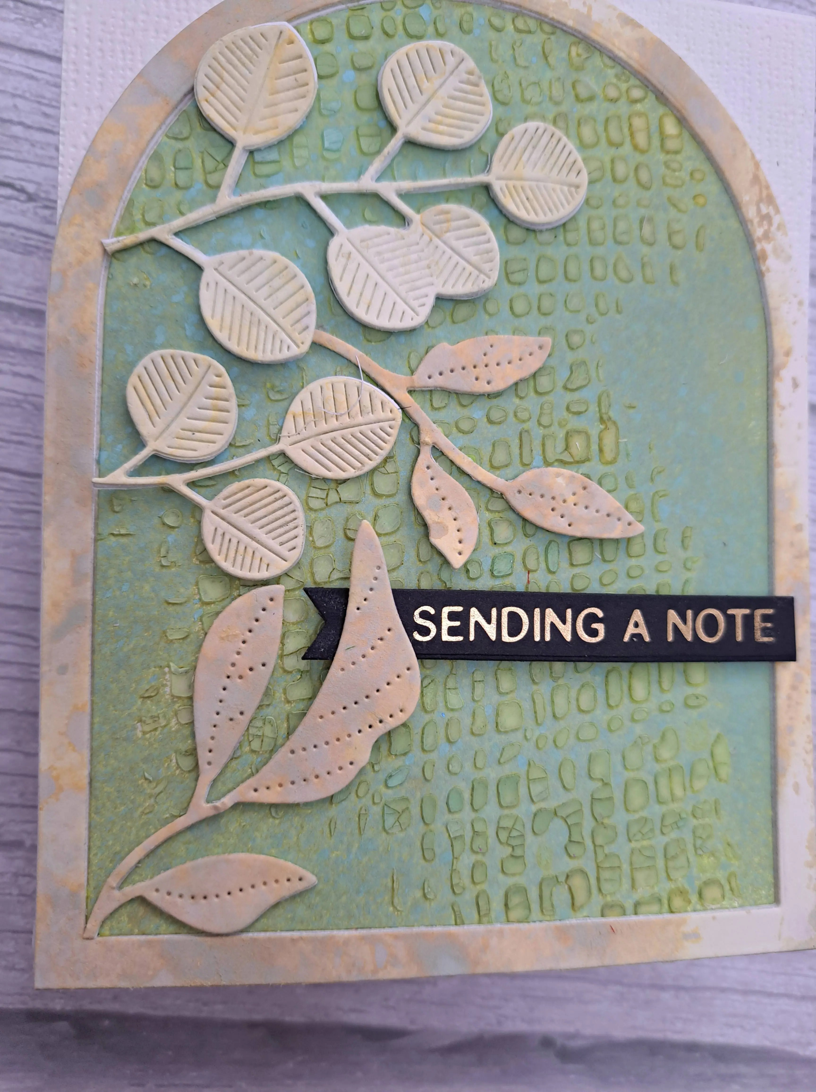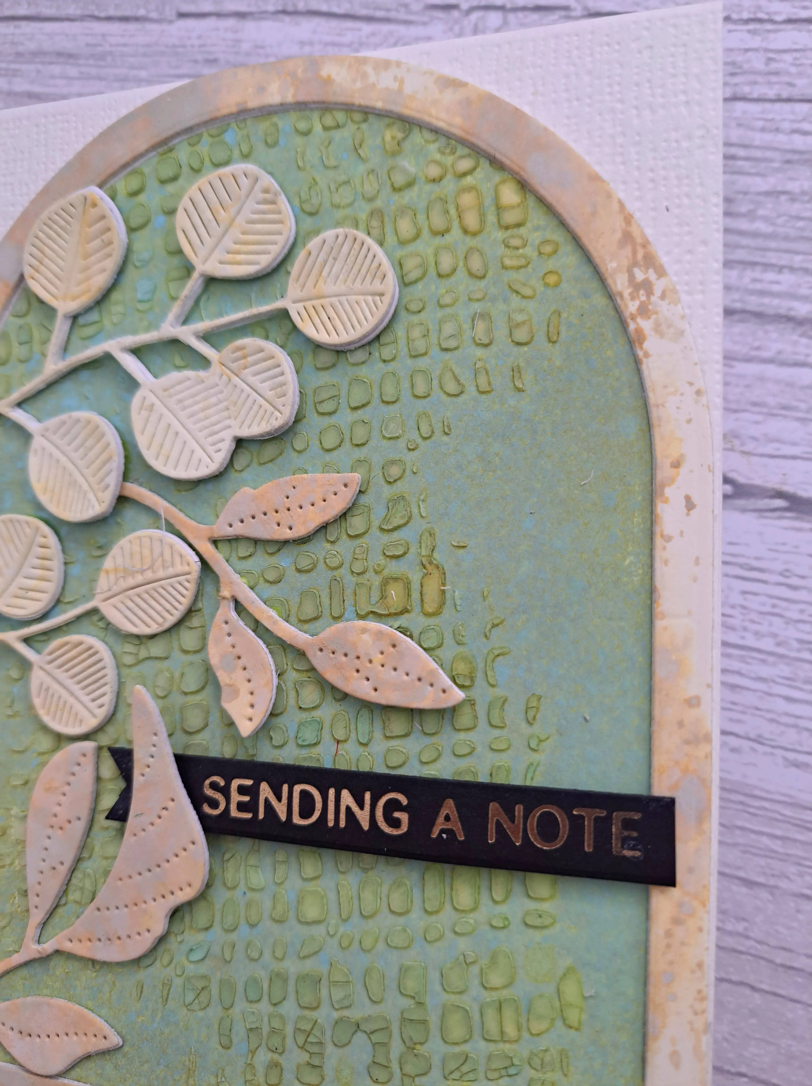 I then turned to my ink smooshed panel, and die cut the arch, and die cut the leaves from Simon Says Stamp, die cut the green crackle paste panel with the same arch.