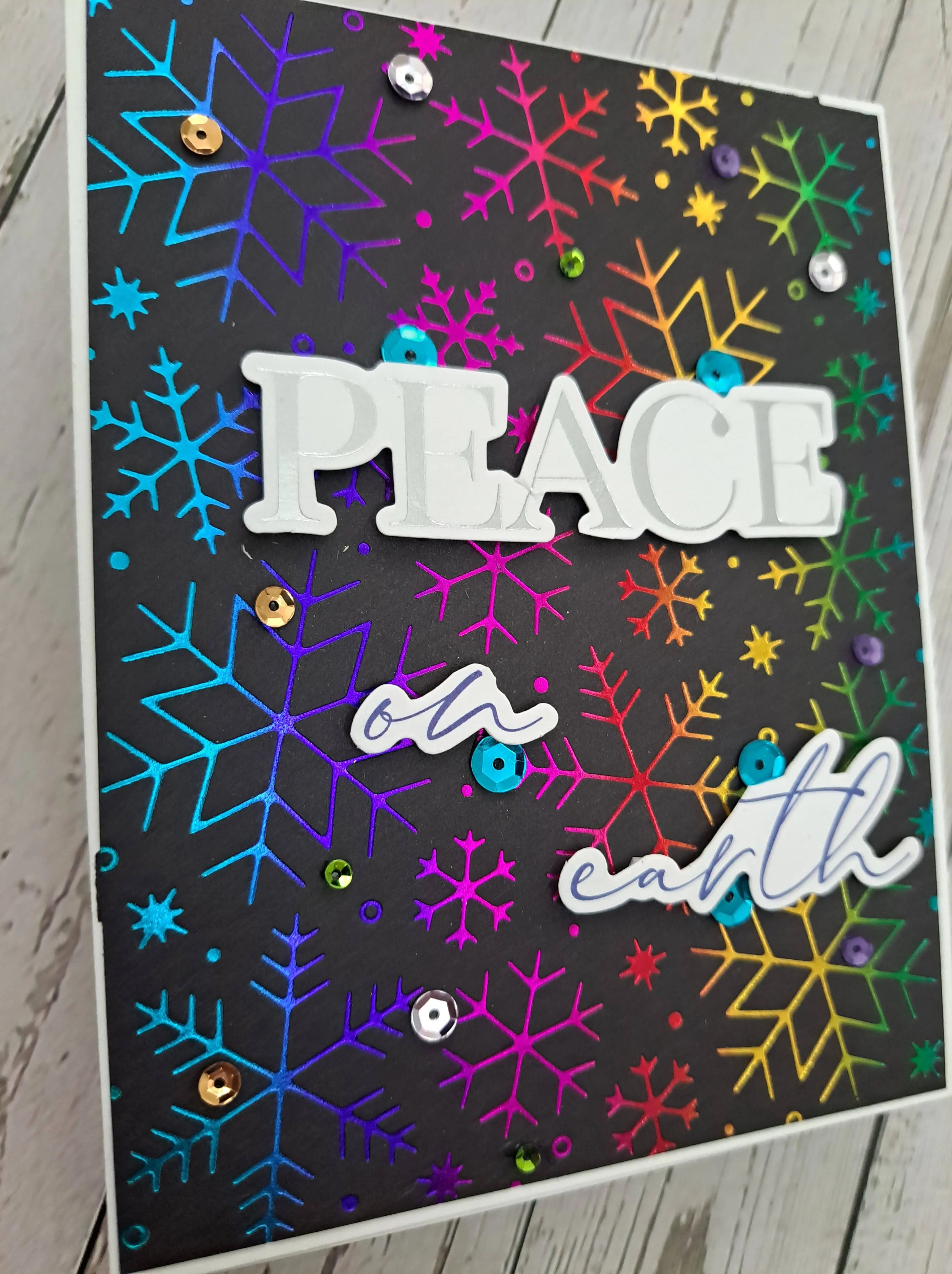 The black background panel was created using a Lawn Fawn hot foil plate and a rainbow foil. I like the shine and colours – so vivid and bright and shiny in real life.