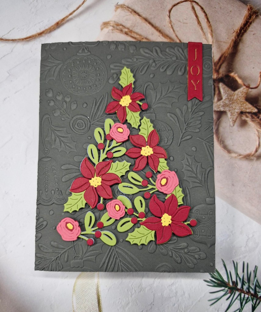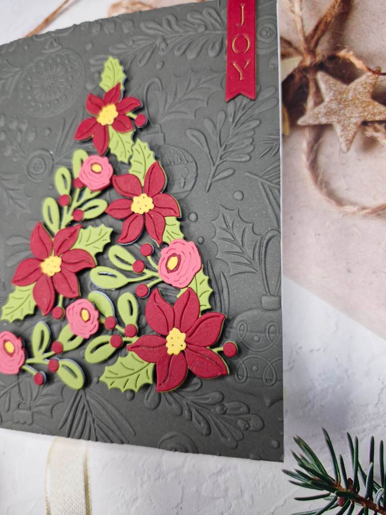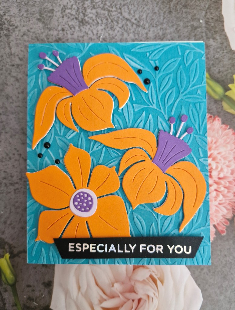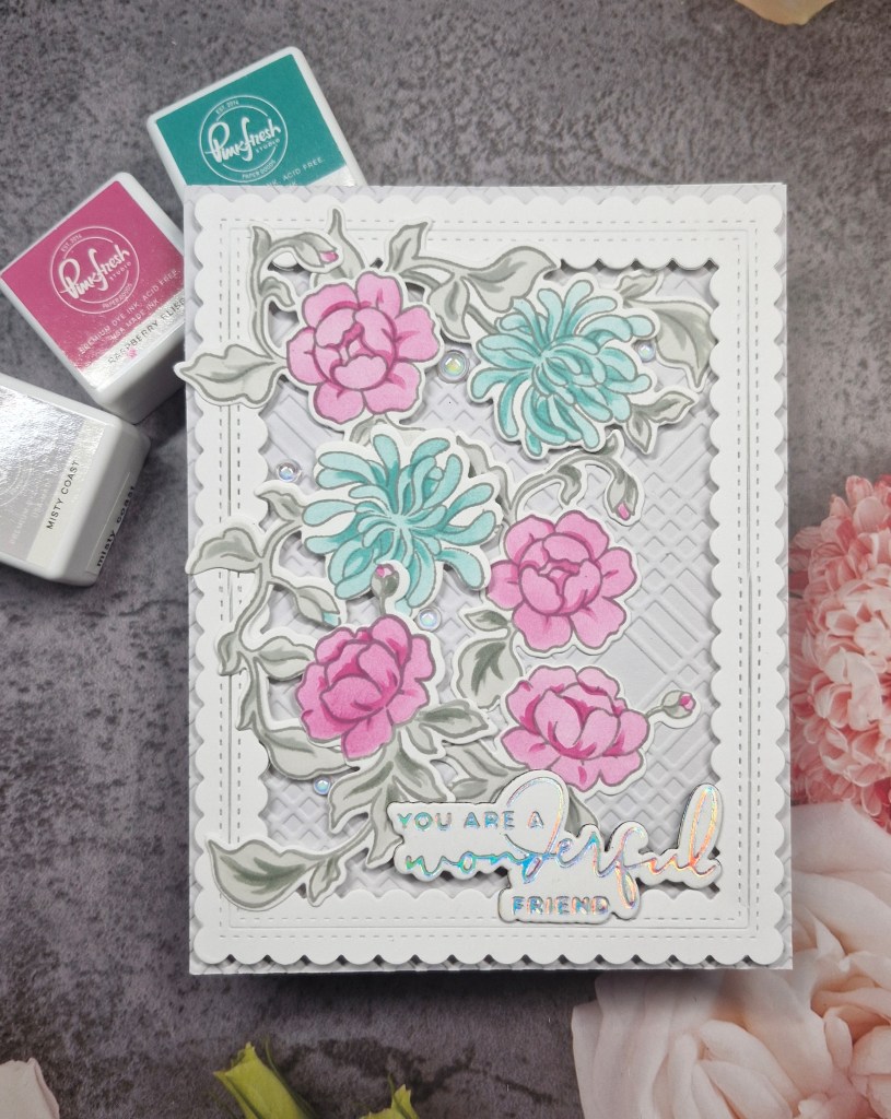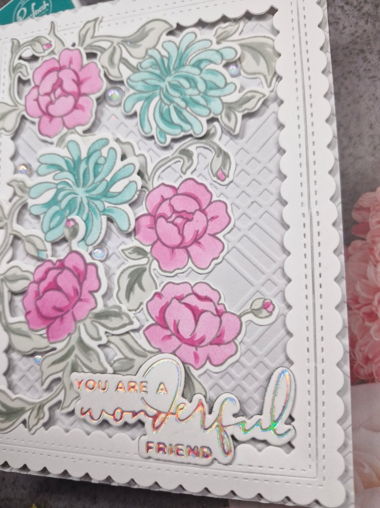I played around with the layout, knowing that the ampersand would be sat on top of the florals – which took a little figuring out when it came to 3D foam – where to place it, and how many layers………the ampersand was die cut a couple of times and layered together for added stability, and also ended up with 2 or 3 layers of itty bitty 3D foam pieces – I do like to make my life harder….!