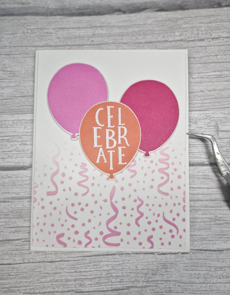 I first created the background panel for the front of the card by ink blending through a stencil. I then stamped the balloons, heat embossed the sentiment in white, then used the matching dies to cut them out.