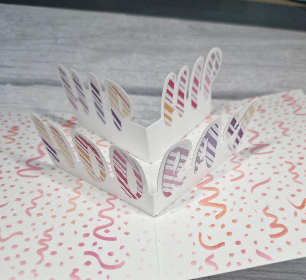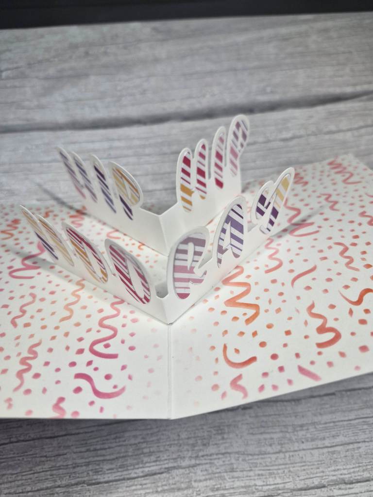 Then turning to the inside of the card and the pop-up element, I used the same stencil and all three ink colours to cover the whole of the inside, die cut the letters from some striped rainbow card stock, die cut the pop-up pieces, adhered the letters, then assembled the pop-up as instructed in the videos.