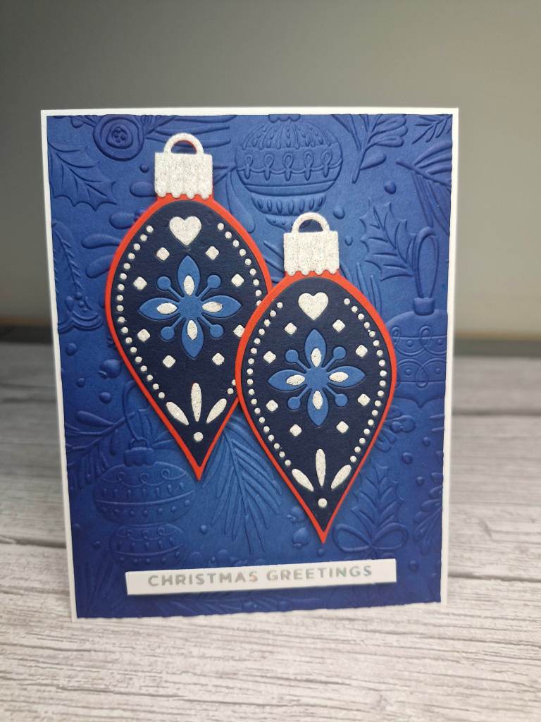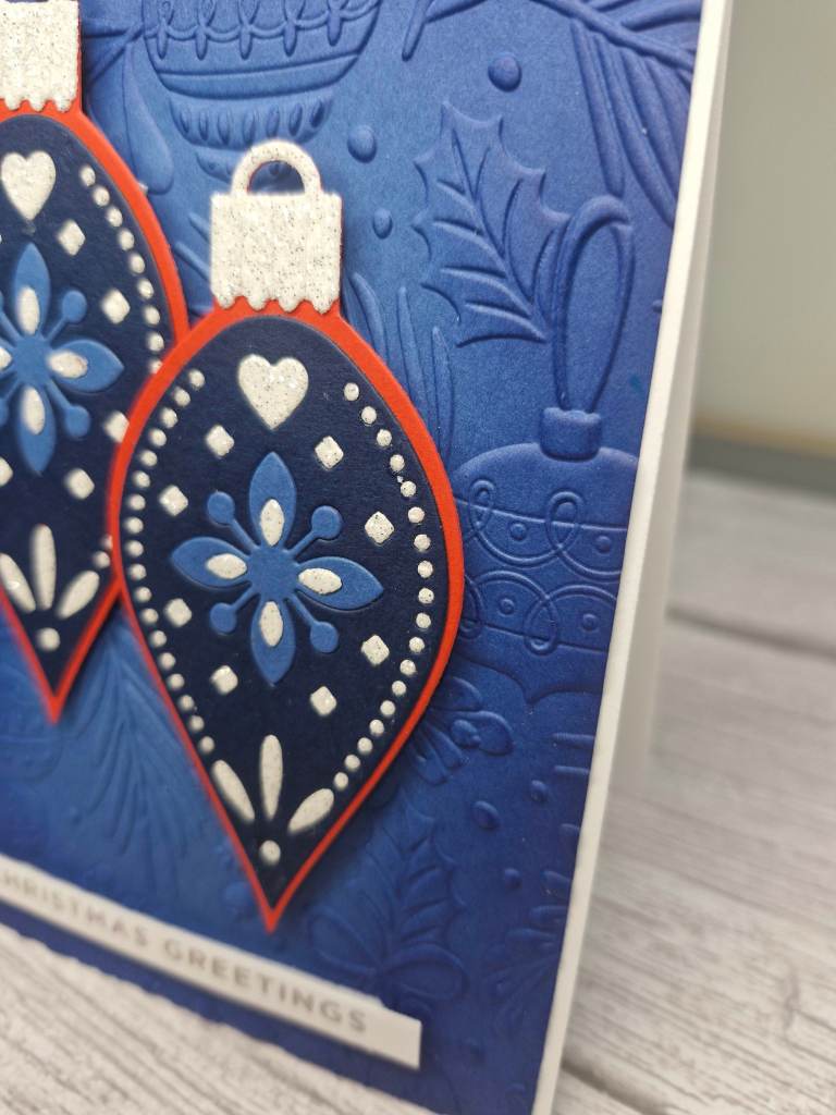 The baubles were all die cut, and all those little pieces of white and blue were die cut and inlaid back into their little places – a fiddly job, but I treated as a therapeutic endeavour.