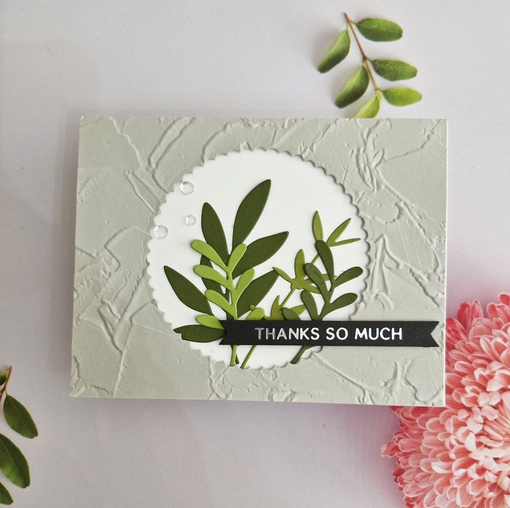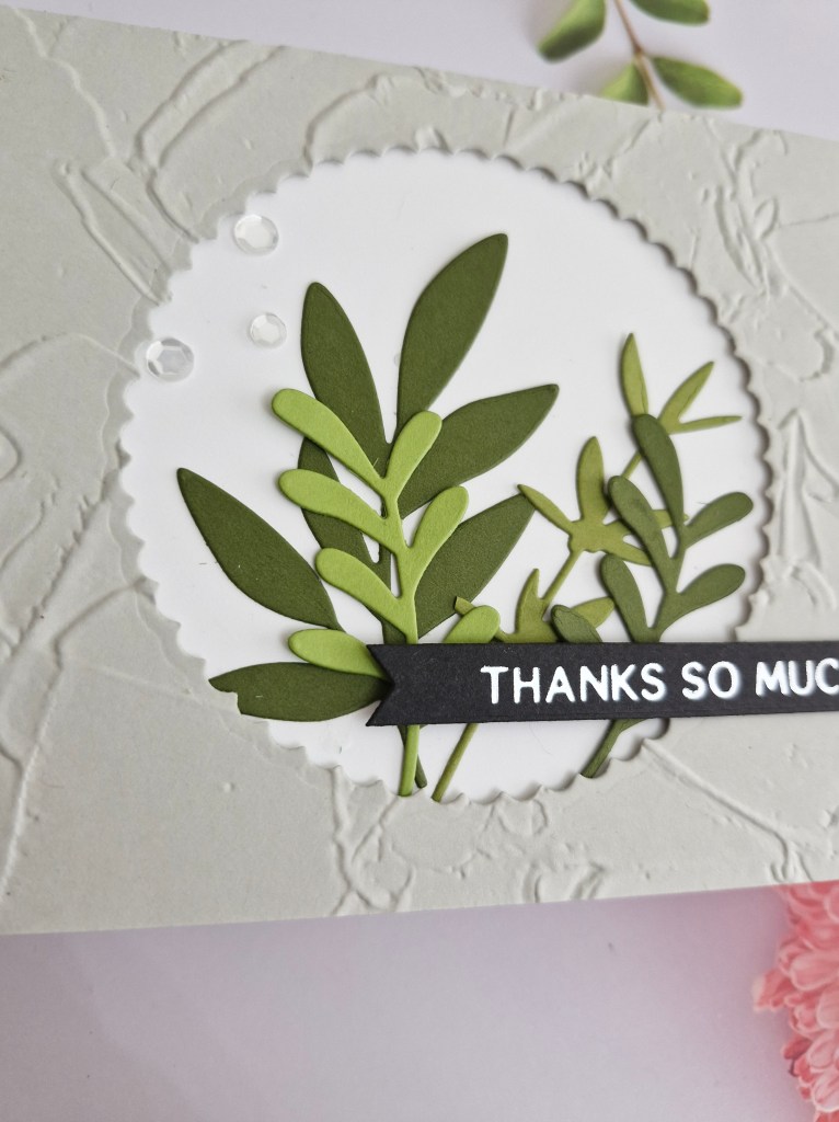 The leaves were die cut from three shades of green card stock – Spellbinders and Concord & 9th – then inserted into the aperture, glued using wet glue.