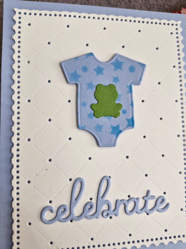 The onesie was die cut, then ink blended over the top to create the star detail. The frog was die cut and adhered.