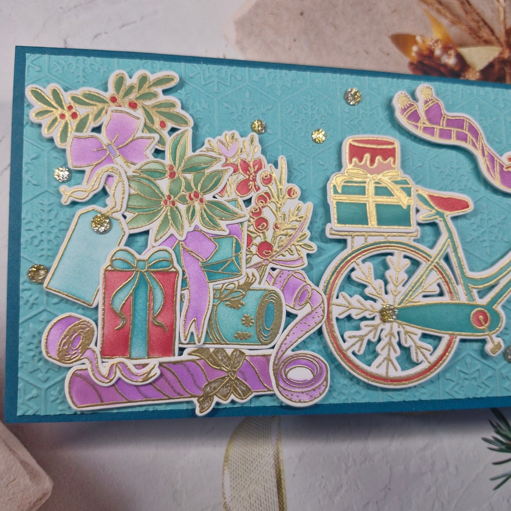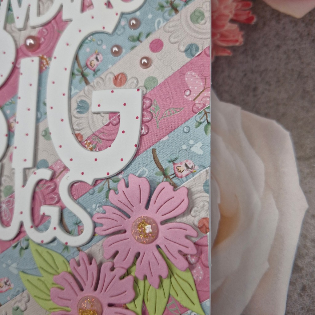 I also used some Spellbinders dies and cut out the flowers and foliage, adding as you see, and also added some pink pearl gems around and about, as well as some glittery gems for the centre of the flowers.