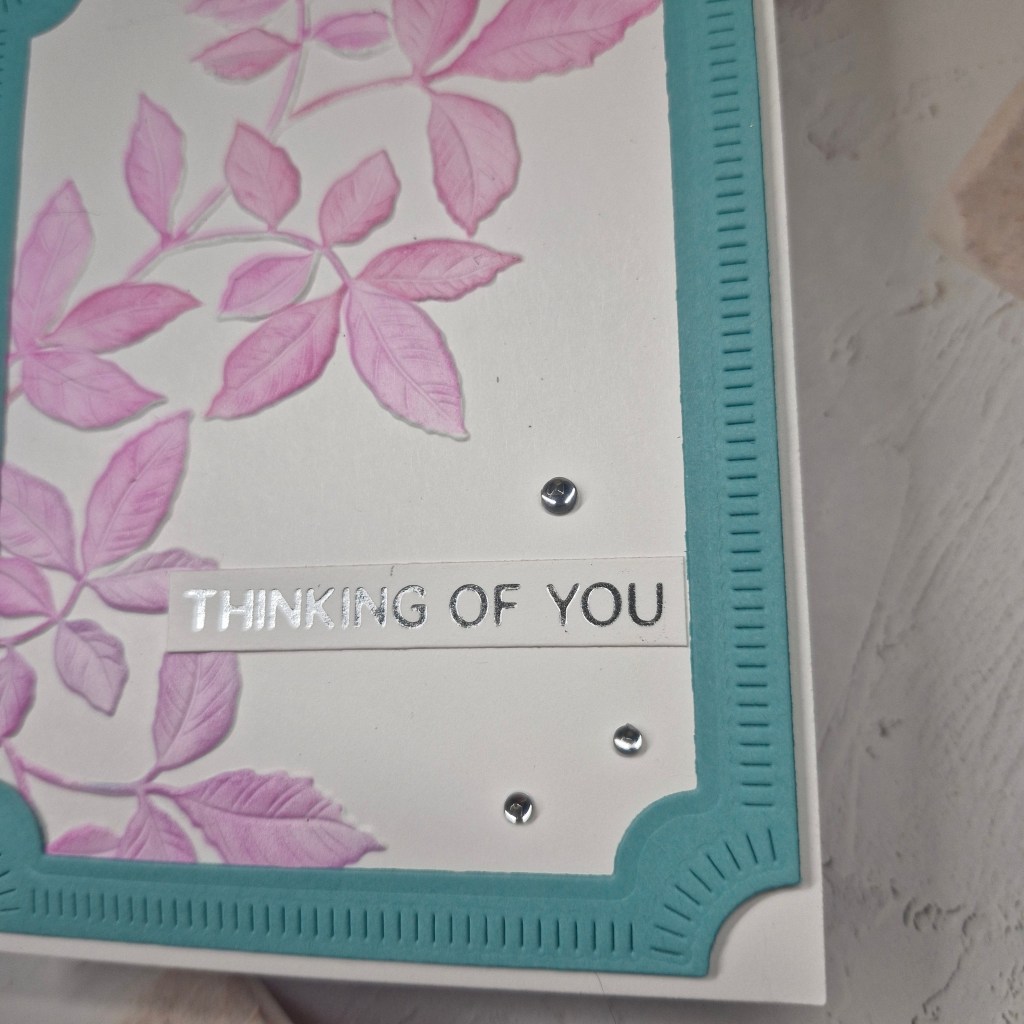 The leaves were ink blended with pink, and the Pinkfresh Studio frame was die cut using a teal card stock. The panel and frame were layered onto a white card base, the foiled sentiment added, and three silver Pinkfresh Studio silver gems also added for a little bling.
