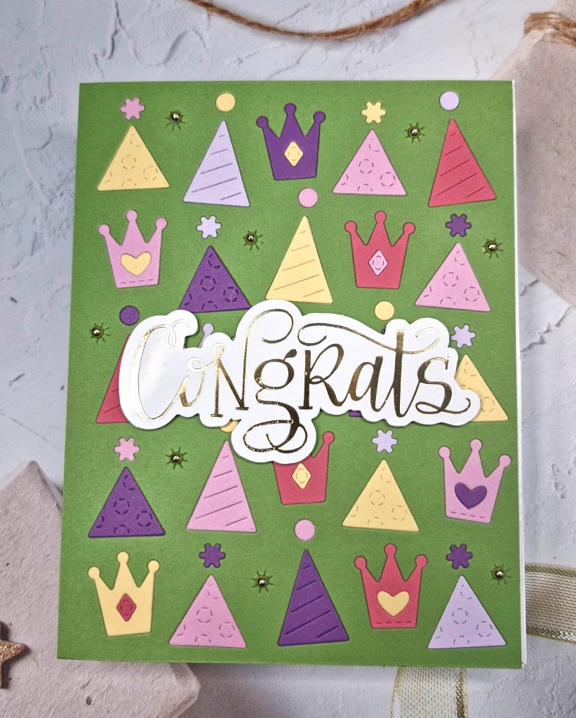 The sentiment is foiled using a Lawn Fawn hot foil set, then die cut with the matching die and attached with wet glue. I then added some clear gems for a little more interest.