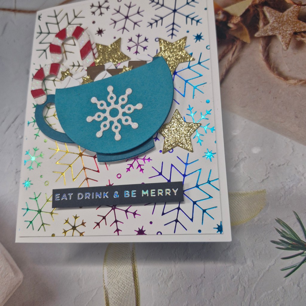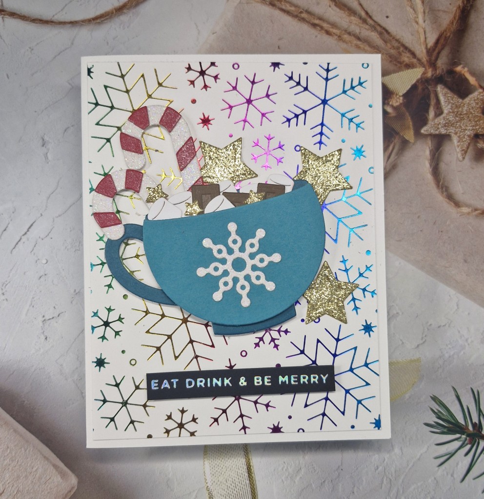 Oh what a beautiful big cup of holiday cheer right there… with such a merry and bright foiled background! So pleased you could join our Christmas Feasting (in card form!) at Jingle Belles!