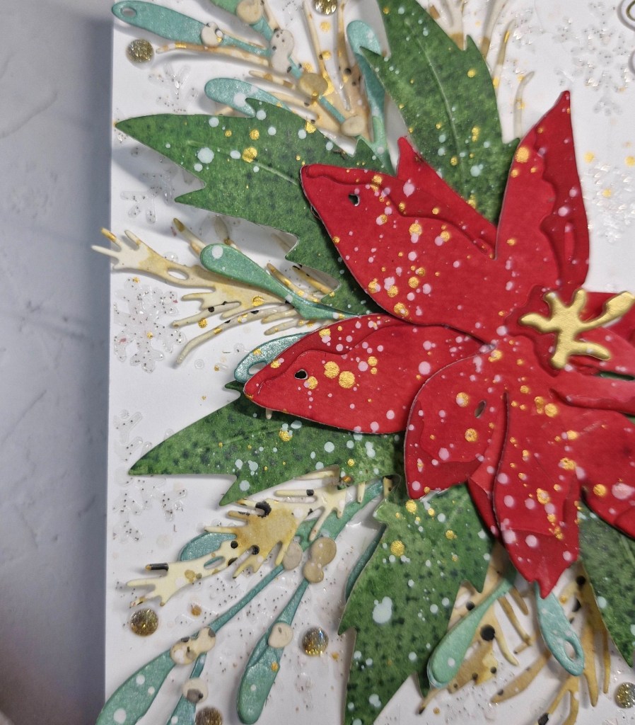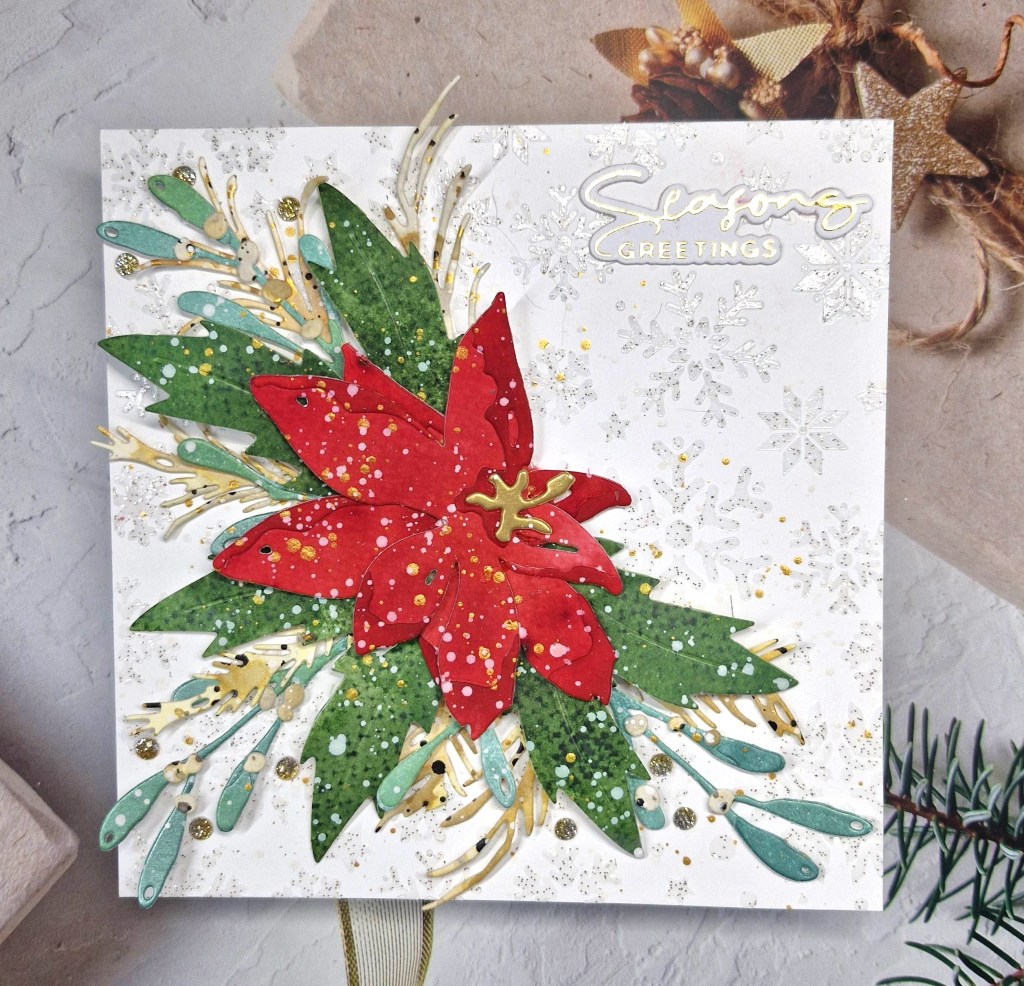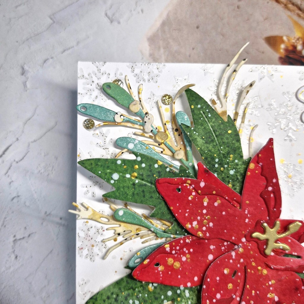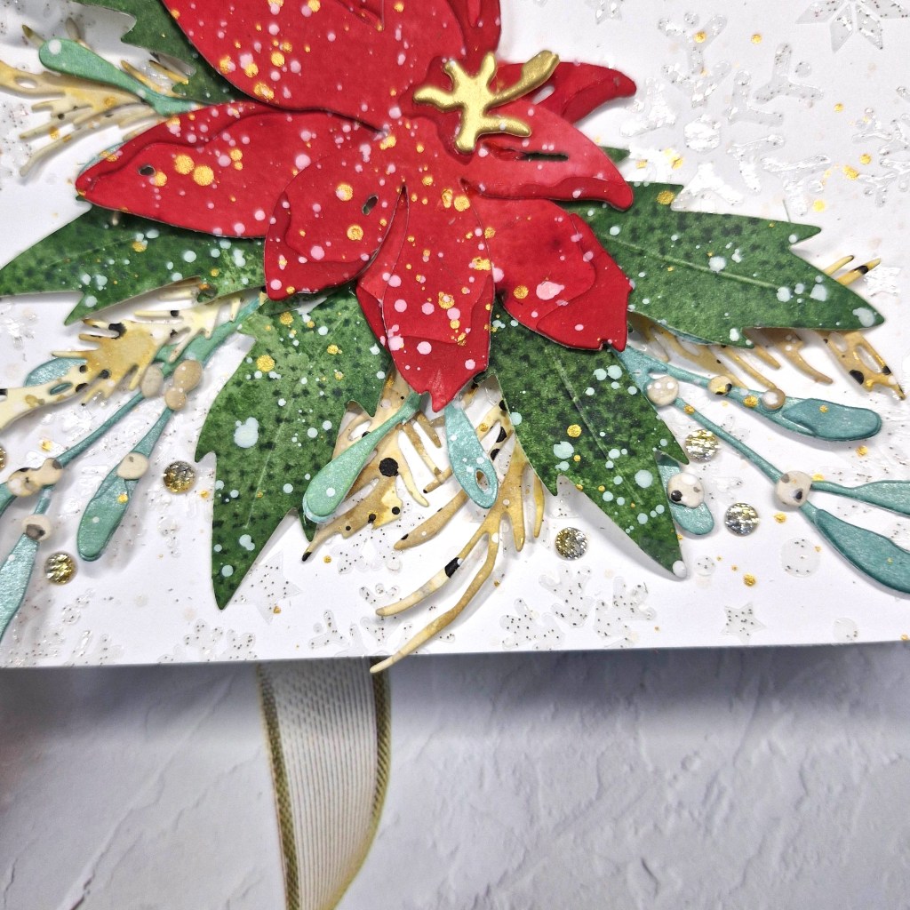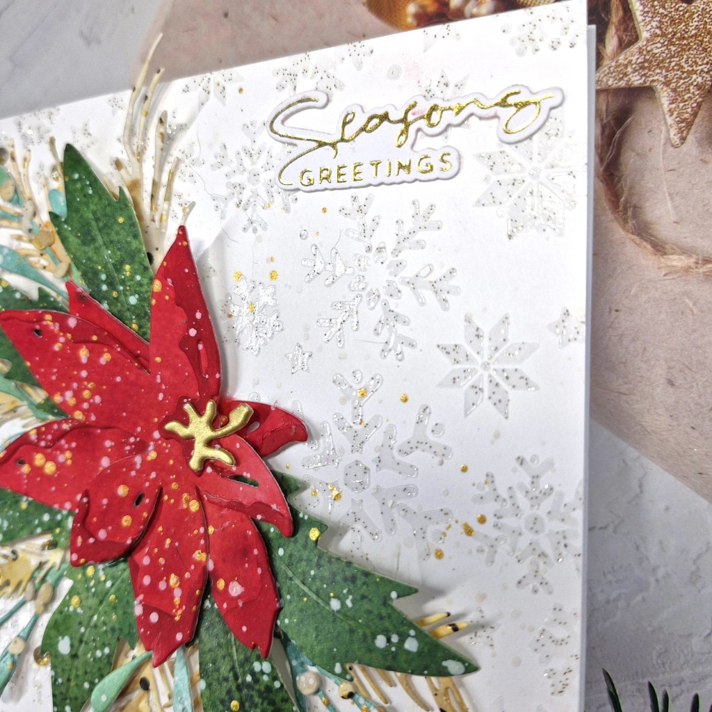 The background panel is a cover plate from Pinkfresh Studio called ‘Festive Grid’. I used a white A2 panel for this. The stars fall out of the cover plate, so behind them I used Pinkfresh Studio gold glitter card stock, then a thin 3D foam to adhere to a card base.