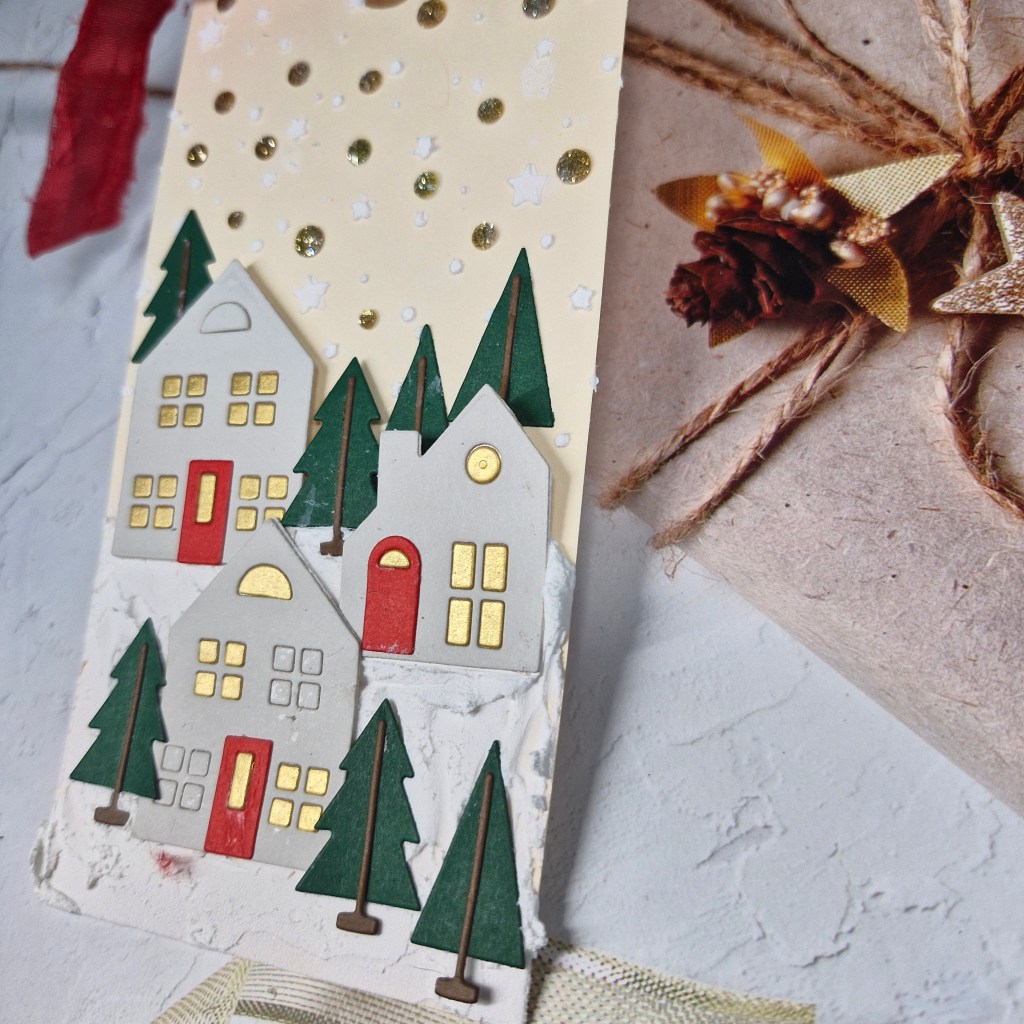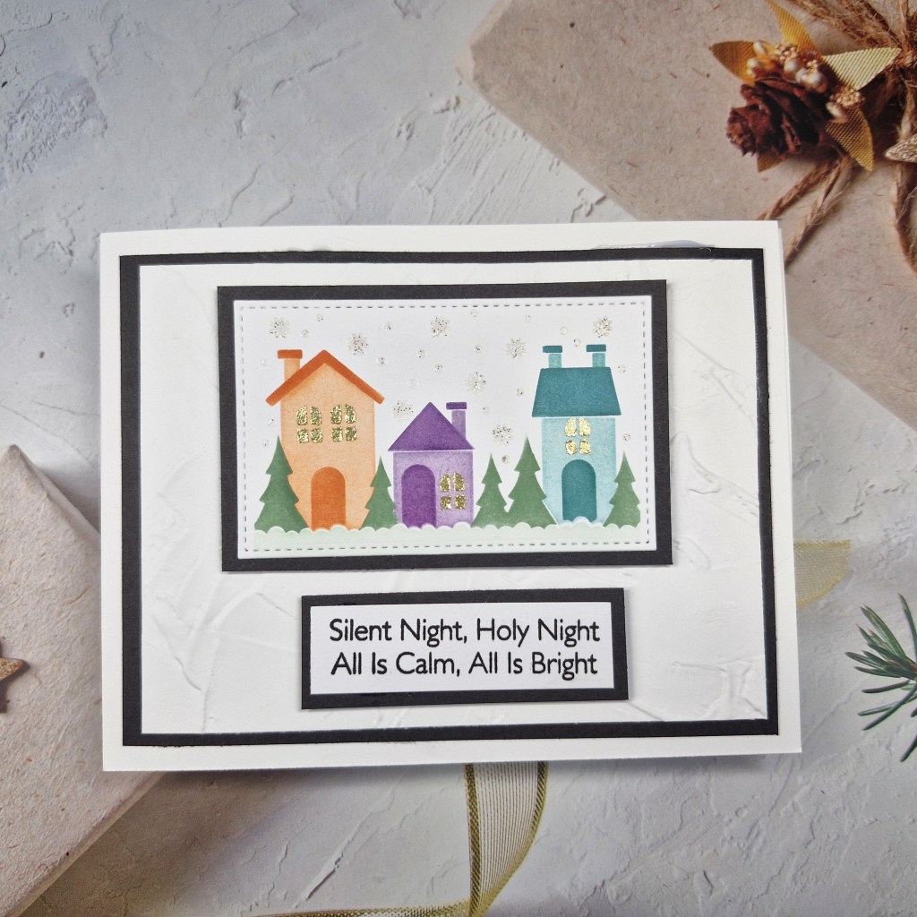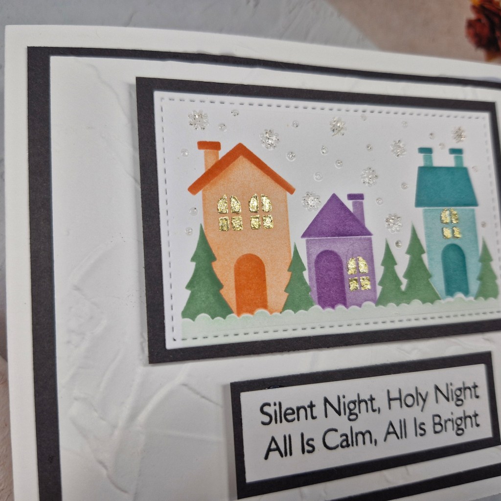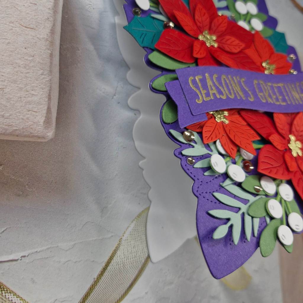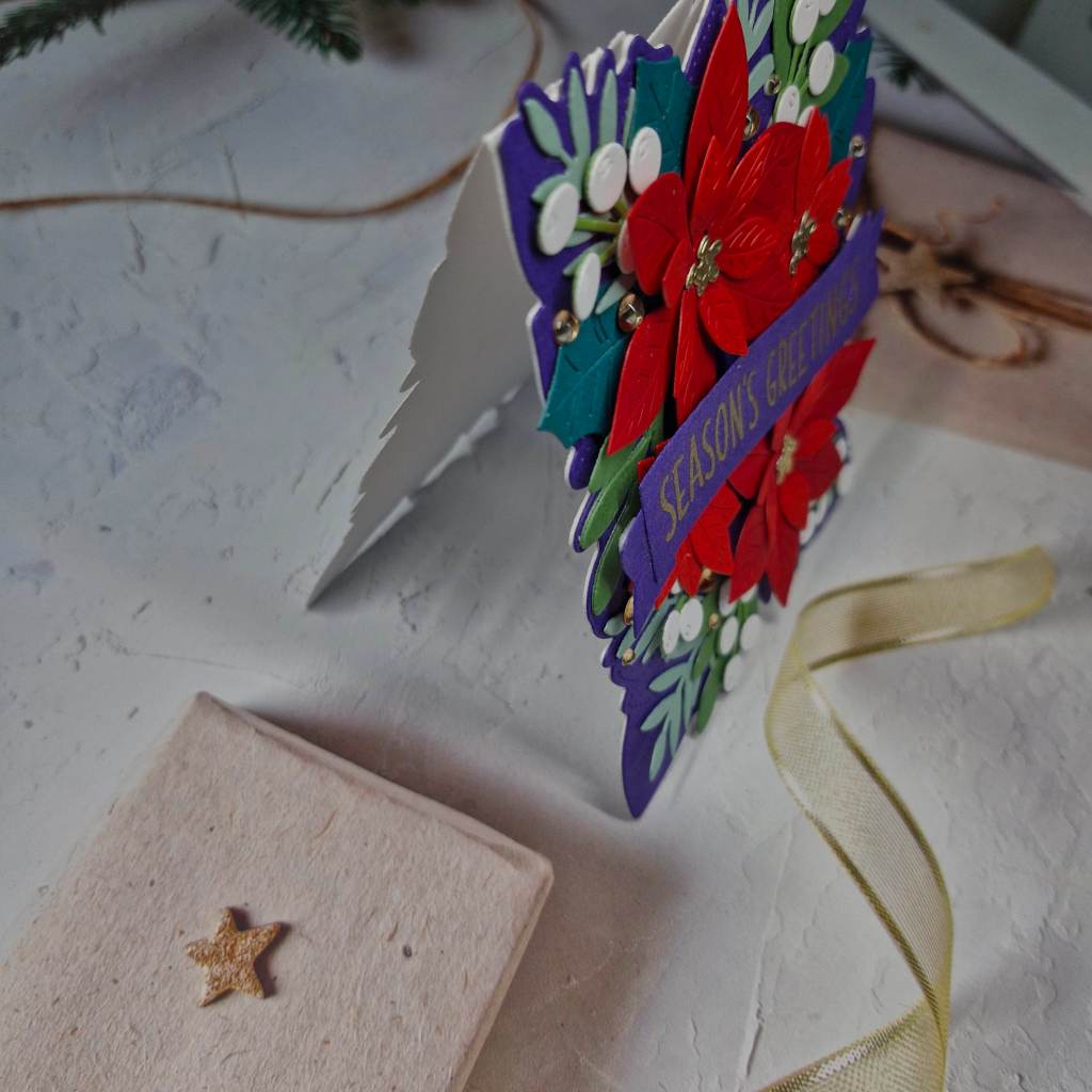 The background panel is a cover plate from Pinkfresh Studio called ‘Festive Grid’. I used a white A2 panel for this. The stars fall out of the cover plate, so behind them I used Pinkfresh Studio gold glitter card stock, then a thin 3D foam to adhere to a card base.