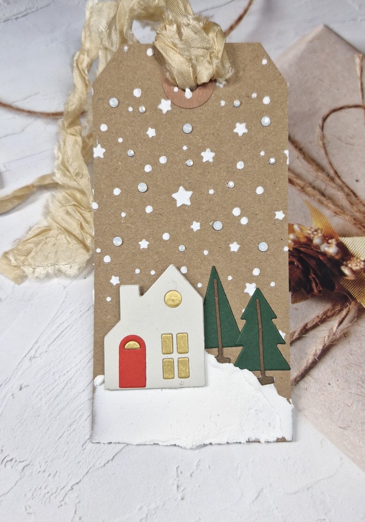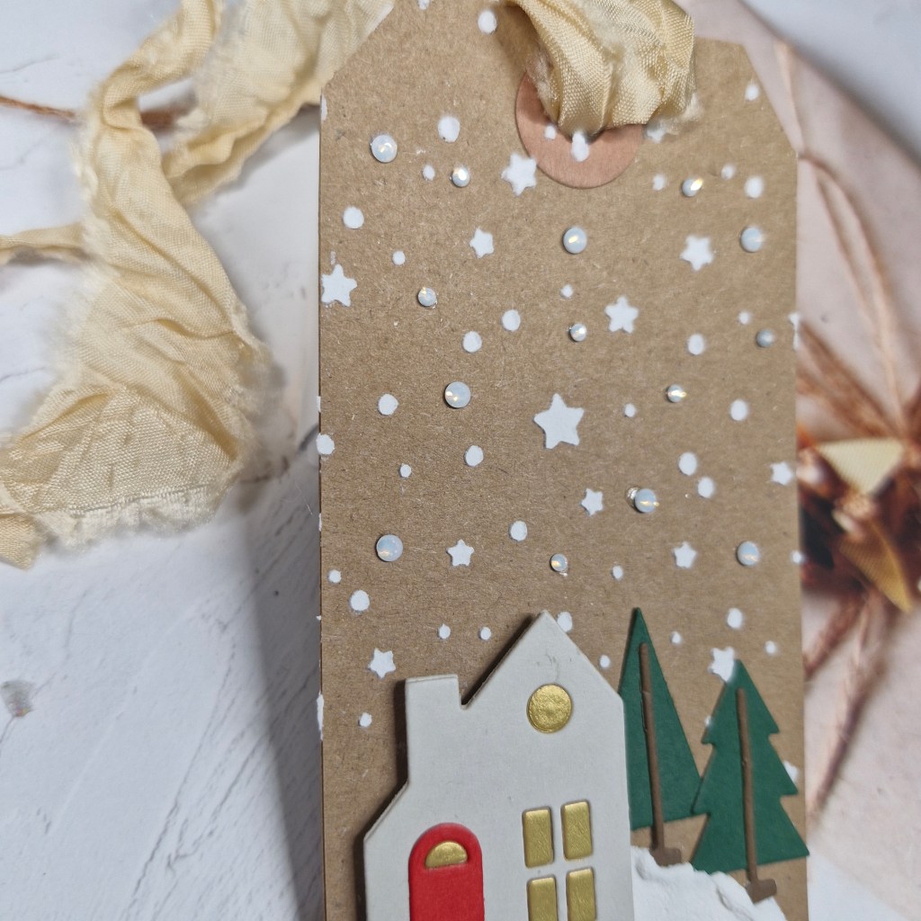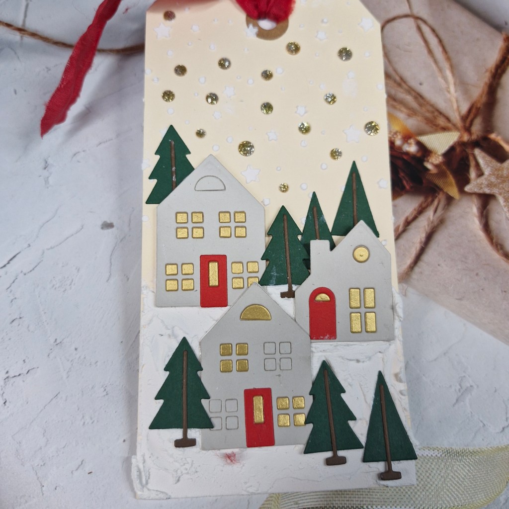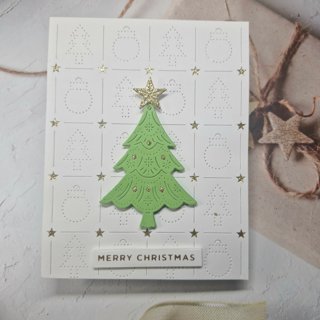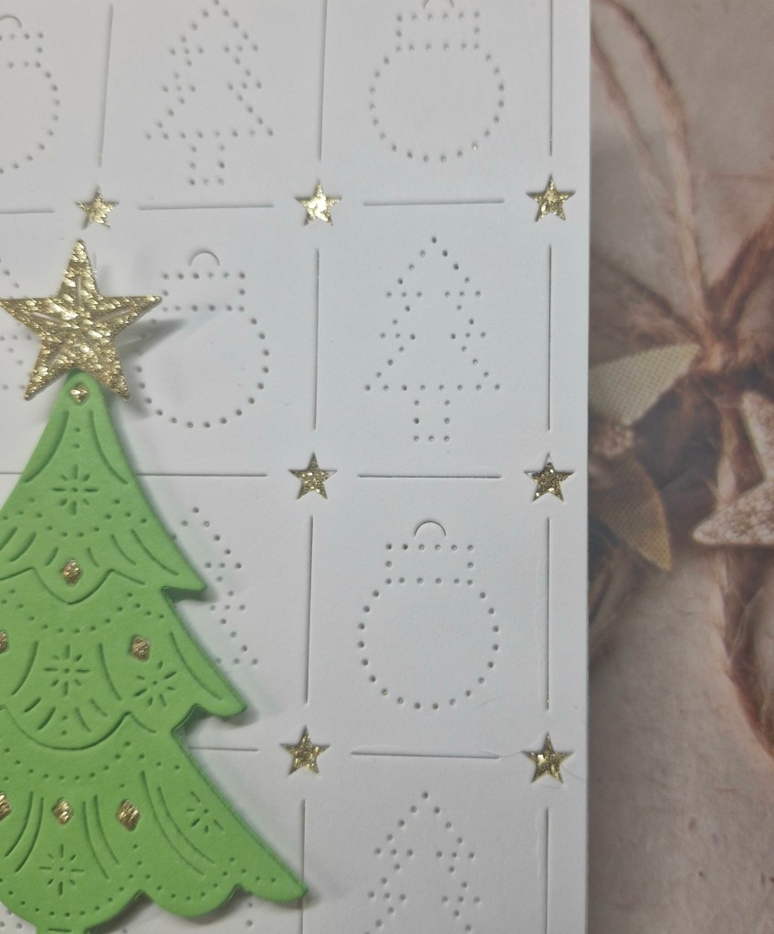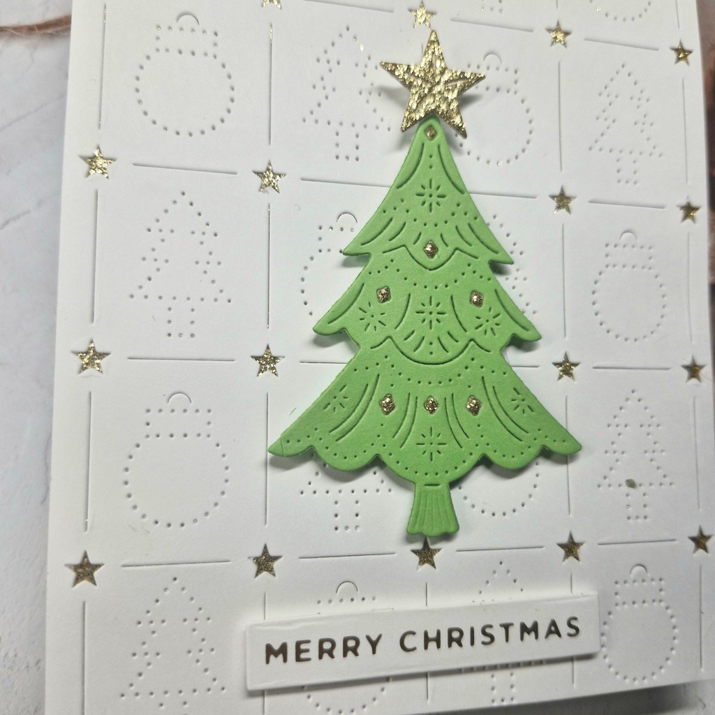 I then die cut the tree and stars. The tree is a freebie from ordering at The Greetery, and die cut using some Heffy Doodle card stock. As the little diamonds also fell out of the tree, I die cut it again using the gold glitter card stock and inlaid each of the little diamonds into the green tree. The star is also die cut form the same gold glitter card stock and adhered as you see.