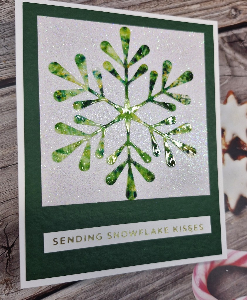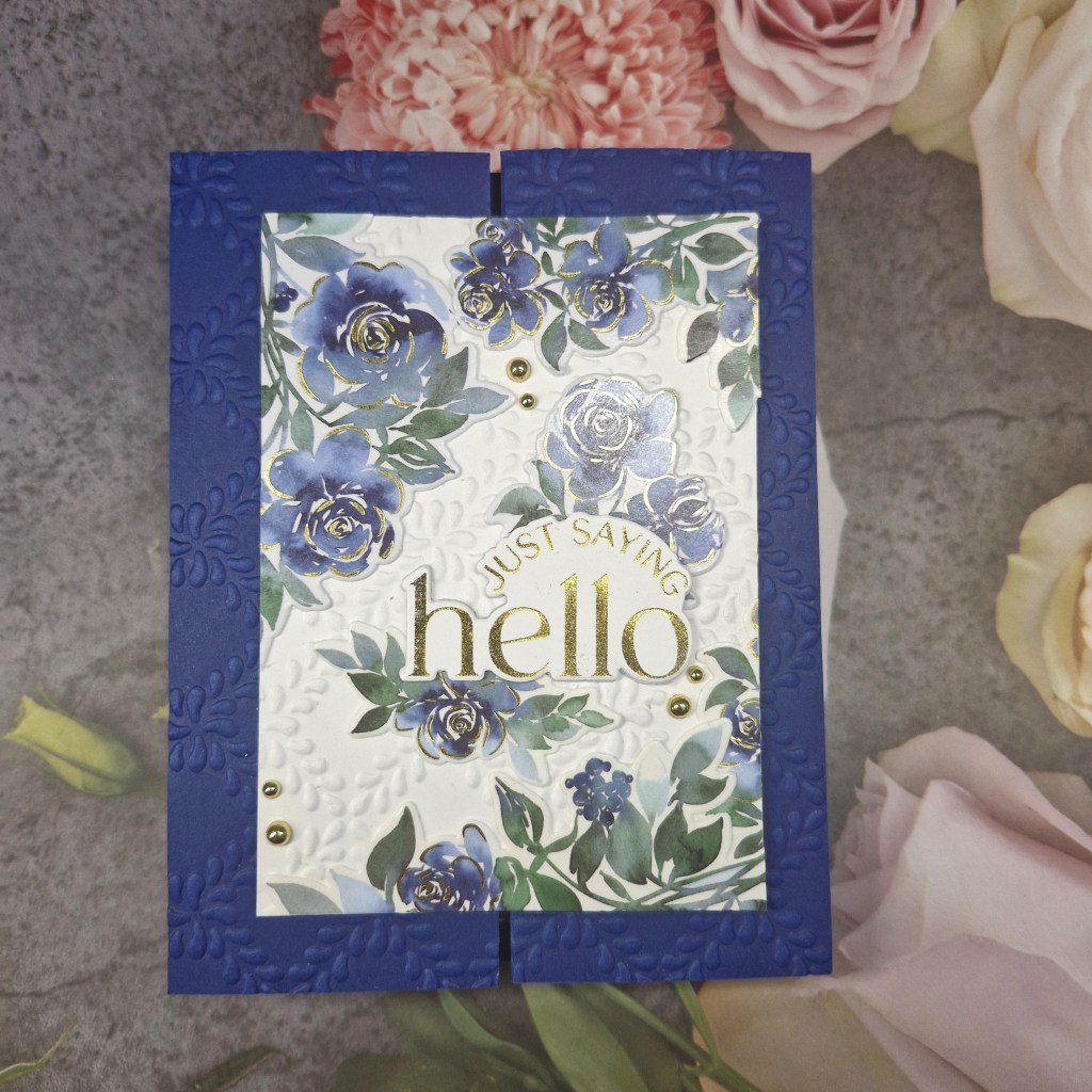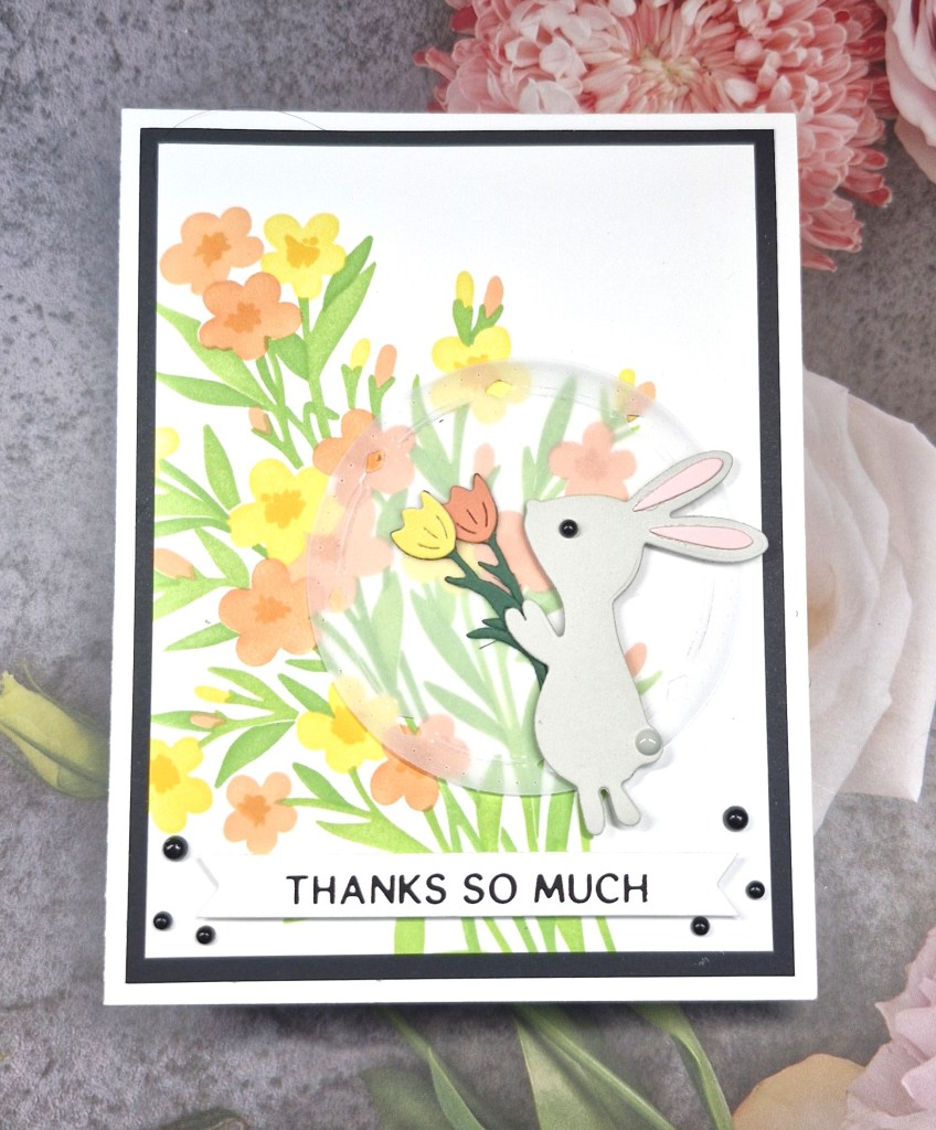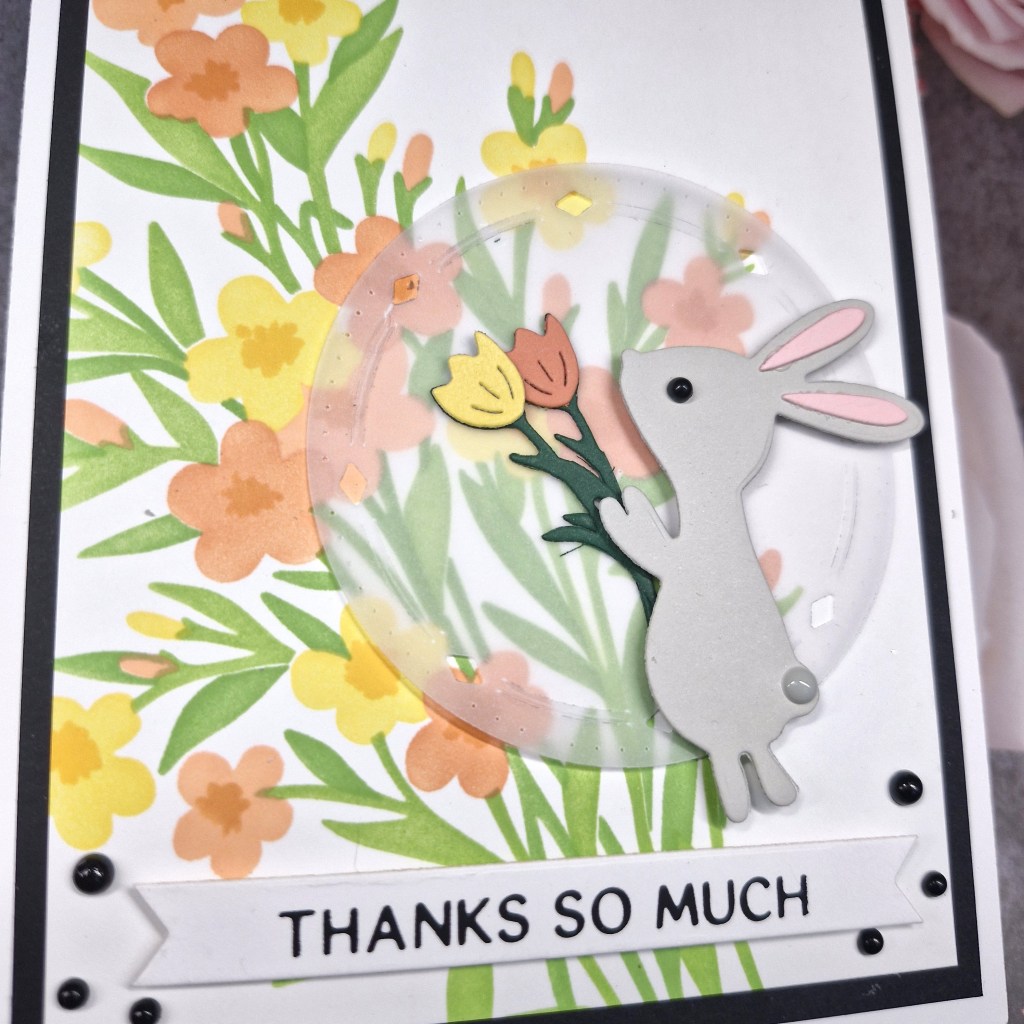 Once the frame was attached. I added the foiled sentiment strip at the bottom, then added the large flower with a few 3D foam pieces, and then arranged elements around and about.